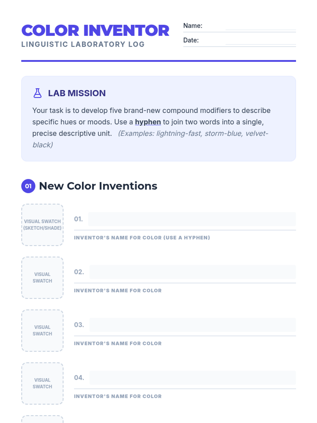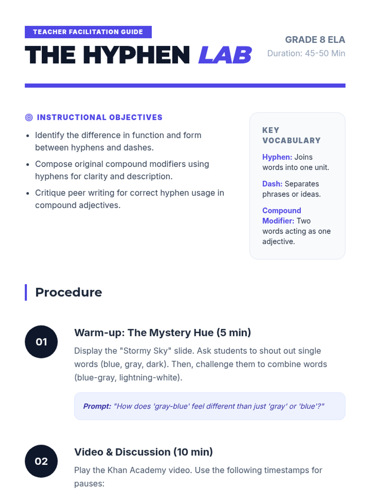 Students will explore the function of hyphens in compound modifiers, specifically focusing on descriptive adjectives and color naming. Through a video analysis and a creative writing activity, they will learn how to join words for clarity and enhanced imagery.