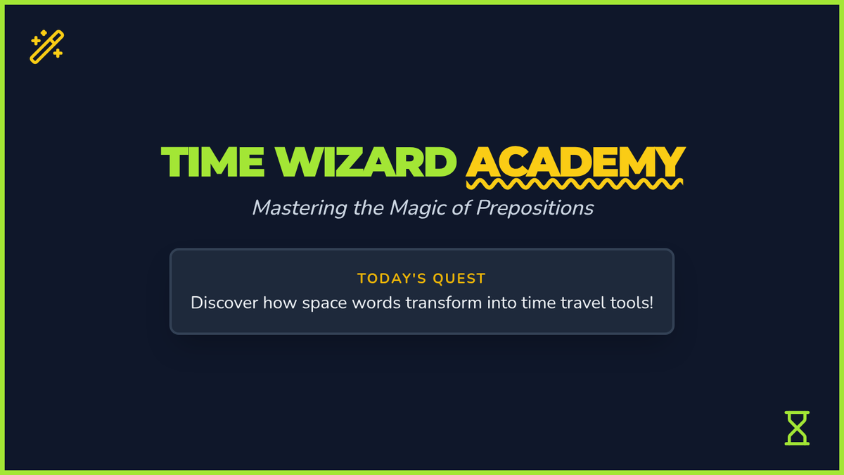 A grammar lesson exploring the metaphorical link between physical space and time through prepositions, inspired by the 'Time Wizard' concept.