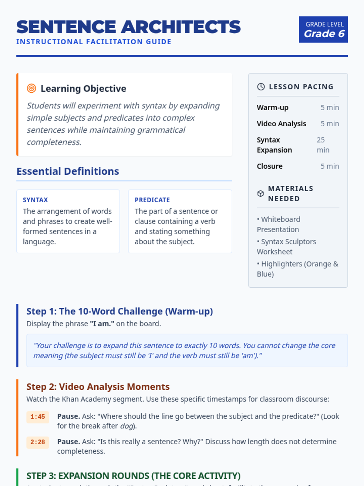 Students explore syntax by expanding simple subjects and predicates into complex sentences, using a 'building box' metaphor inspired by Khan Academy. The lesson includes a presentation for the whiteboard, a hands-on expansion worksheet, and a teacher's guide for facilitating the expansion rounds.