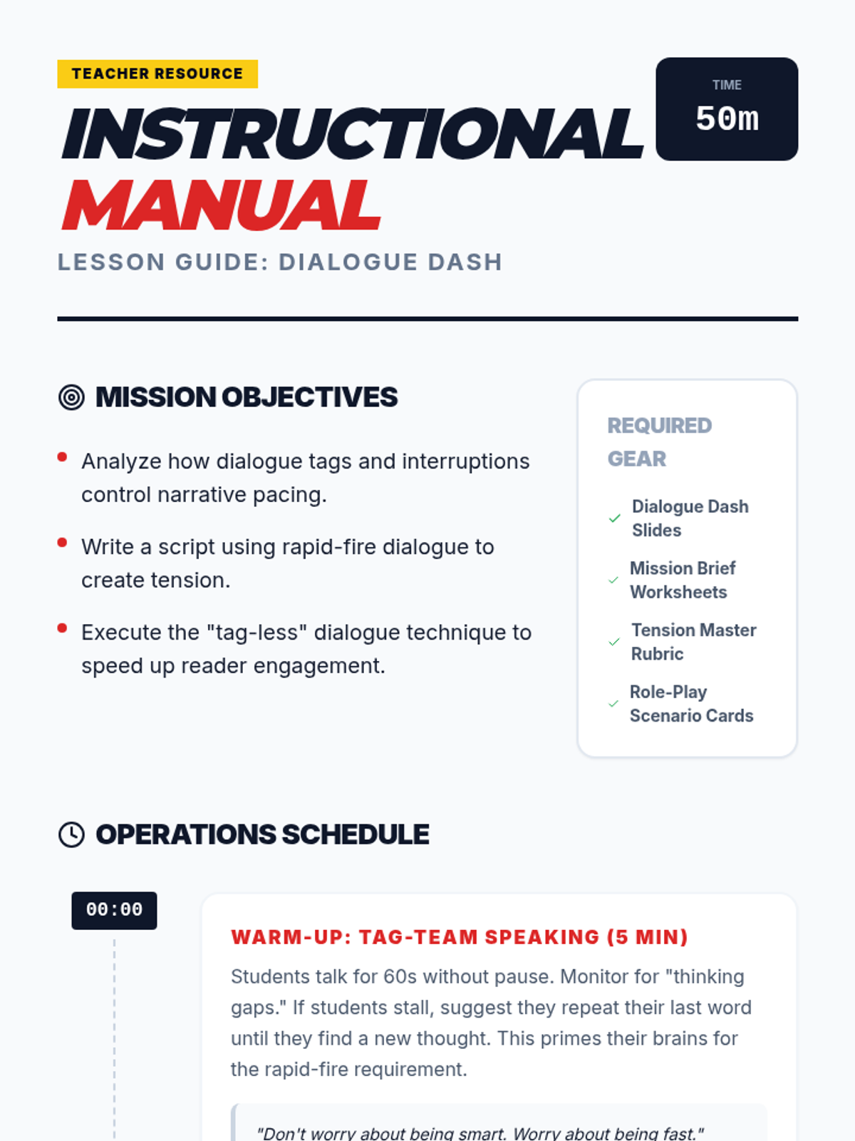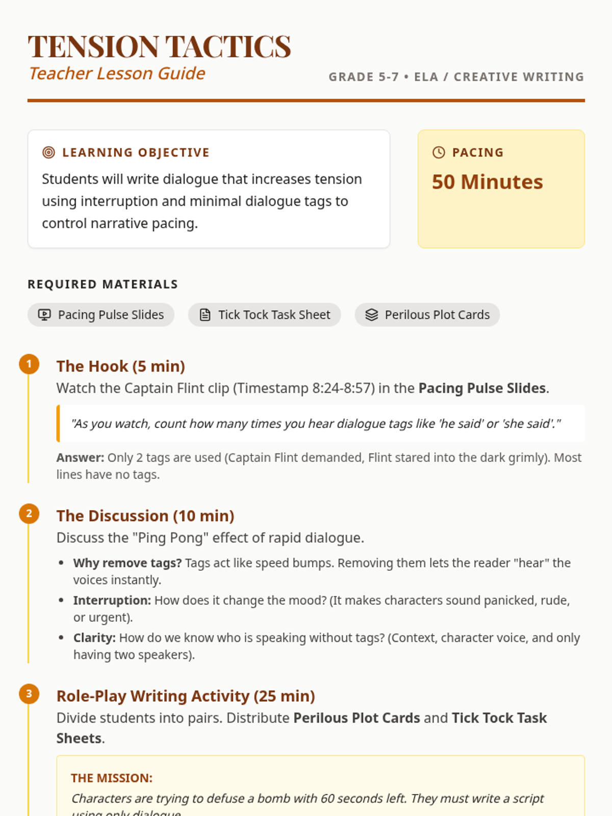 Students explore how to use rapid-fire dialogue, interruptions, and the removal of dialogue tags to create a sense of urgency and tension in adventure writing. The lesson culminates in a high-stakes role-play writing activity focused on a bomb-defusal scenario.