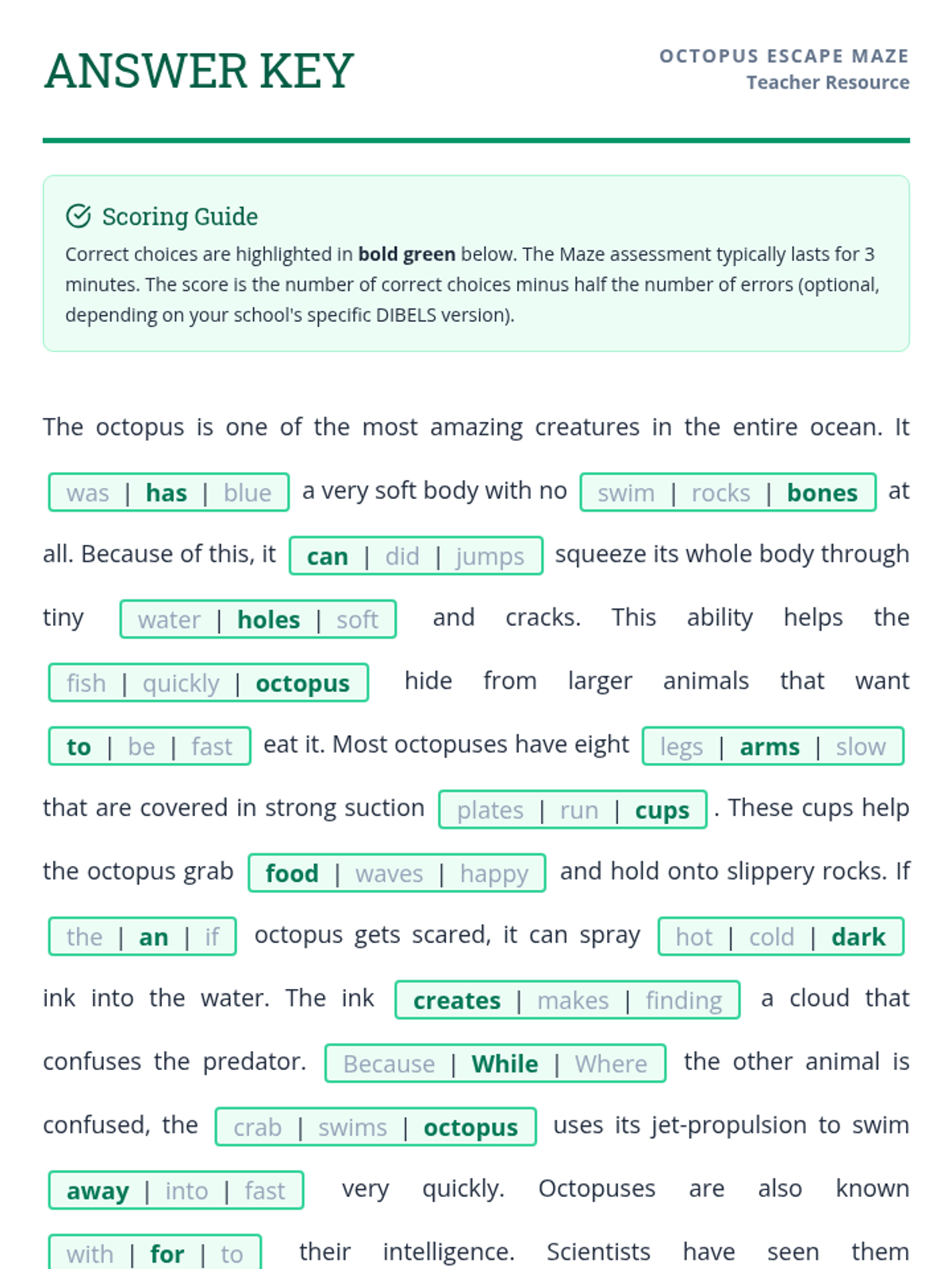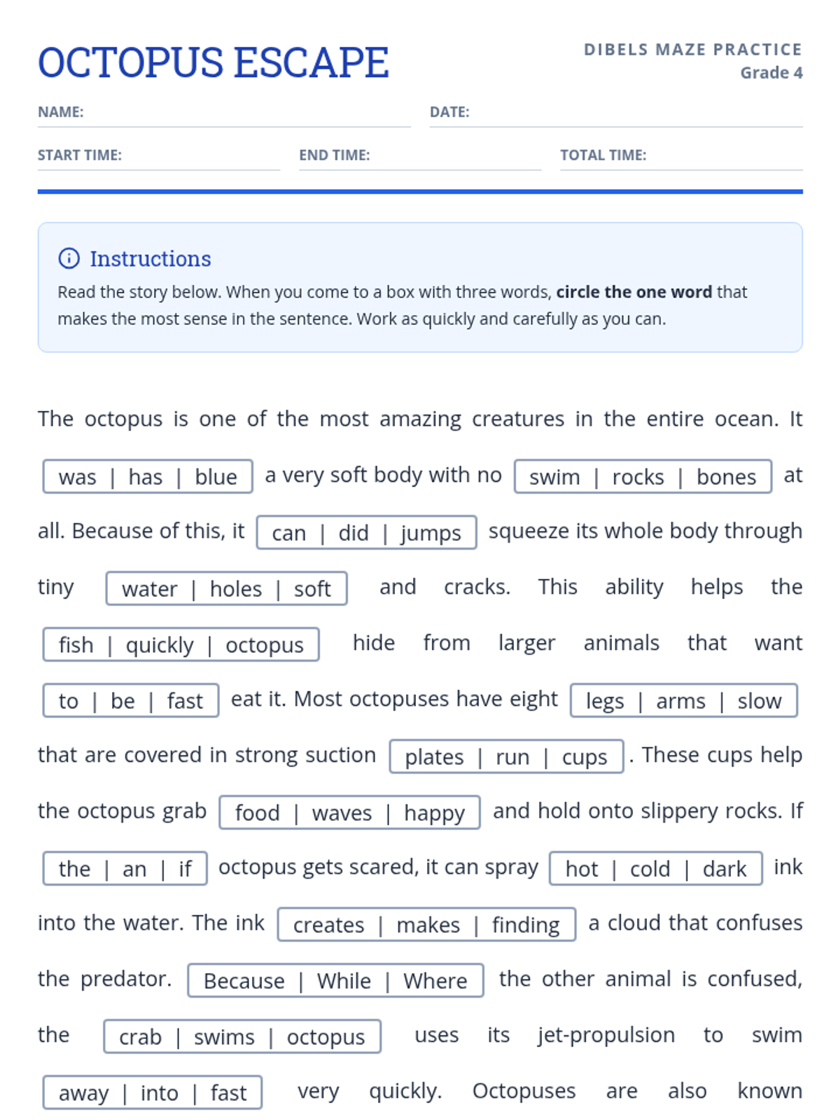 A 4th-grade reading comprehension practice focusing on the DIBELS Maze format, featuring an engaging passage about the remarkable intelligence and physical abilities of octopuses.