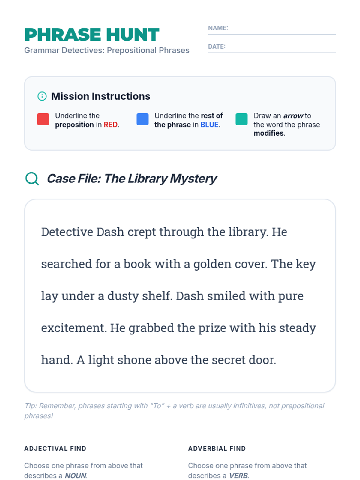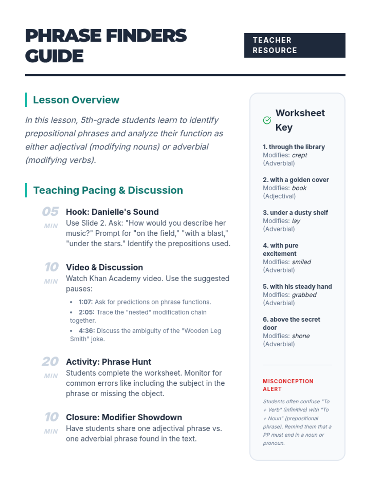 A 6th-grade grammar lesson where students distinguish between adjectival and adverbial prepositional phrases through architectural sentence analysis, video observation, and a kinetic sorting activity.
