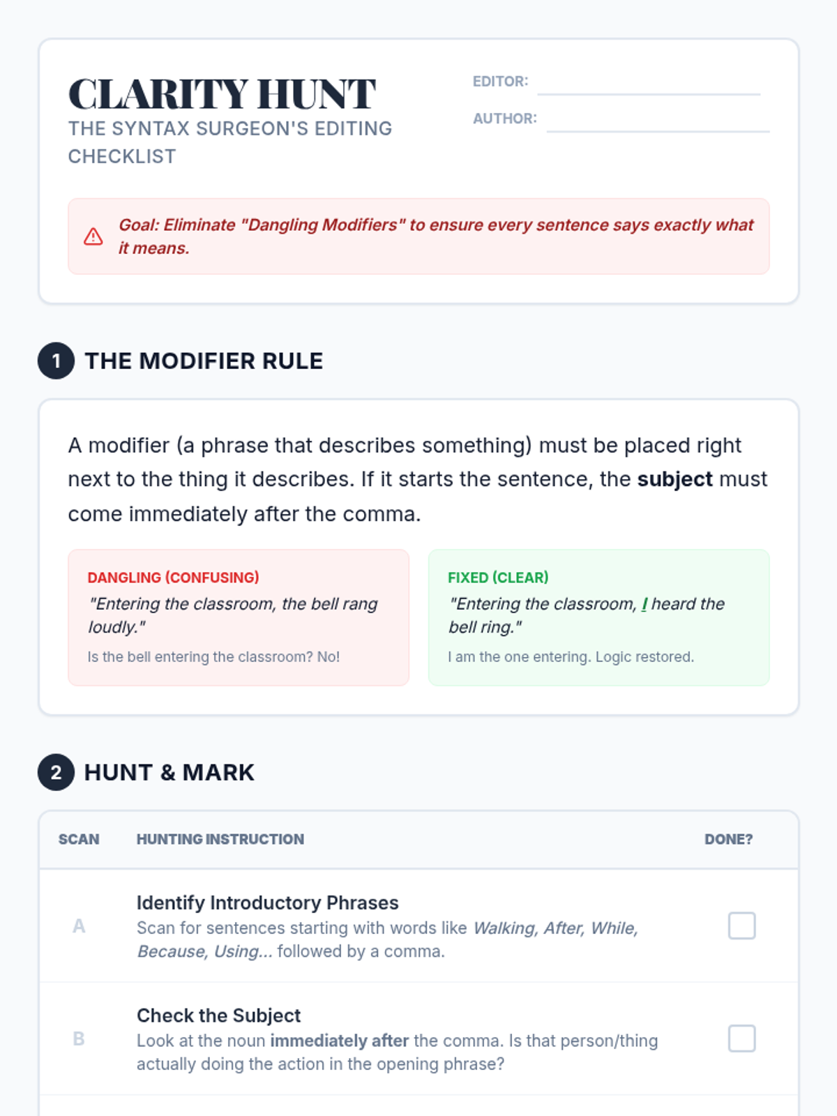 Identify and repair dangling and misplaced modifiers in complex structures to ensure clarity and logical consistency.