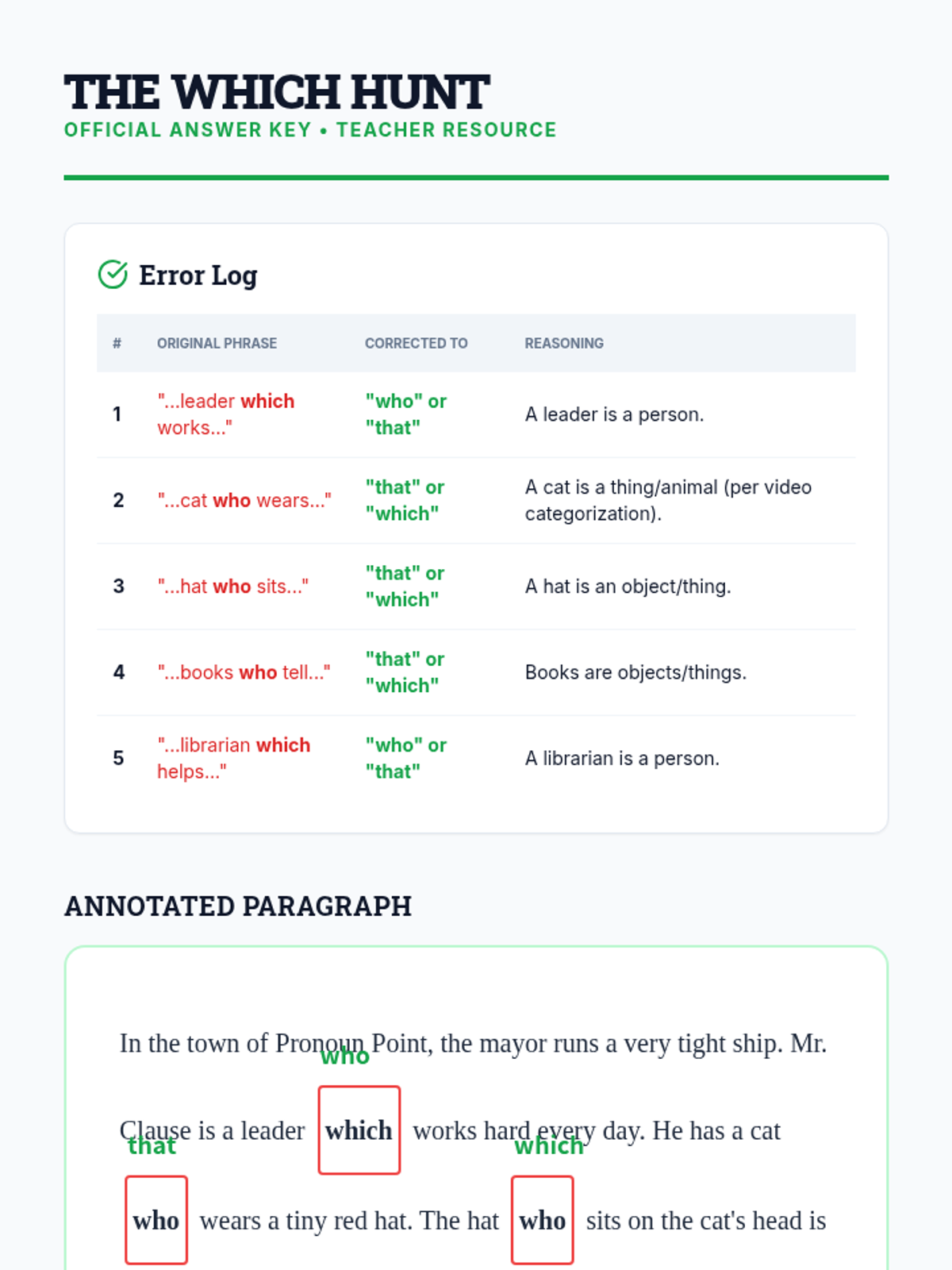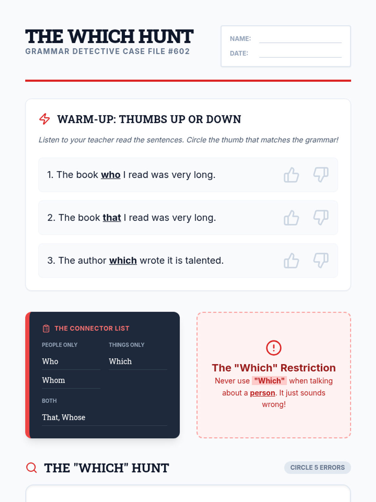 A grammar lesson for 6th graders focusing on relative pronouns (who, whom, whose, that, which) and the specific restriction of 'which' to non-human subjects.