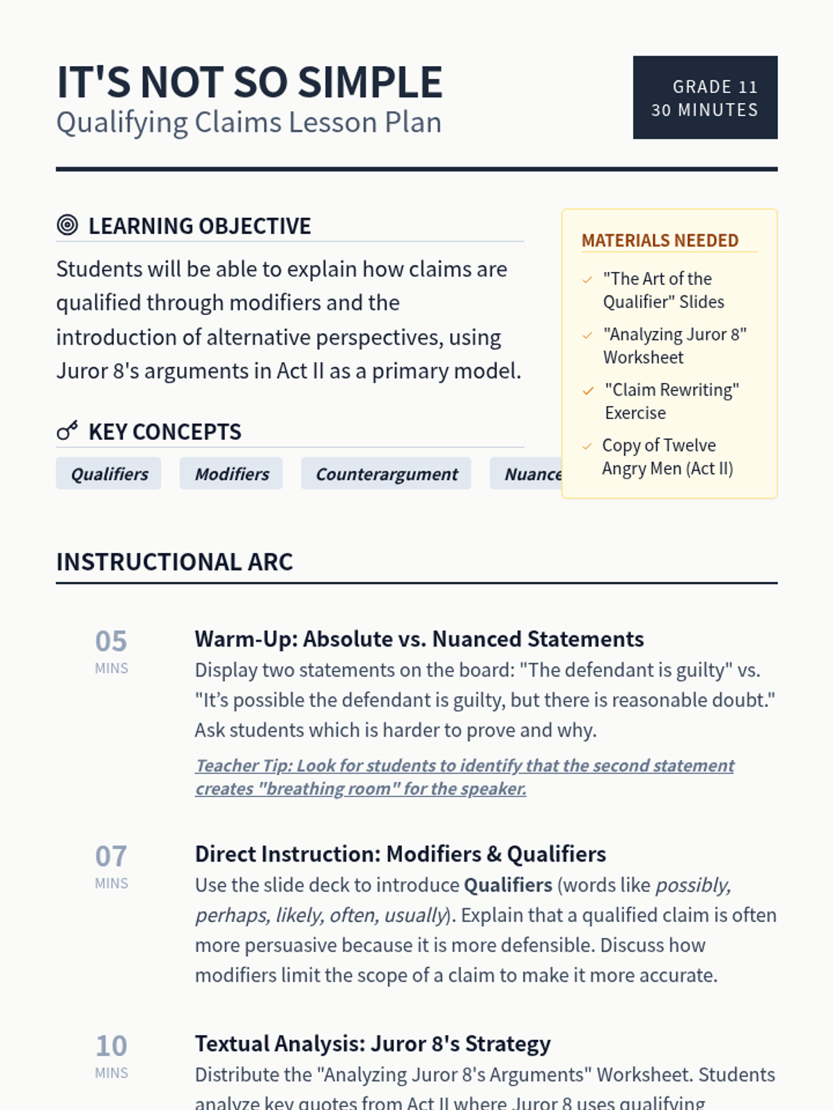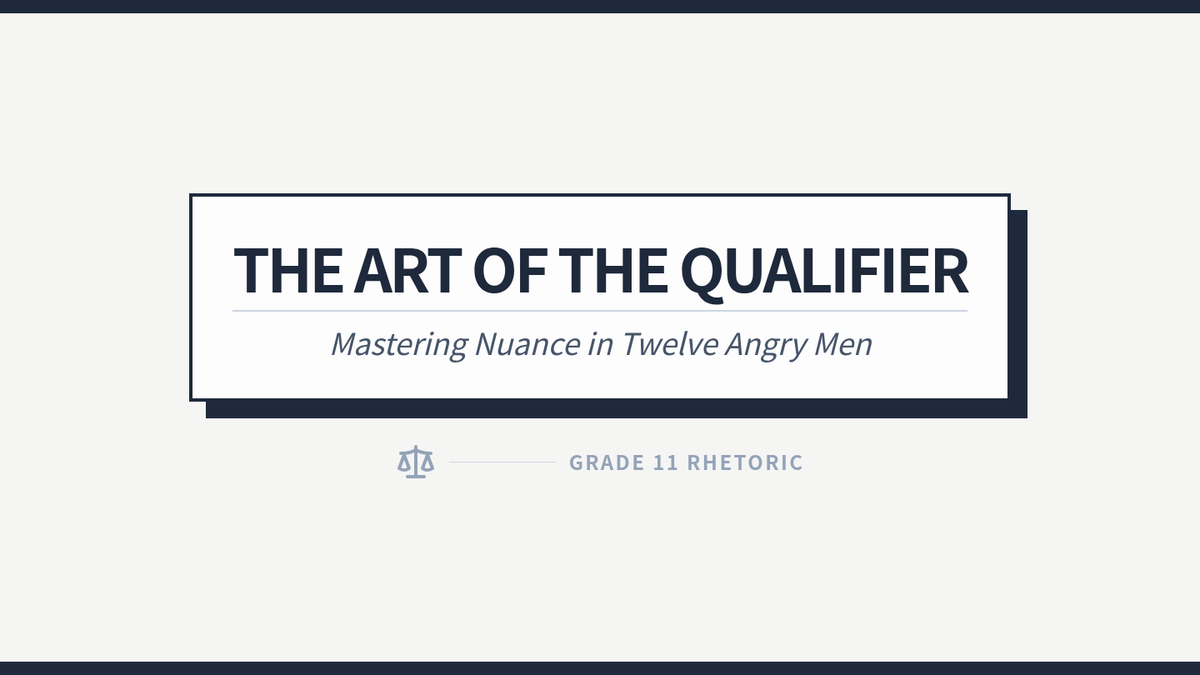 A 30-minute lesson focused on the rhetorical strategy of qualifying claims using modifiers and counter-perspectives, specifically analyzing Juror 8's arguments in Act II of Twelve Angry Men.