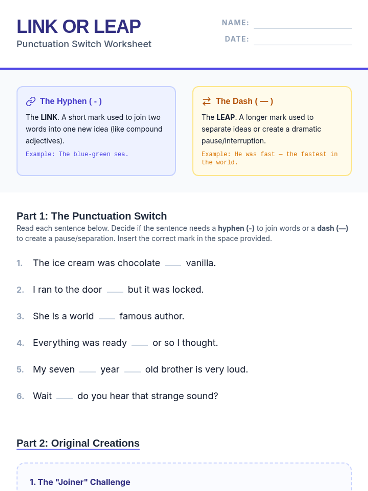 A 6th-grade grammar lesson focusing on the functional difference between hyphens (joining) and dashes (separating). Students use a Khan Academy video to visualize the 'little stick' vs. 'big stick' and practice through the 'Punctuation Switch' activity.