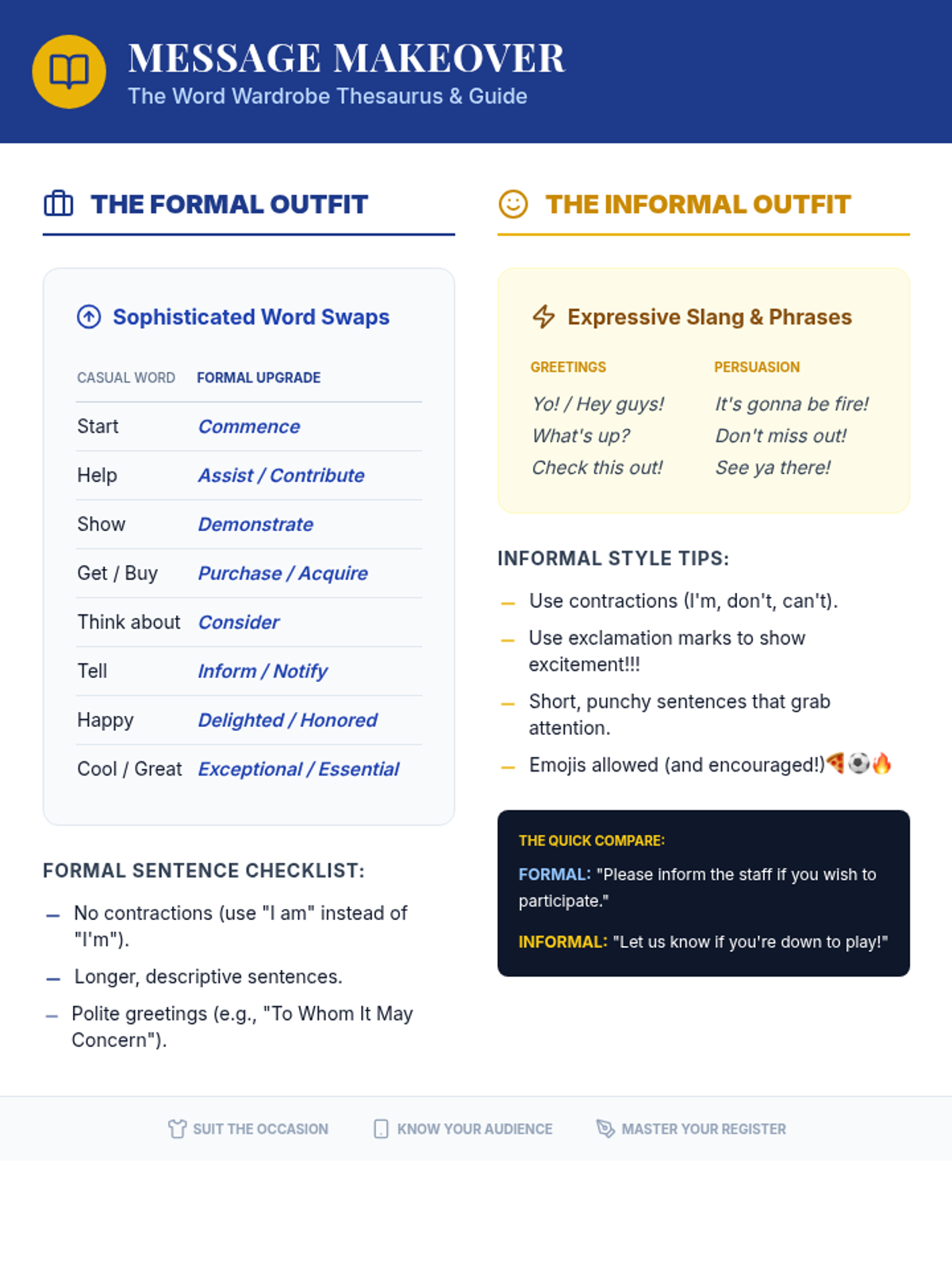 A lesson where students learn to adjust their linguistic register between formal and informal styles, using the metaphor of a 'word wardrobe' to dress up or dress down their communication for different audiences.
