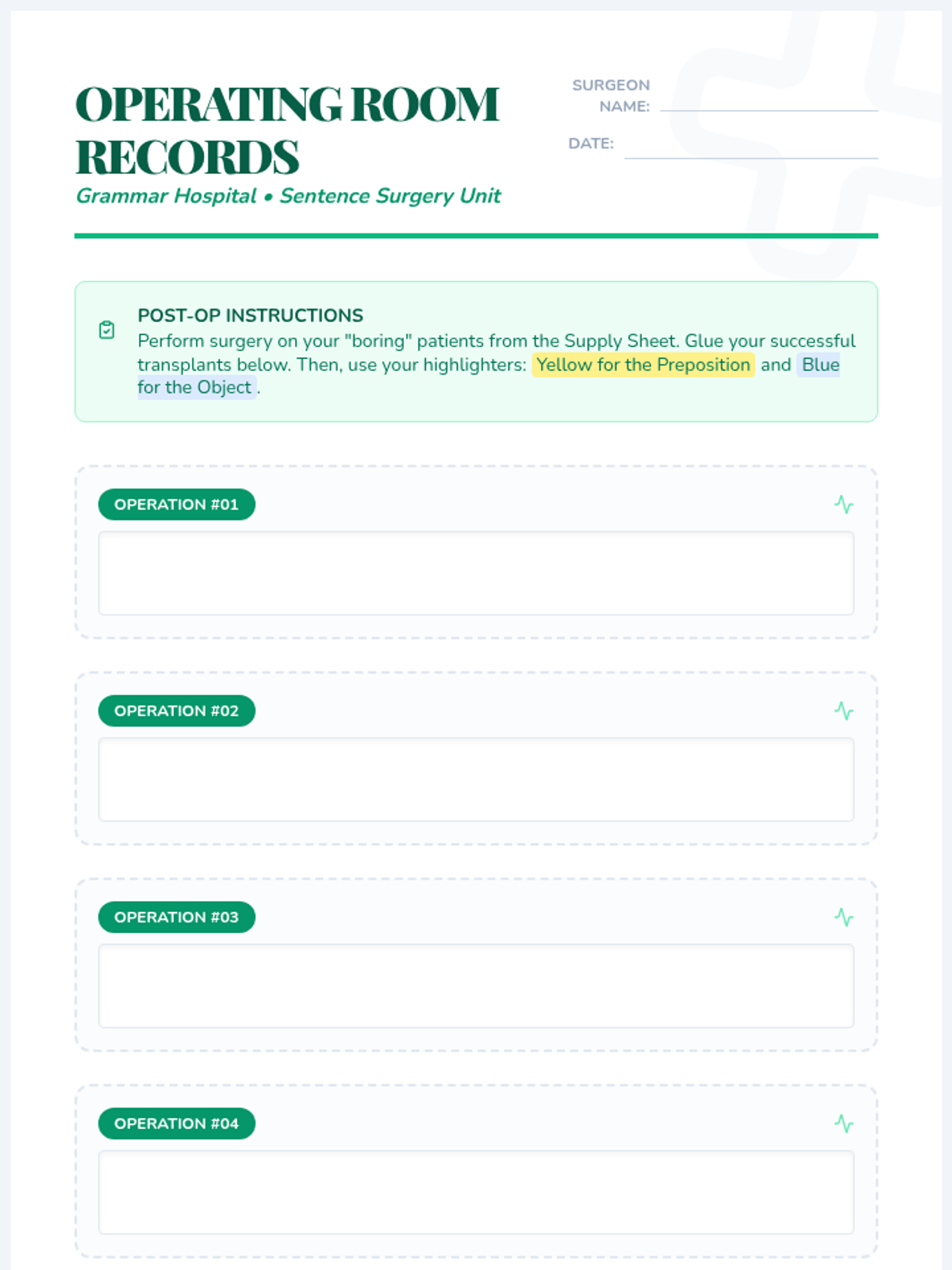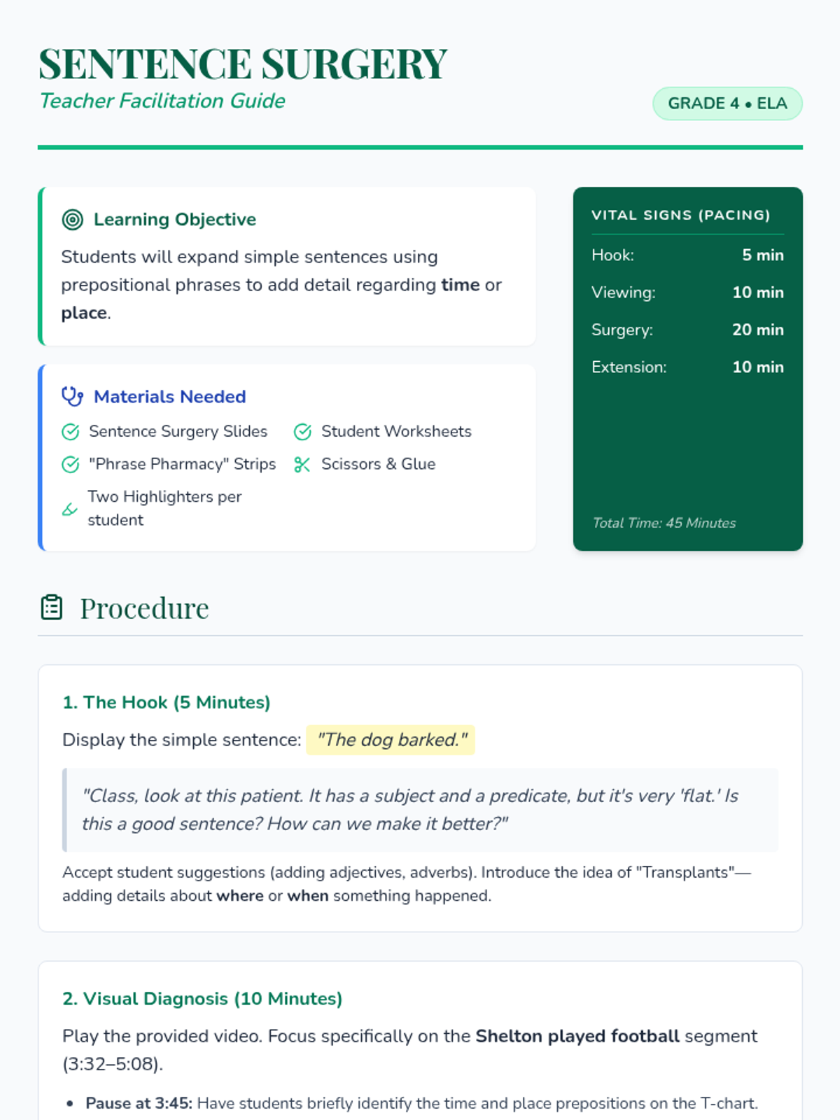Students will learn to enhance 'boring' simple sentences by performing 'surgery'—inserting prepositional phrases that add vital details about time and place. This medical-themed lesson uses video-guided practice and a hands-on activity to make grammar concrete.