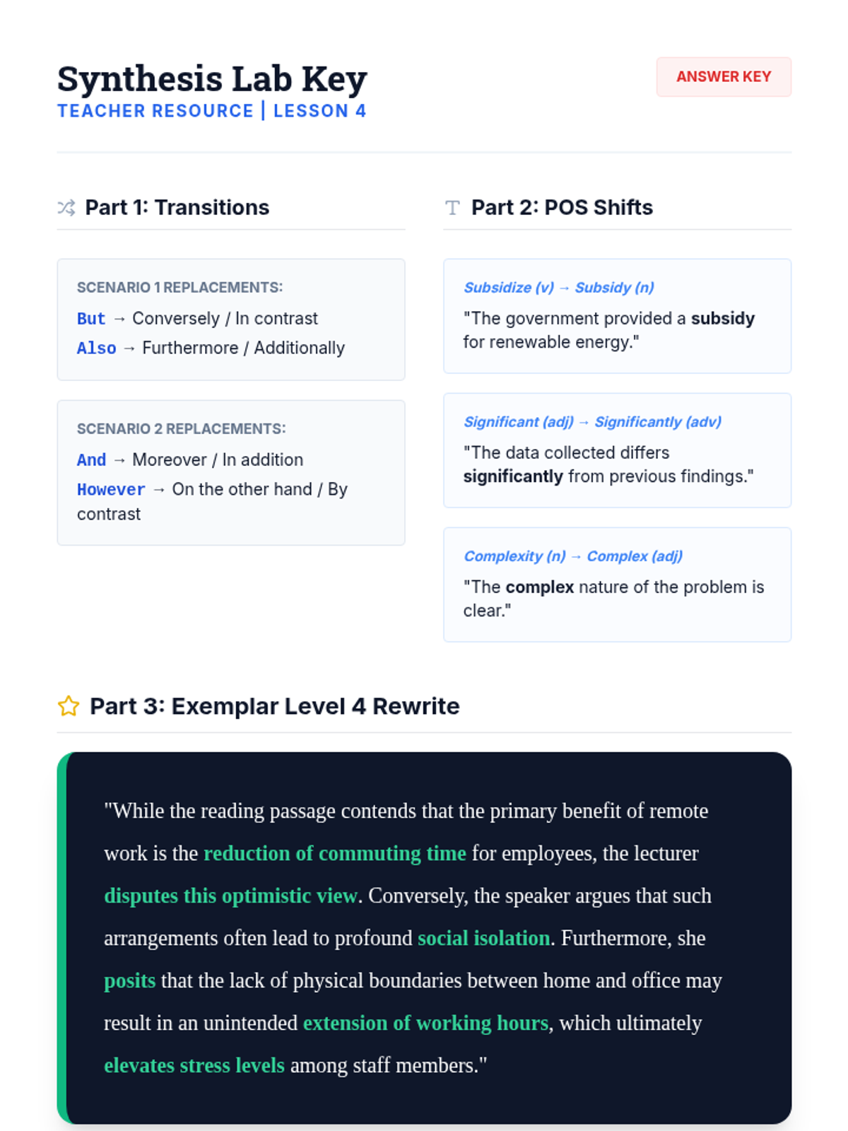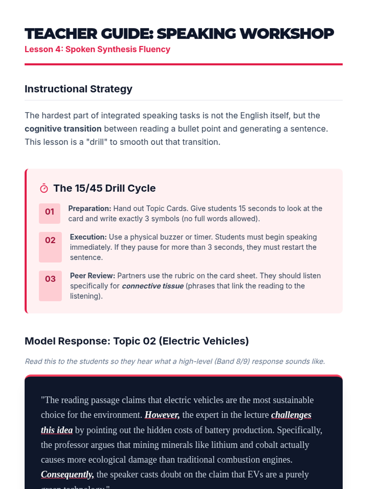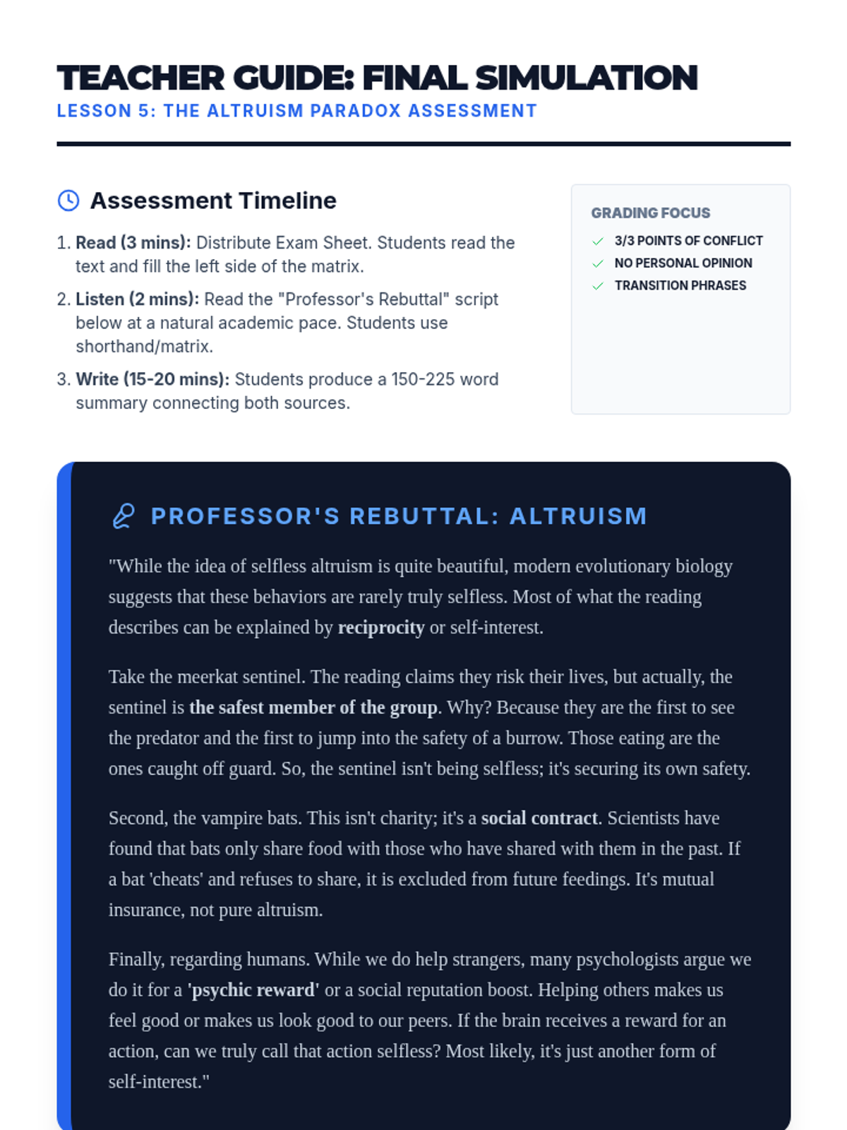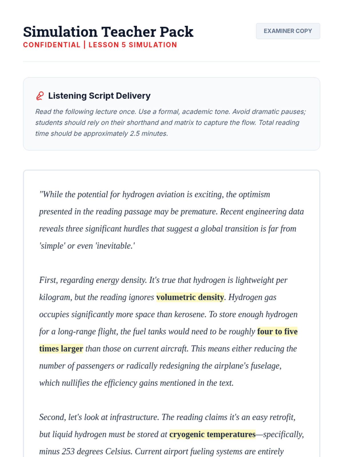 A full-scale simulation of a TOEFL/IELTS integrated task. Students apply shorthand, signpost recognition, and synthesis skills to a new topic, producing a comprehensive written response.