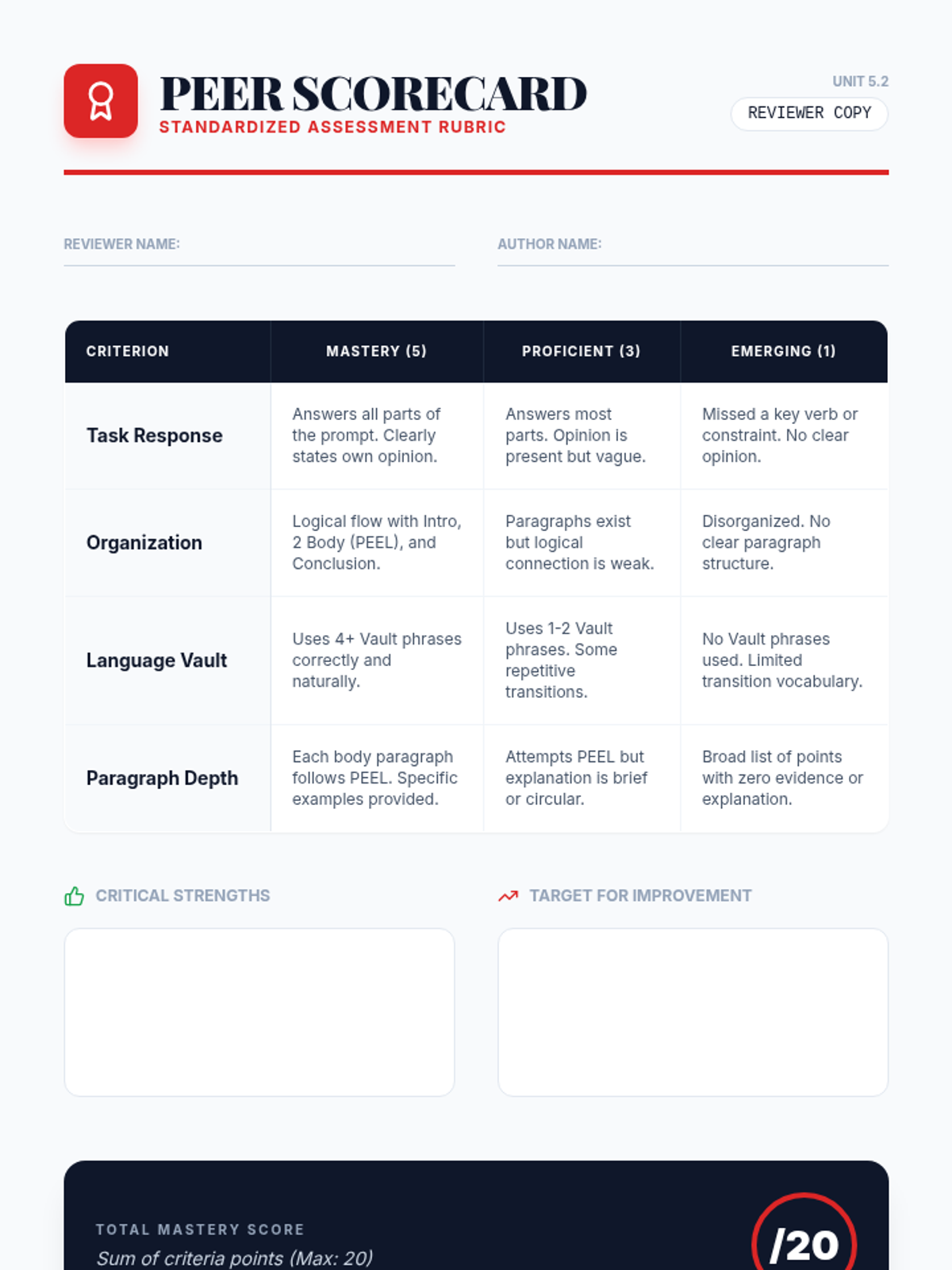 The culmination of the sequence where students complete a full-length timed essay simulation and peer-evaluate their work using standardized rubrics.
