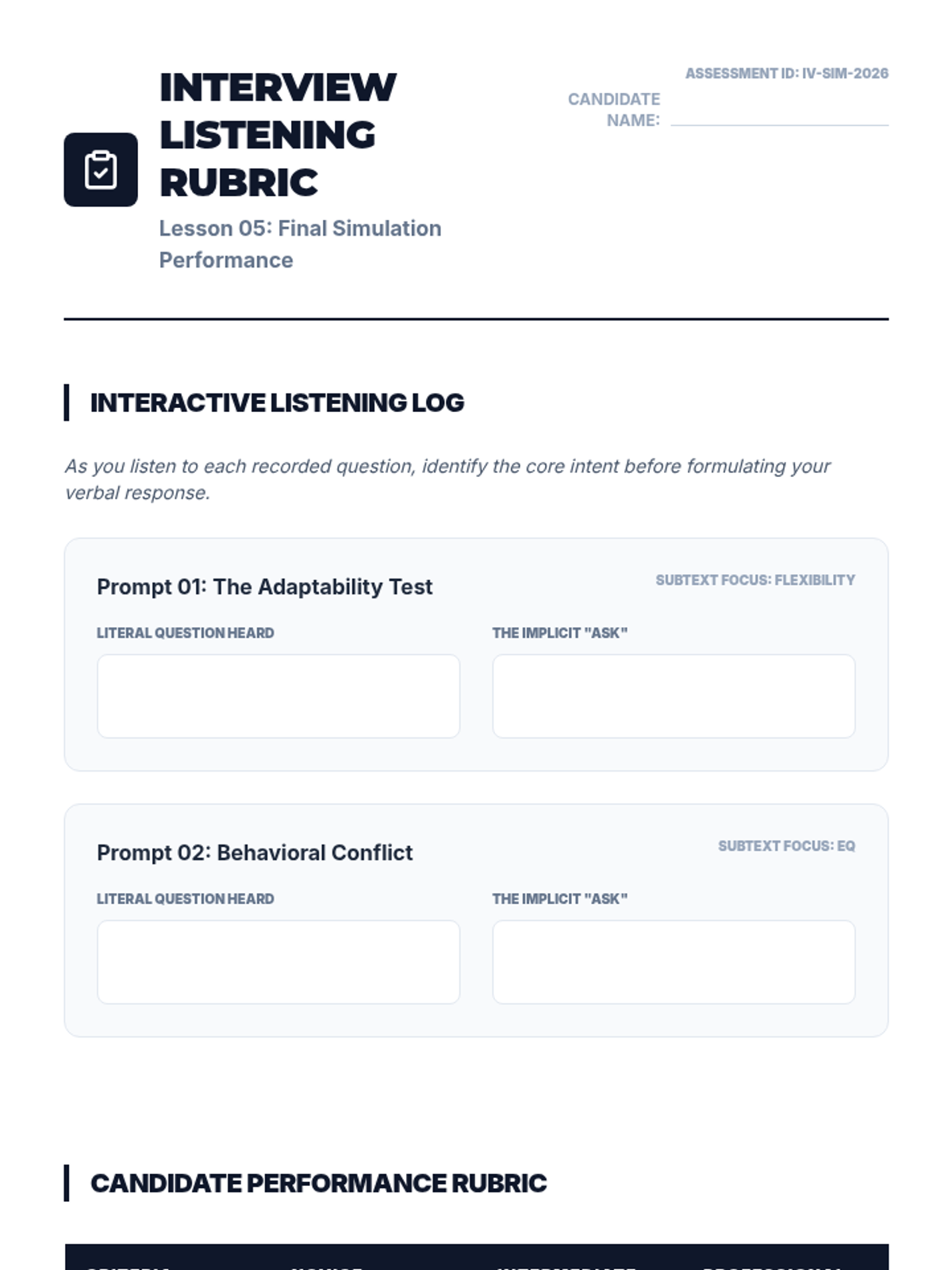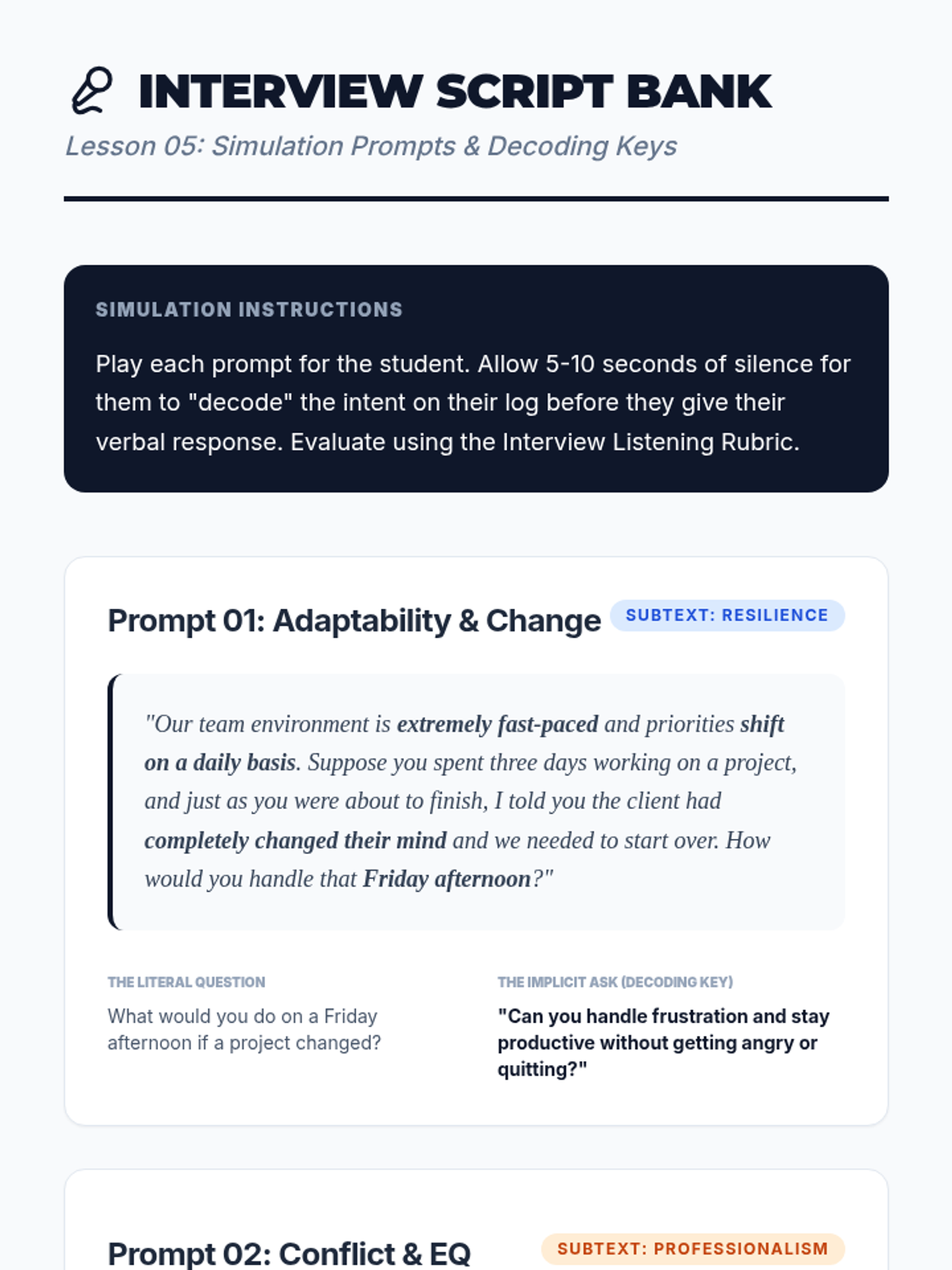 Students apply listening skills to interpret complex interview questions and behavioral prompts.
