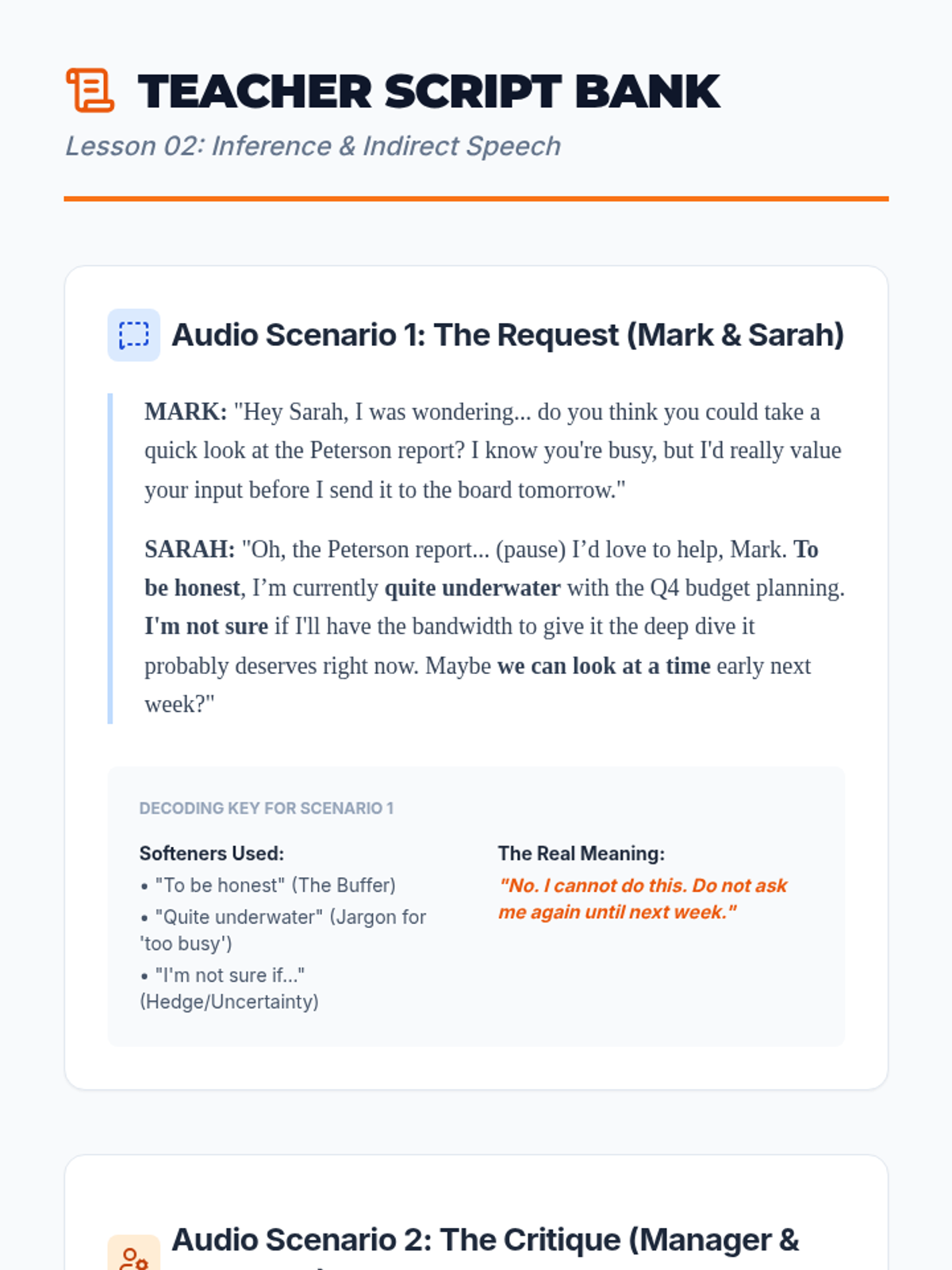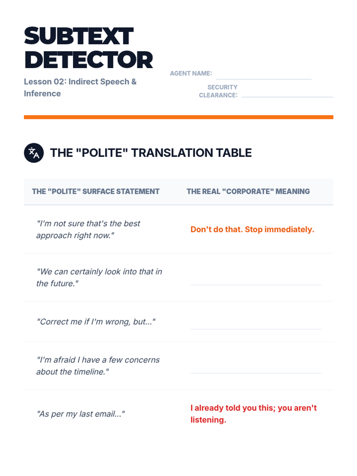 Learners decode indirect language and 'polite' workplace communication to find the underlying message.
