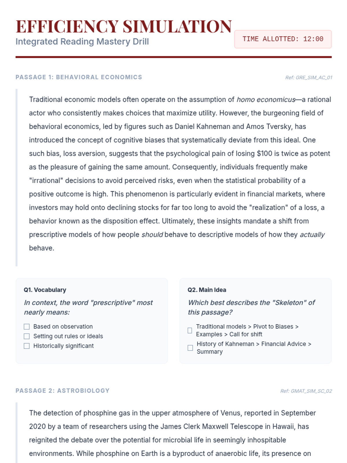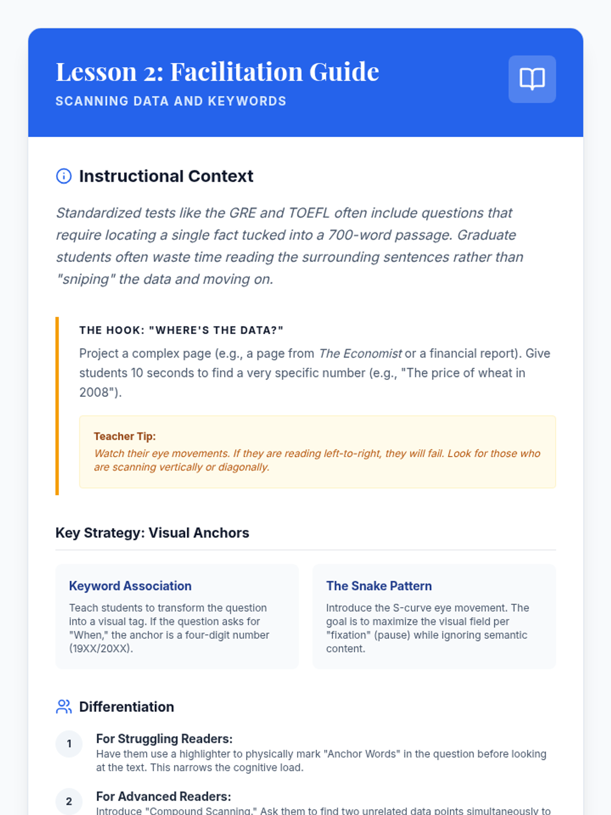 Students practice identifying the 'skeleton' of academic passages by focusing on structural markers and argumentative arcs to speed up comprehension.