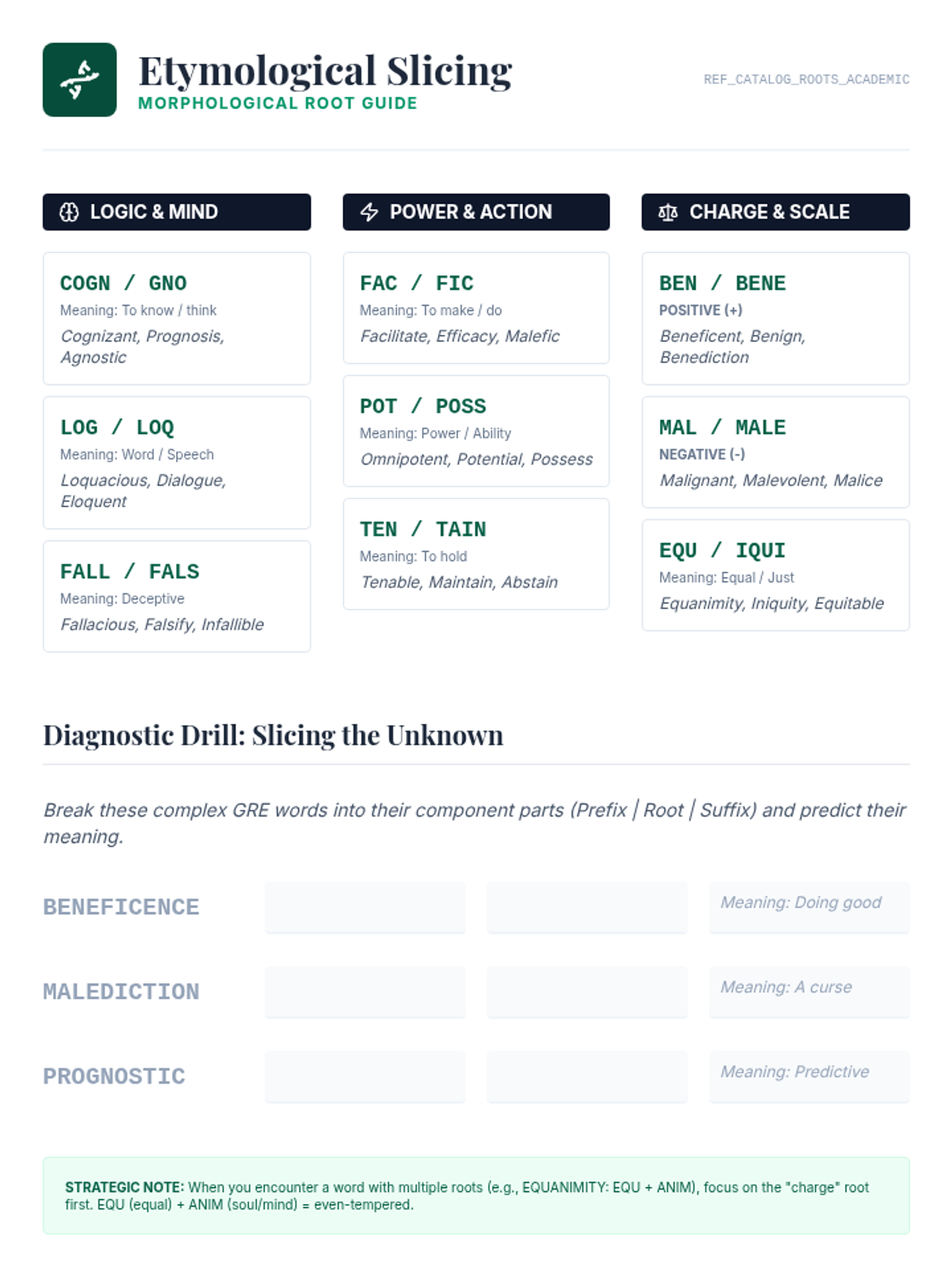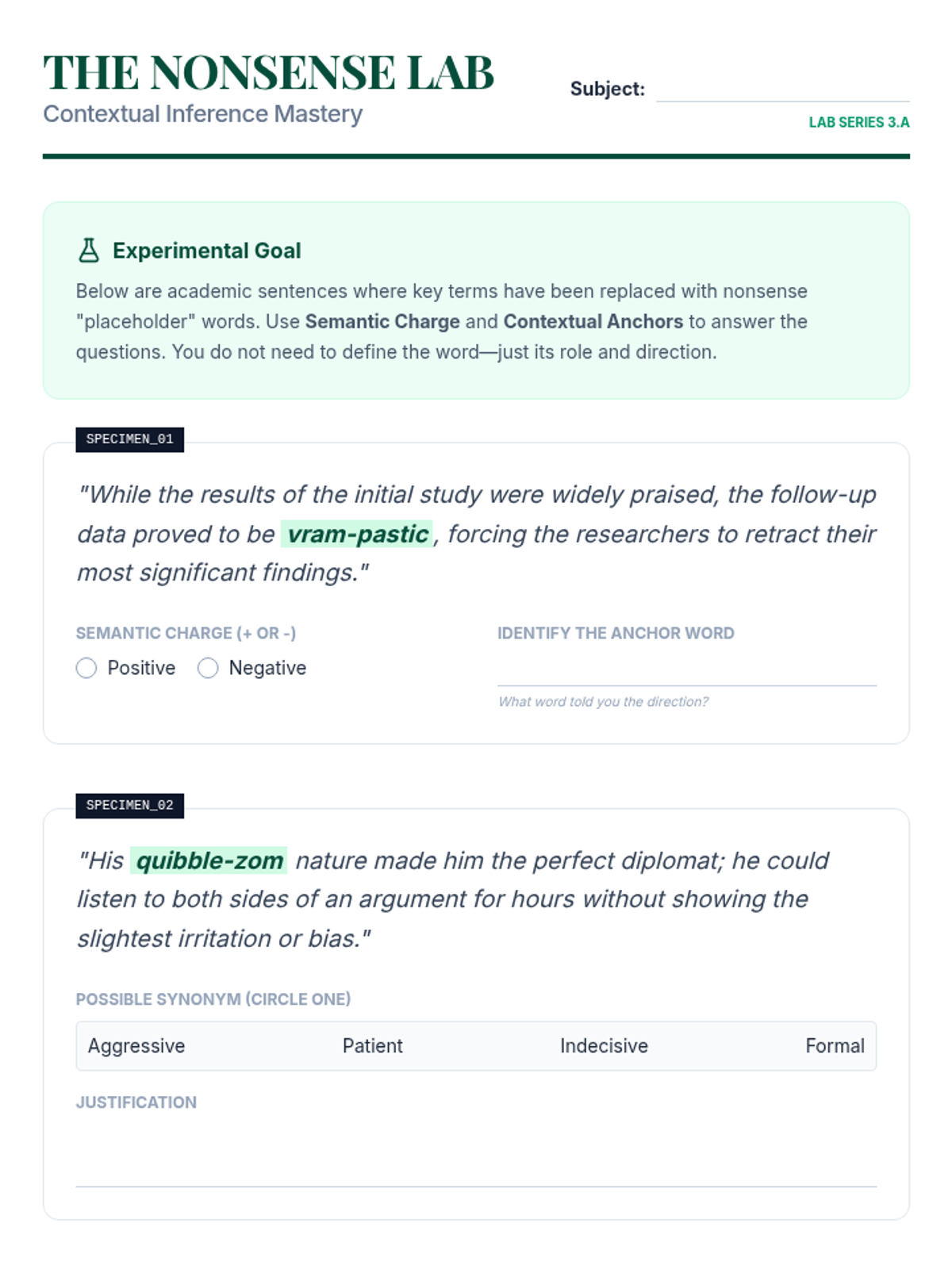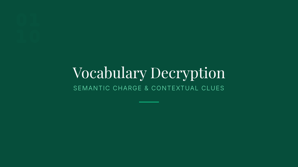 Strategies to infer meaning of advanced vocabulary through syntactic context and etymological roots, focusing on semantic charge.