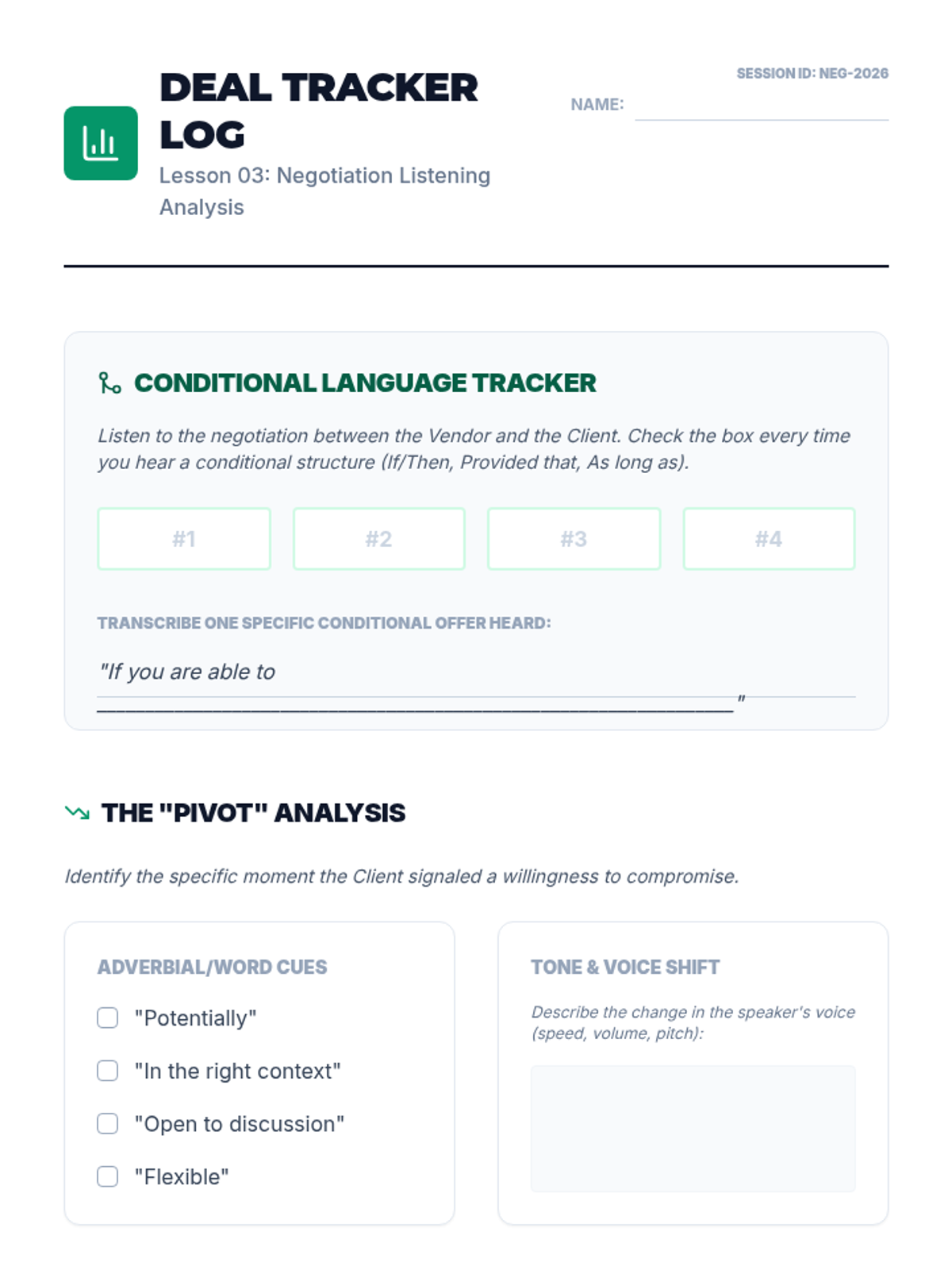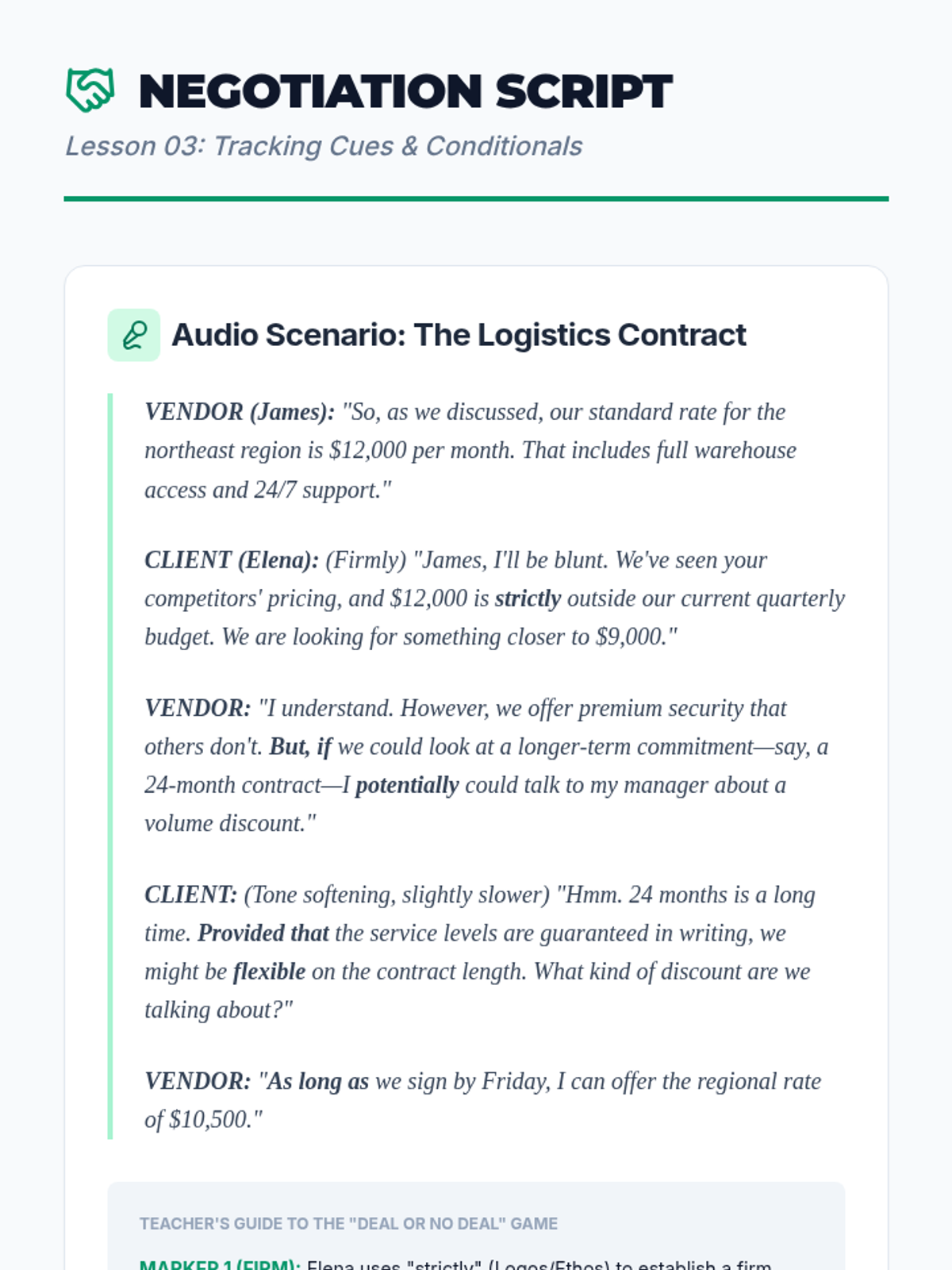 Students identify conditional language and tone shifts in negotiation simulations to spot willingness to compromise.