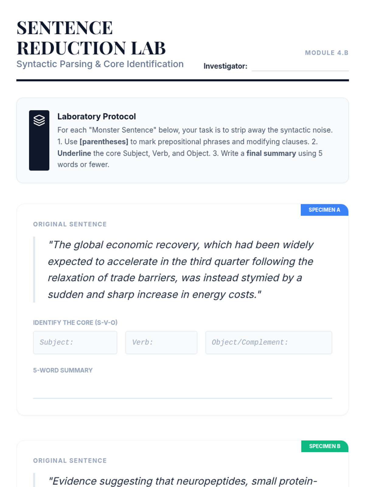 Breaking down convoluted academic sentences into core S-V-O components and identifying ignorable modifying clauses.