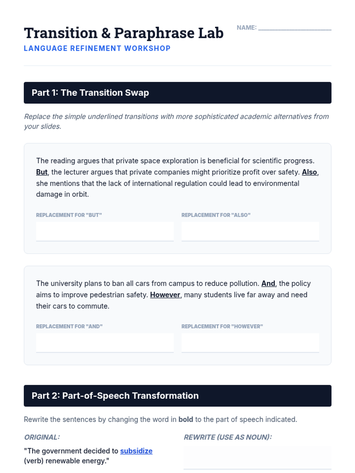 Students build a mental bank of transition phrases and academic sentence templates to reduce cognitive load and improve flow during timed writing.