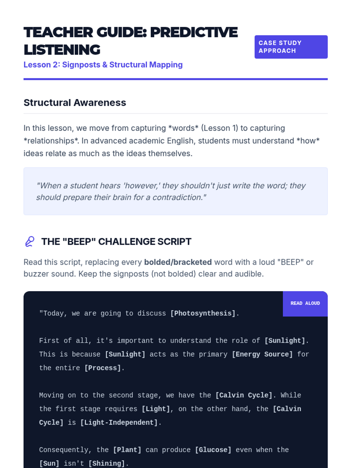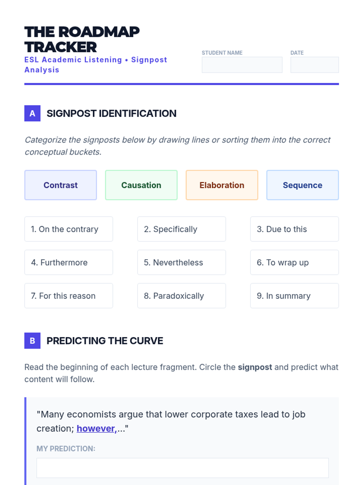Students learn to recognize verbal markers that indicate the organizational structure of a lecture. They practice predicting upcoming content based on these 'signposts' to categorize their notes as they listen.