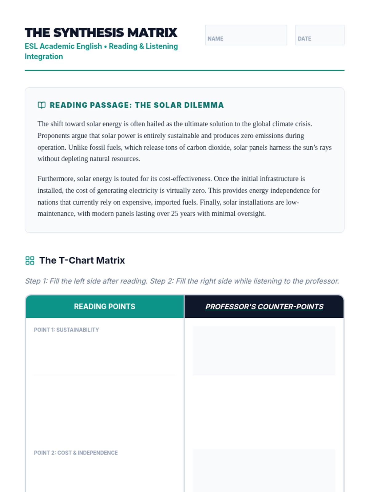 Students practice the core skill of integrated tasks by comparing a written passage with a contrasting audio lecture. They learn to use T-charts to map points of conflict and support between sources.