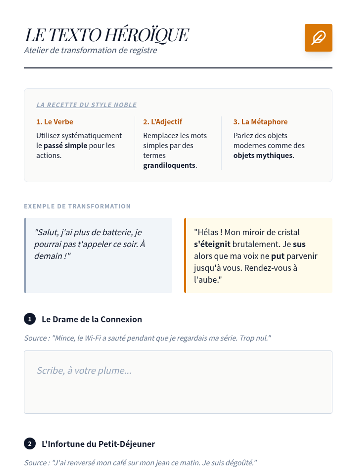 Students take a contemporary email or text message recounting an event and rewrite it using the passé simple to create a mock-epic tone. This highlights the stylistic gap between spoken and literary French.