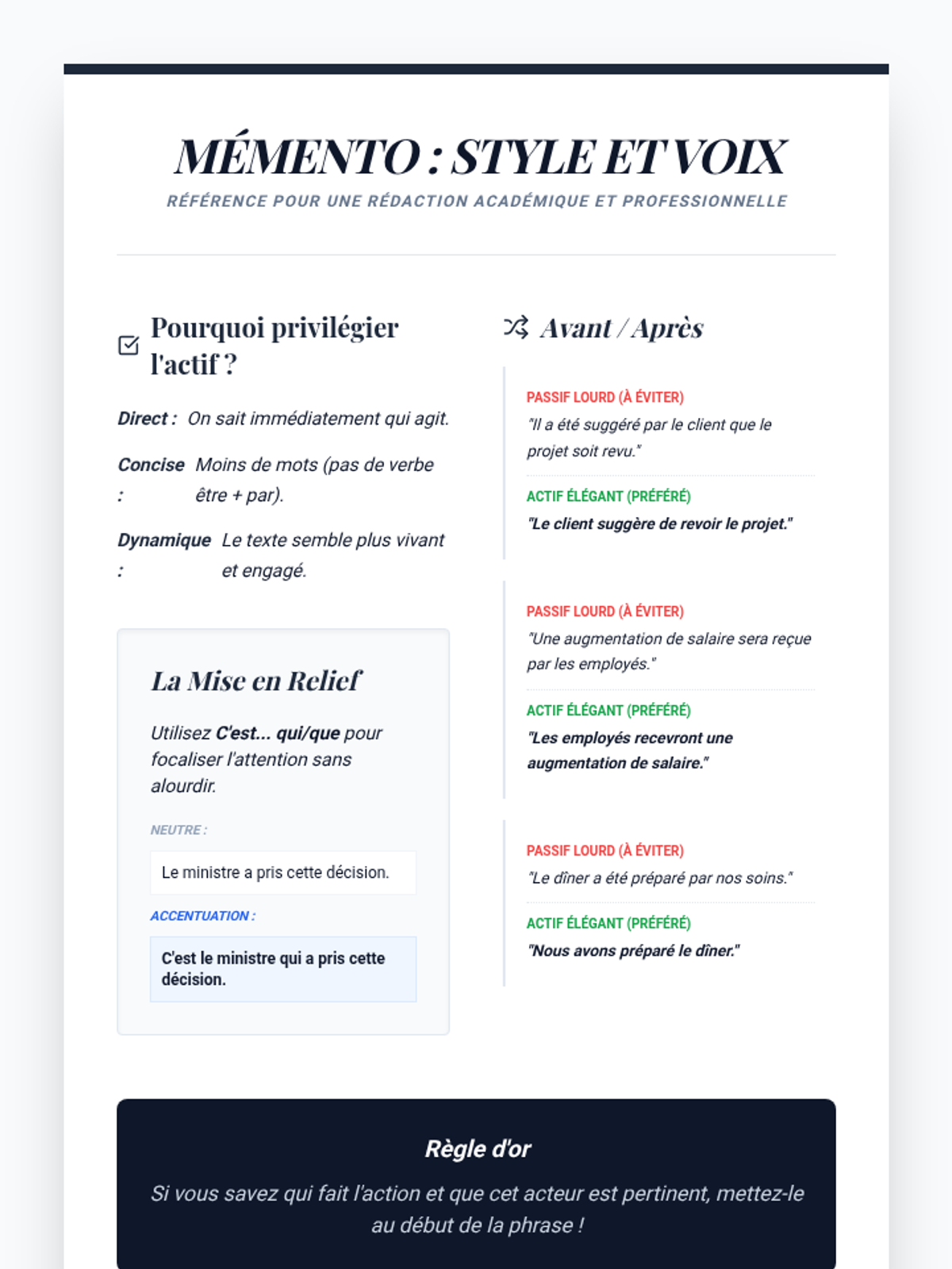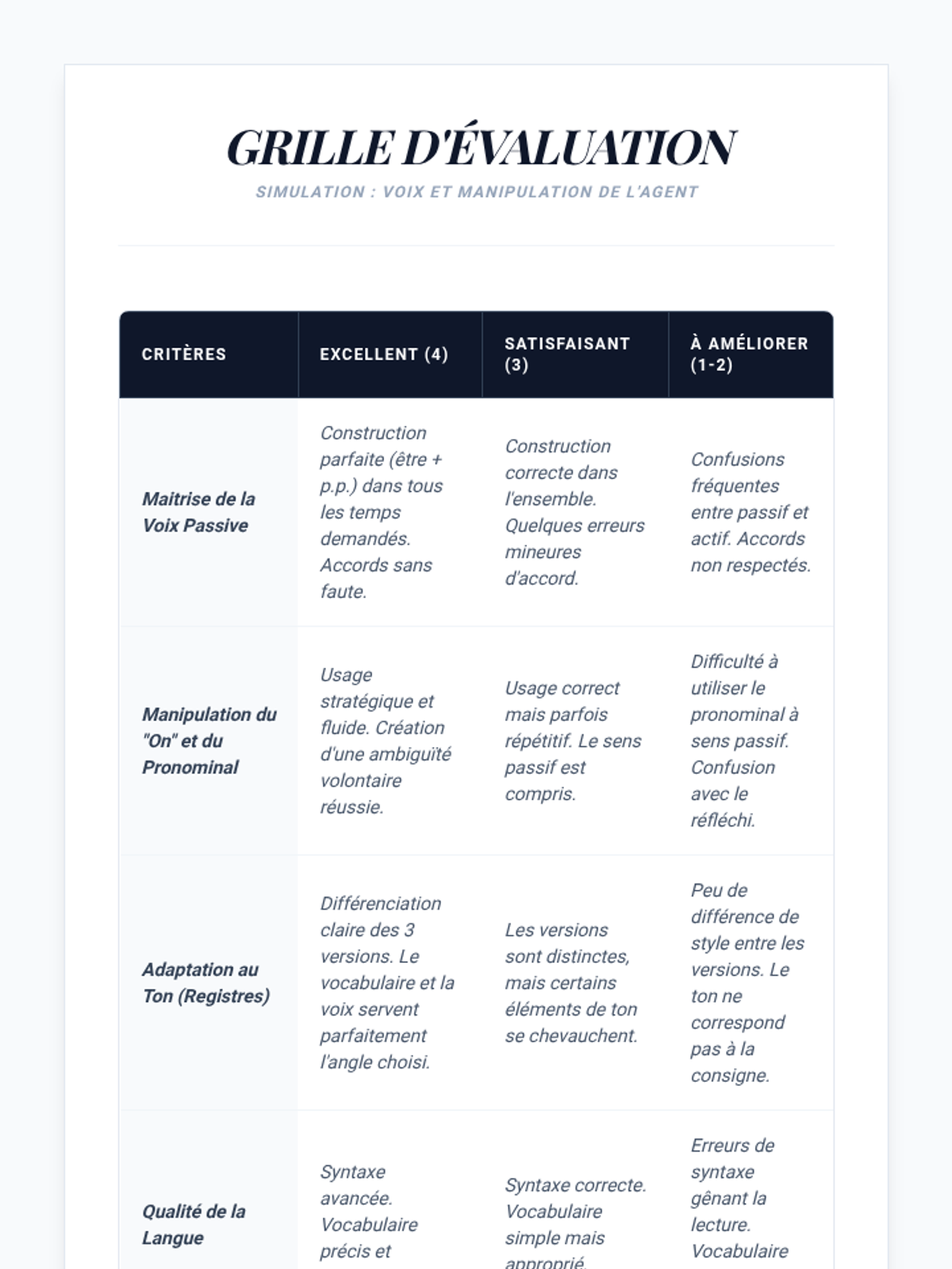 While knowing the passive is important, avoiding it is often better for style. Students practice transforming heavy passive sentences into active ones or using 'C'est... qui' structures.