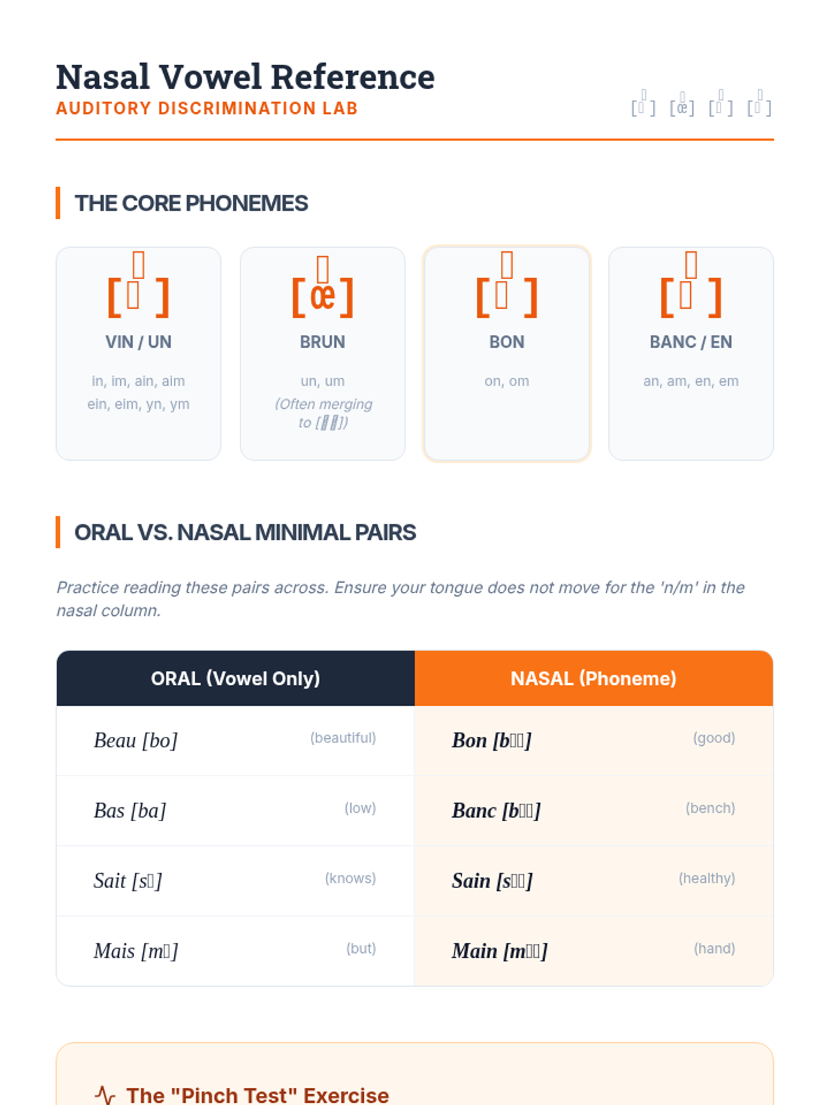 A deep dive into the four primary nasal vowels of French. Students learn to control airflow and distinguish nasal sounds through minimal pair exercises.