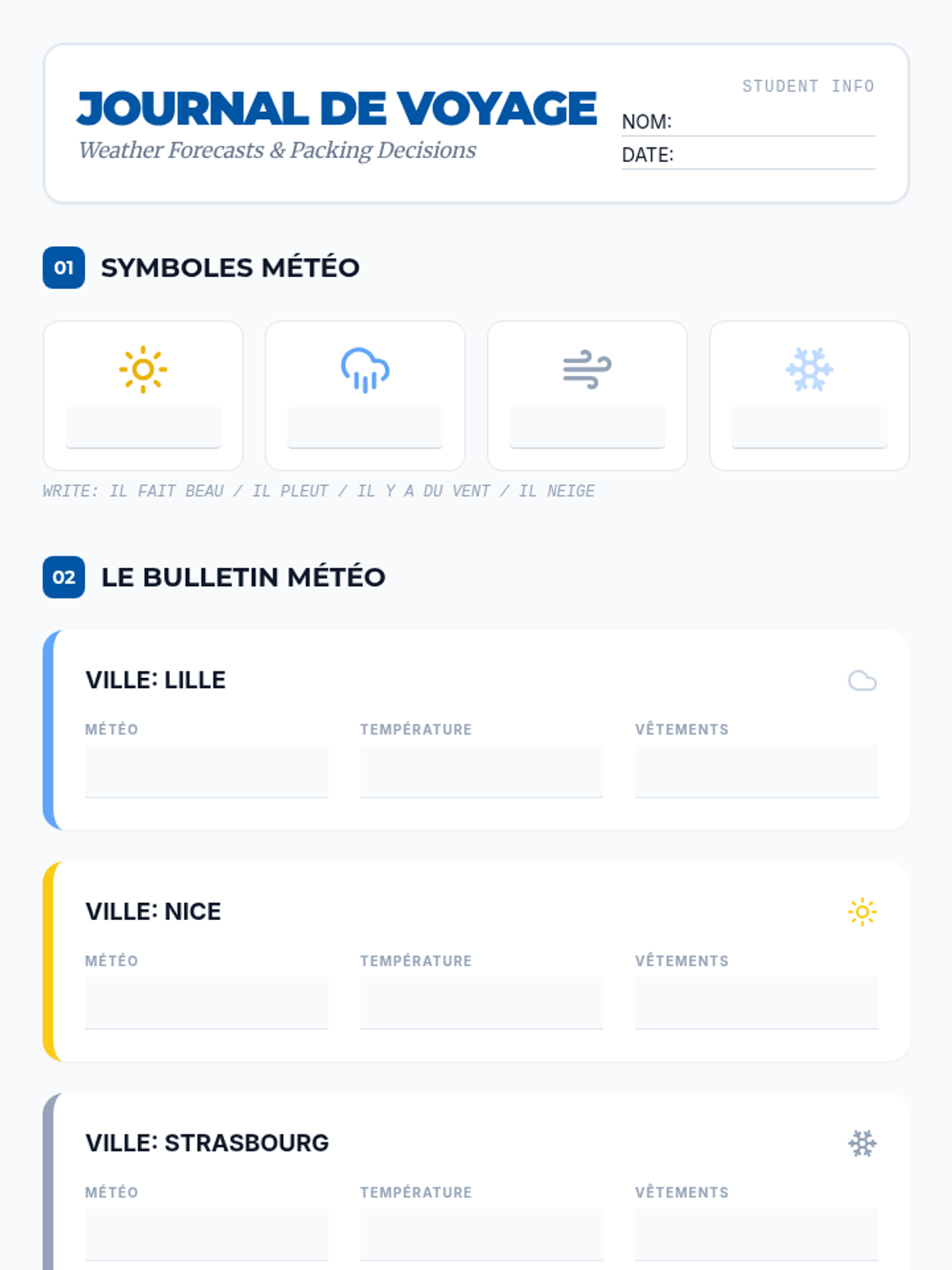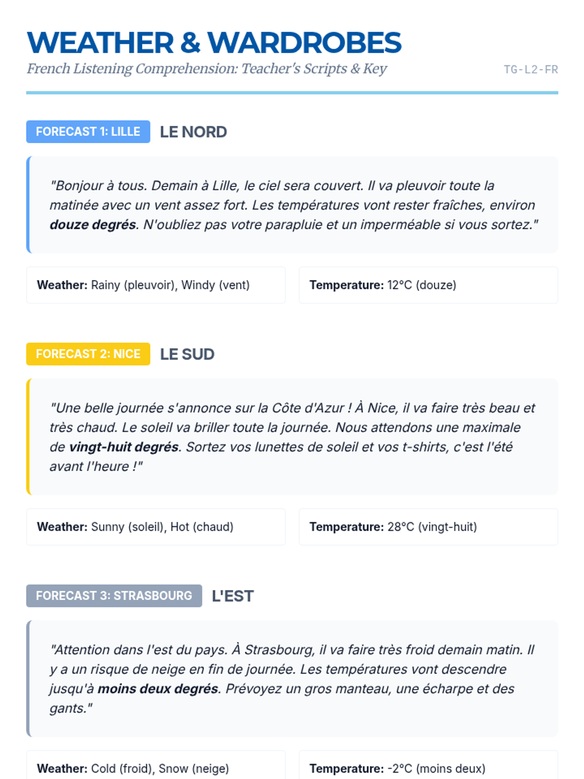 Students analyze weather forecasts to identify future tense structures and temperatures. They practice functional planning by creating packing lists and recommending outfits based on regional weather heard in the audio.