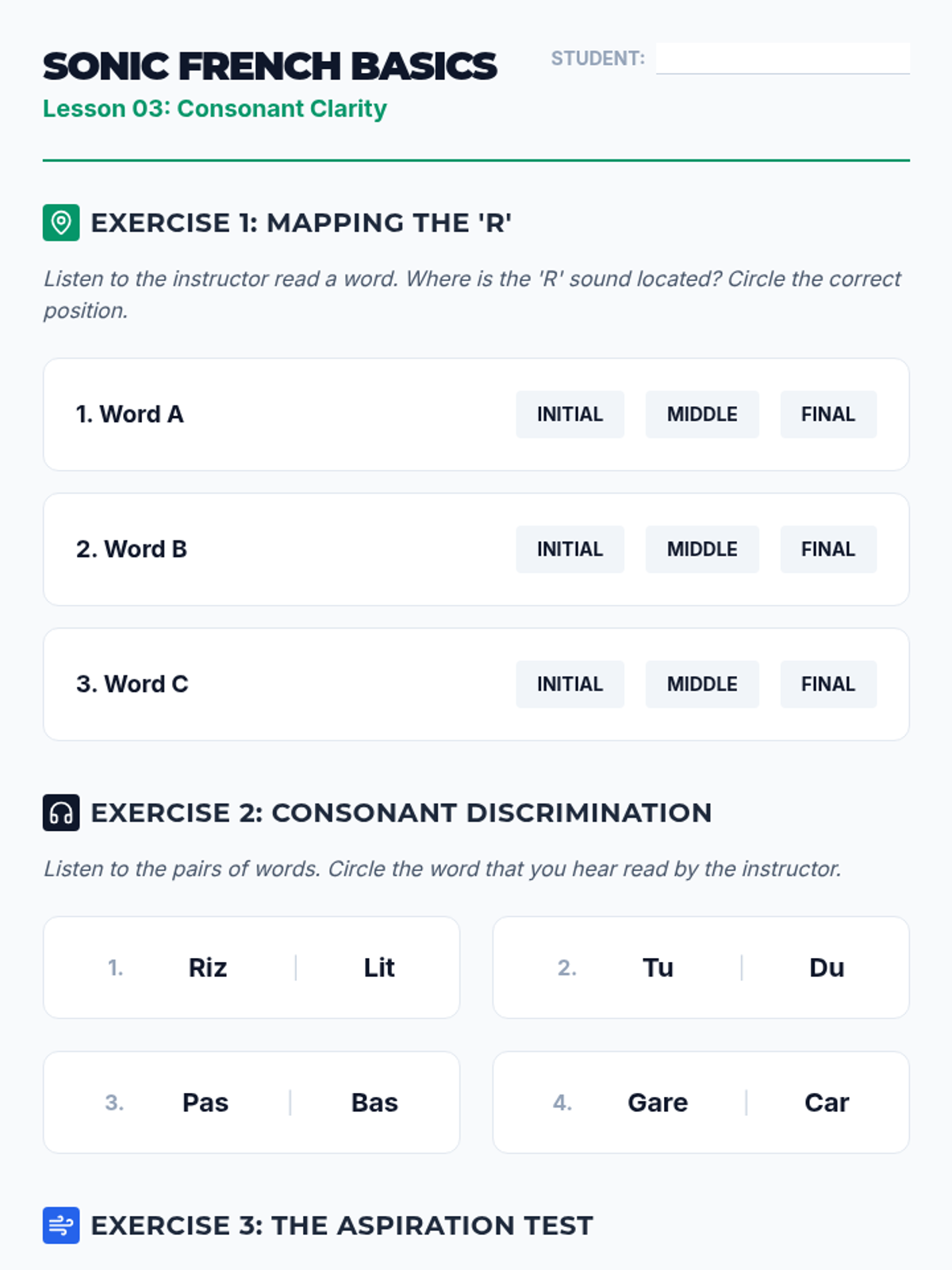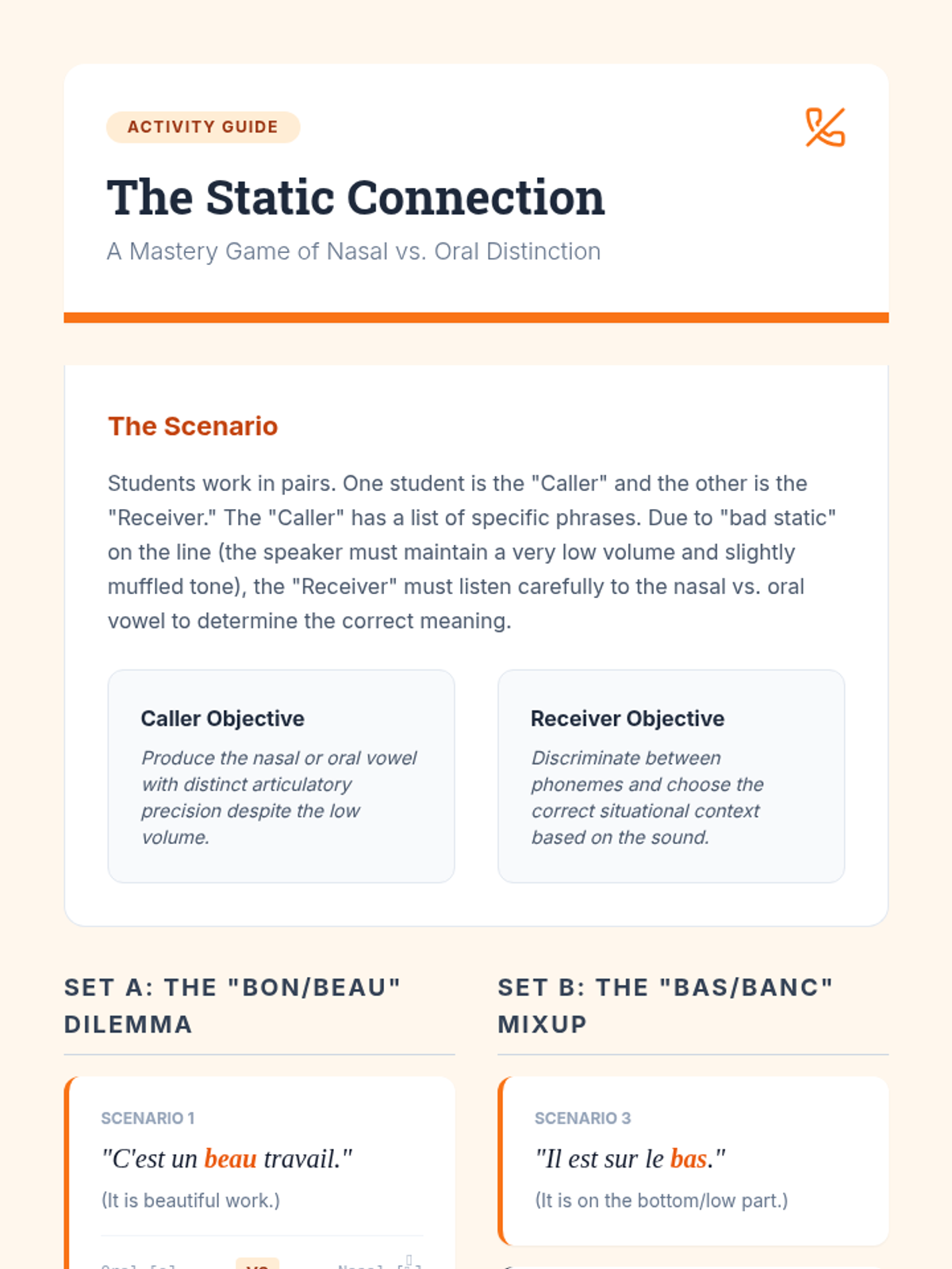 Focuses on the distinct French vowel system, particularly the nasal sounds (on, an, in), using minimal pair drills to train the ear.