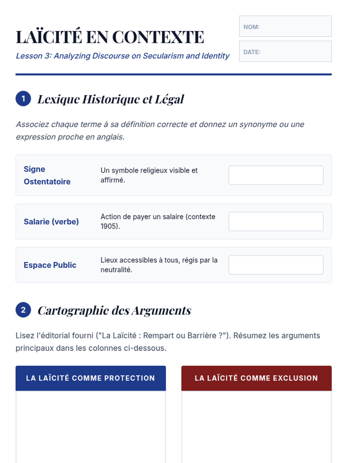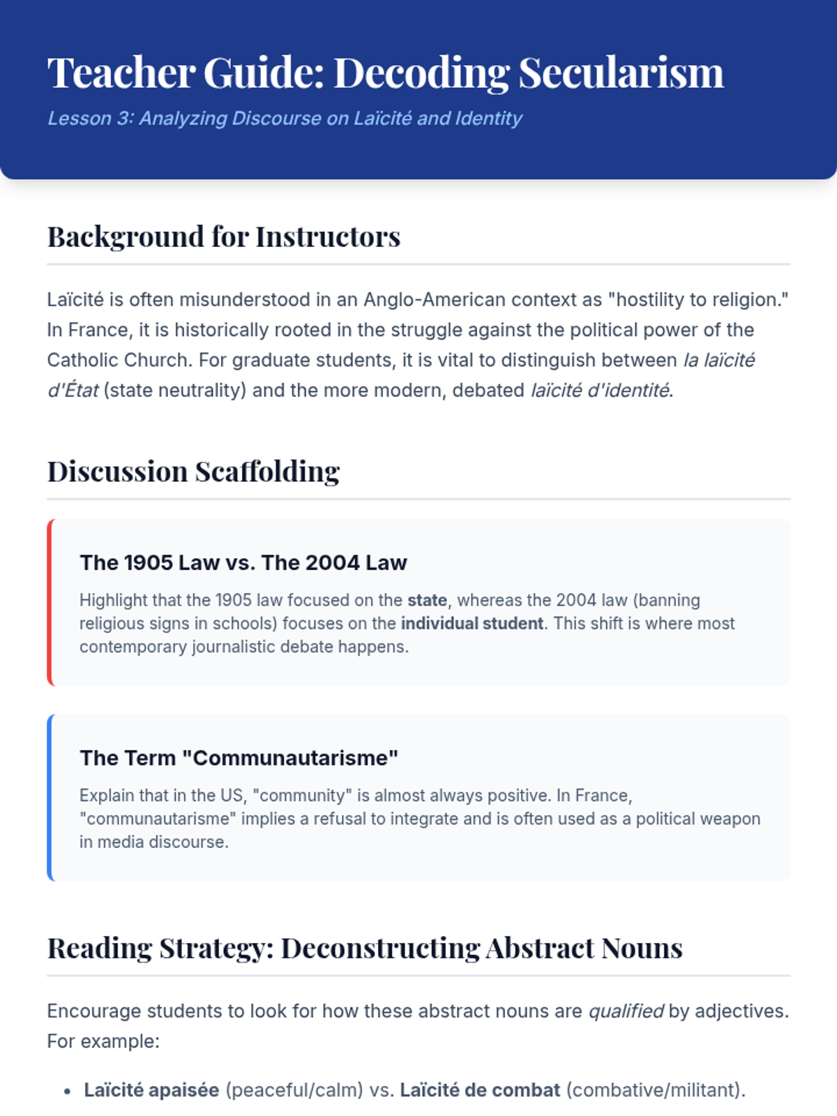 Students read complex texts regarding the French concept of secularism, decoding historical and legal vocabulary.