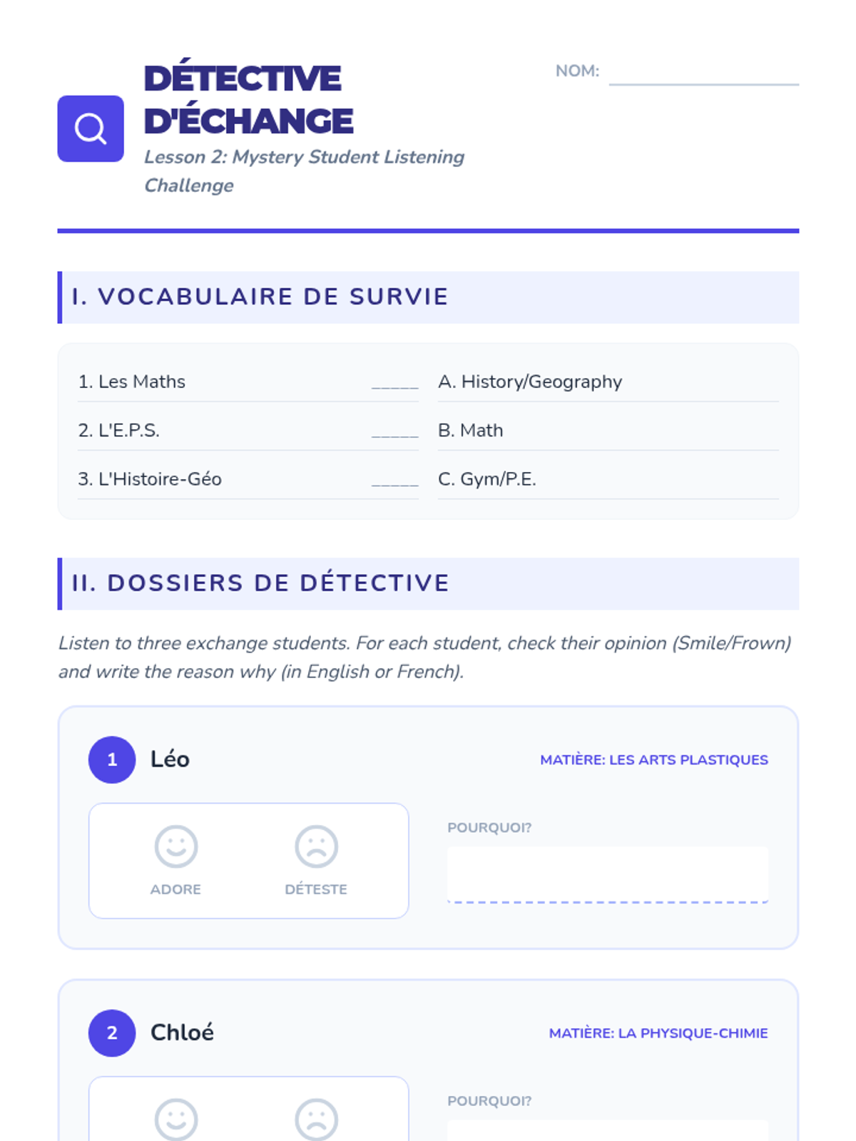 Learners listen to descriptions of school subjects and preferences to identify likes, dislikes, and current class contexts.