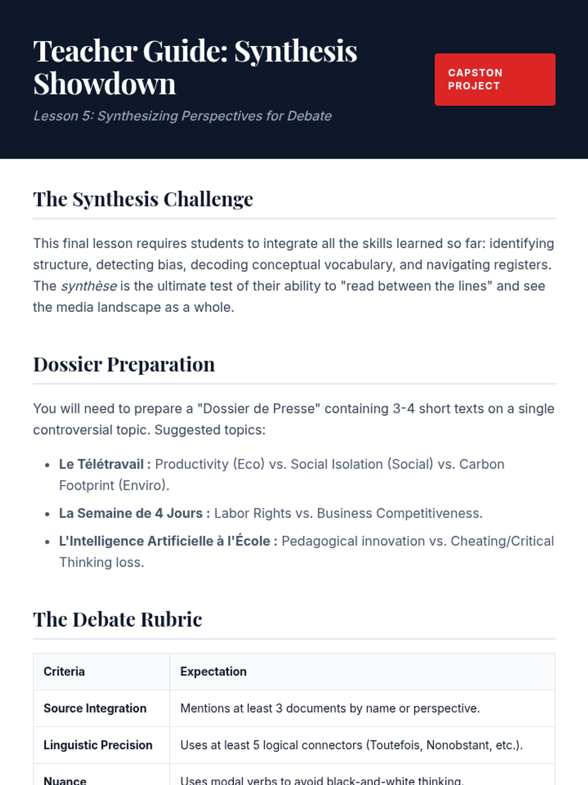 Culminating lesson where students synthesize information from multiple sources to prepare for a debate or written synthesis.