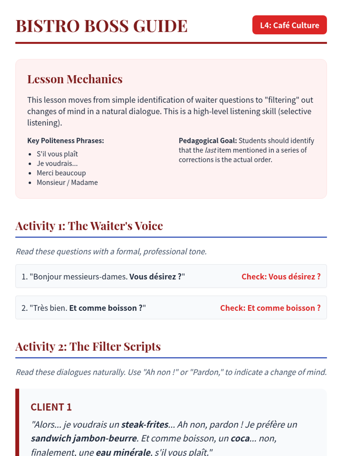 Students analyze dialogues between customers and waiters in a French café. They focus on identifying questions asked by the waiter and the politeness markers used in ordering food and drinks.