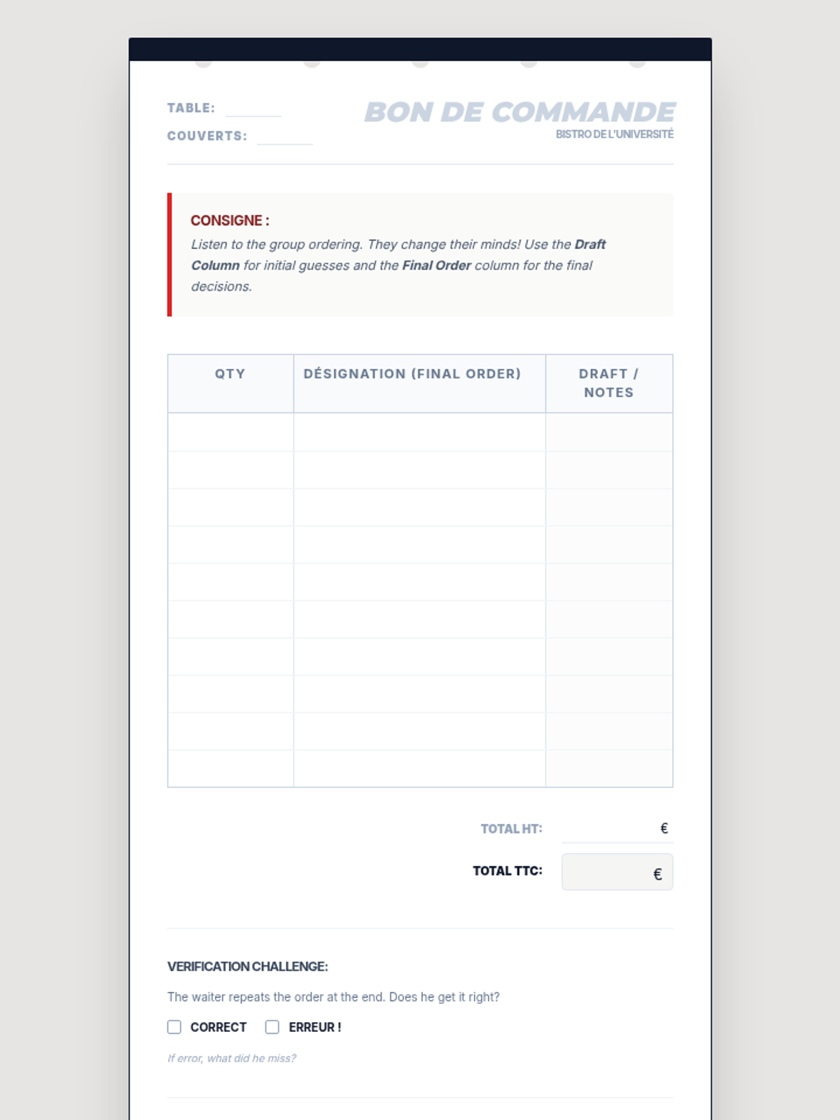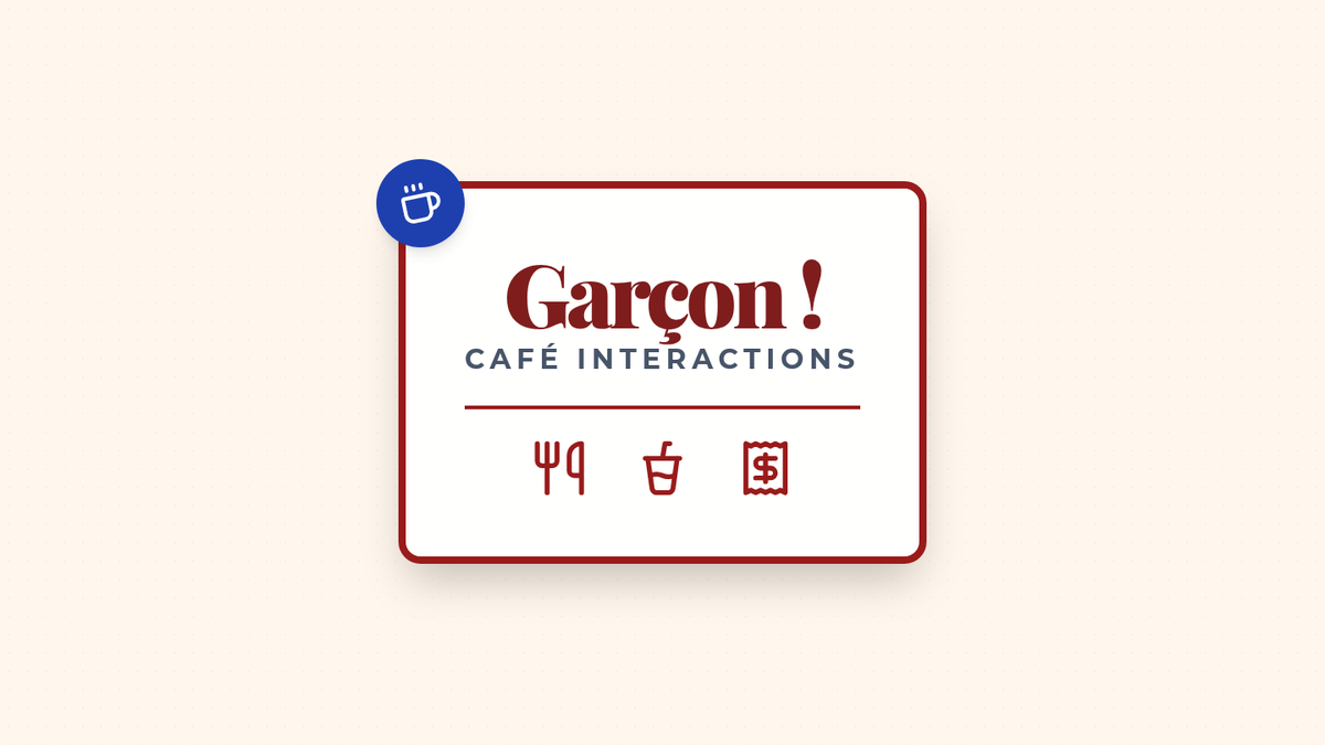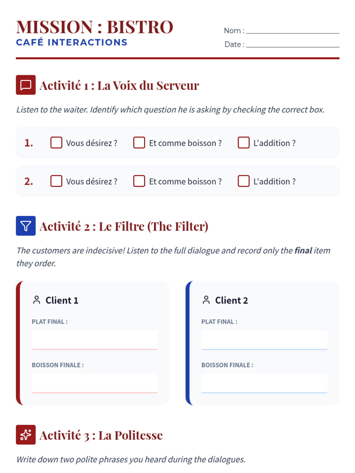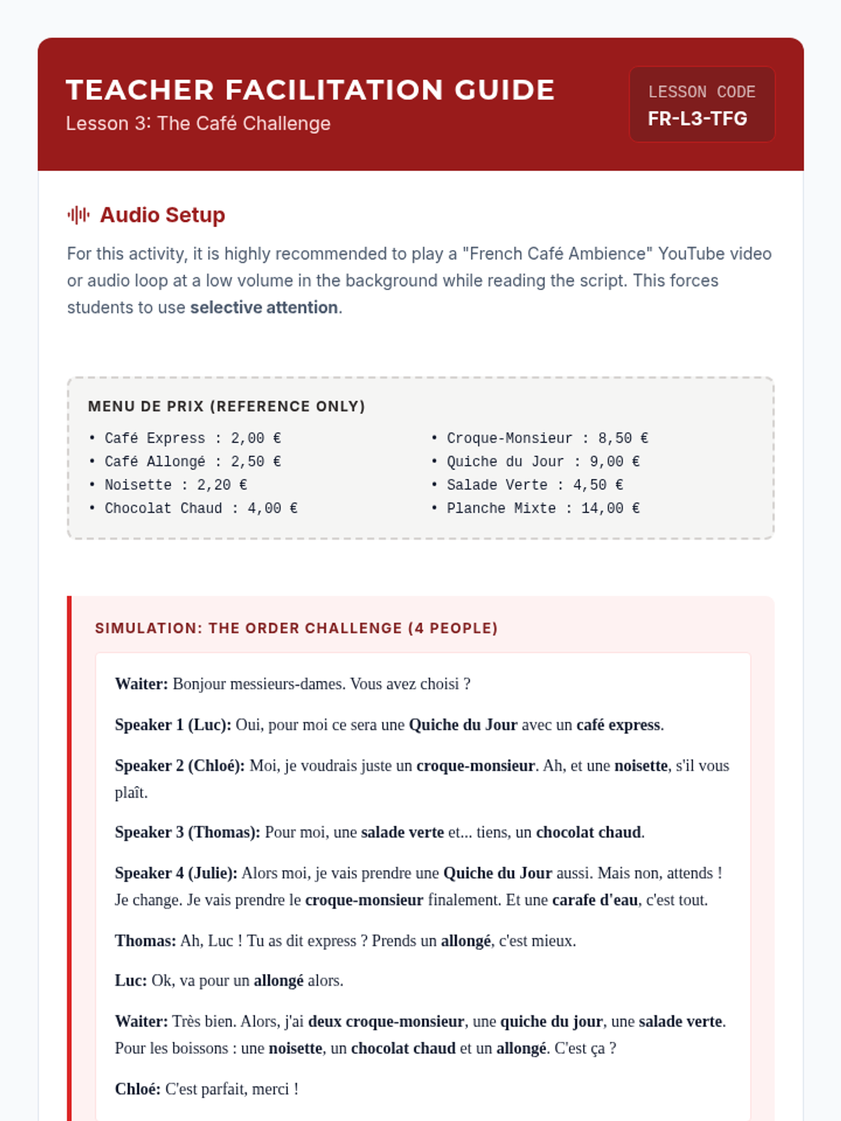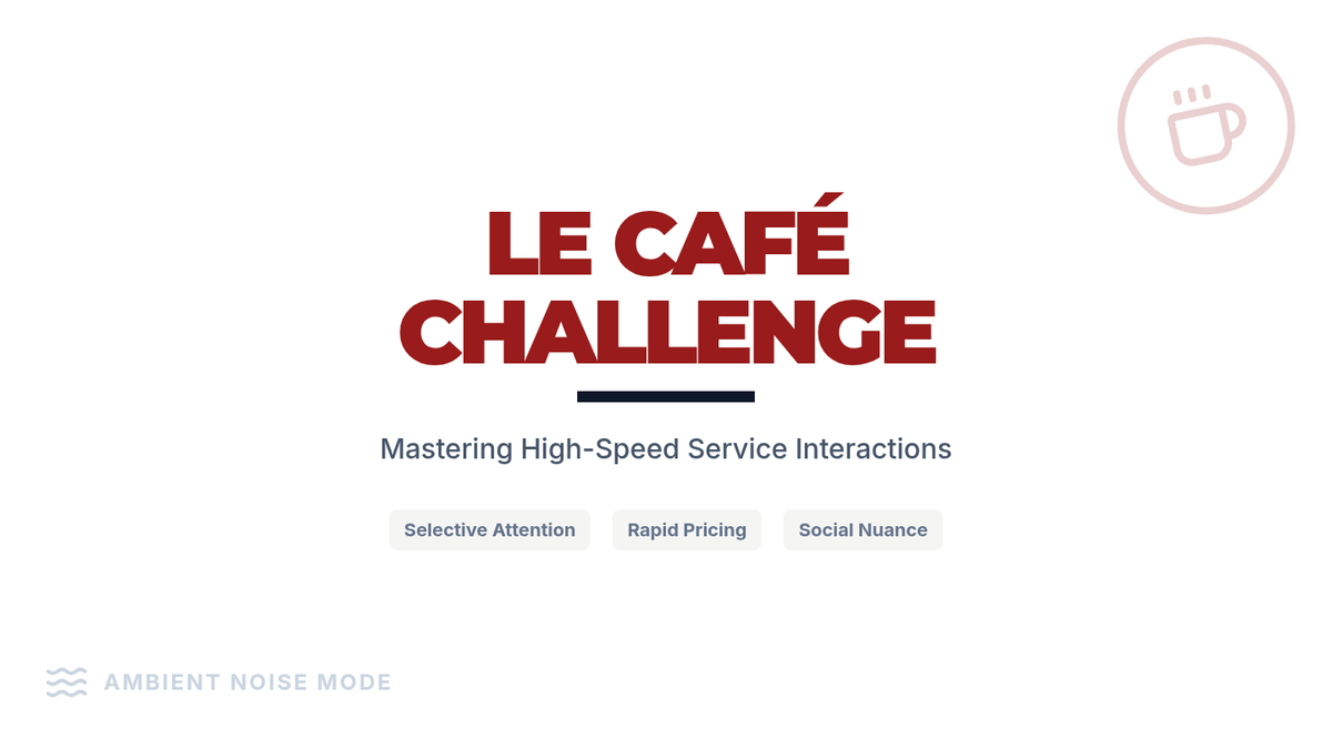 Trains students to listen for specific information (orders, prices) amidst the ambient noise of a French café.