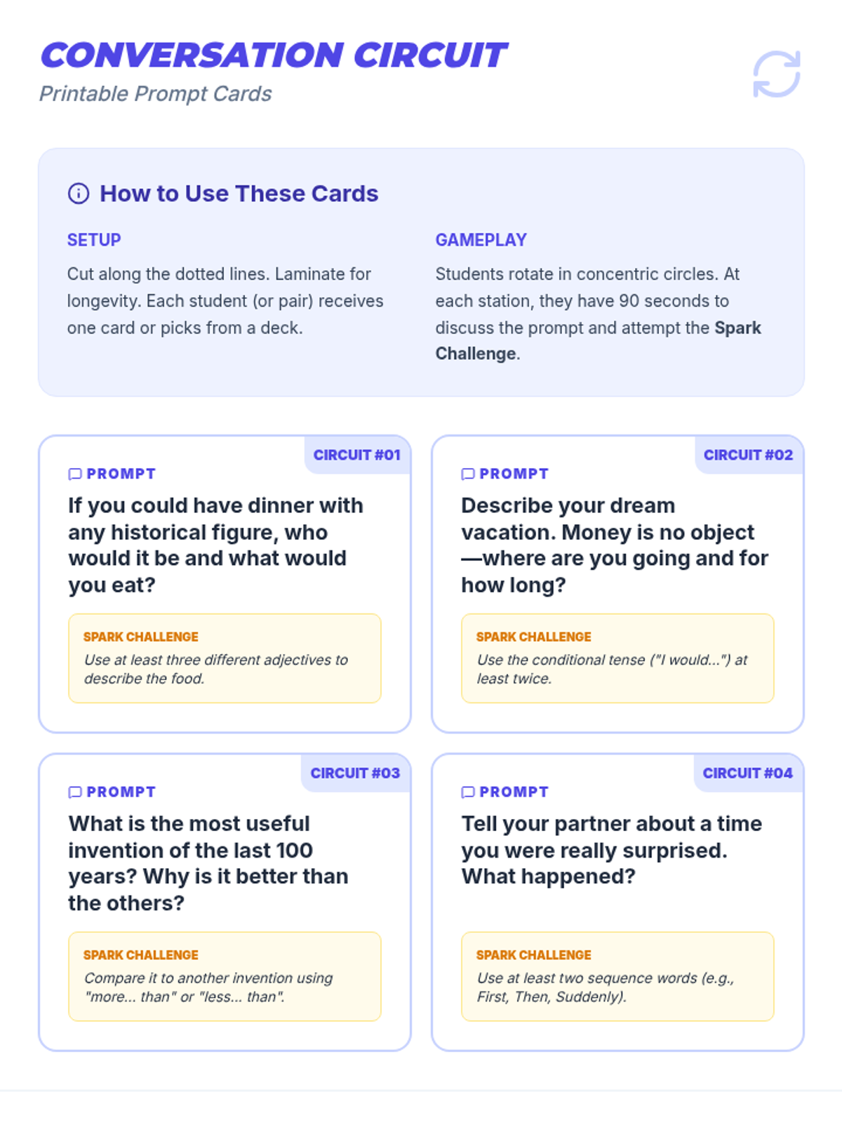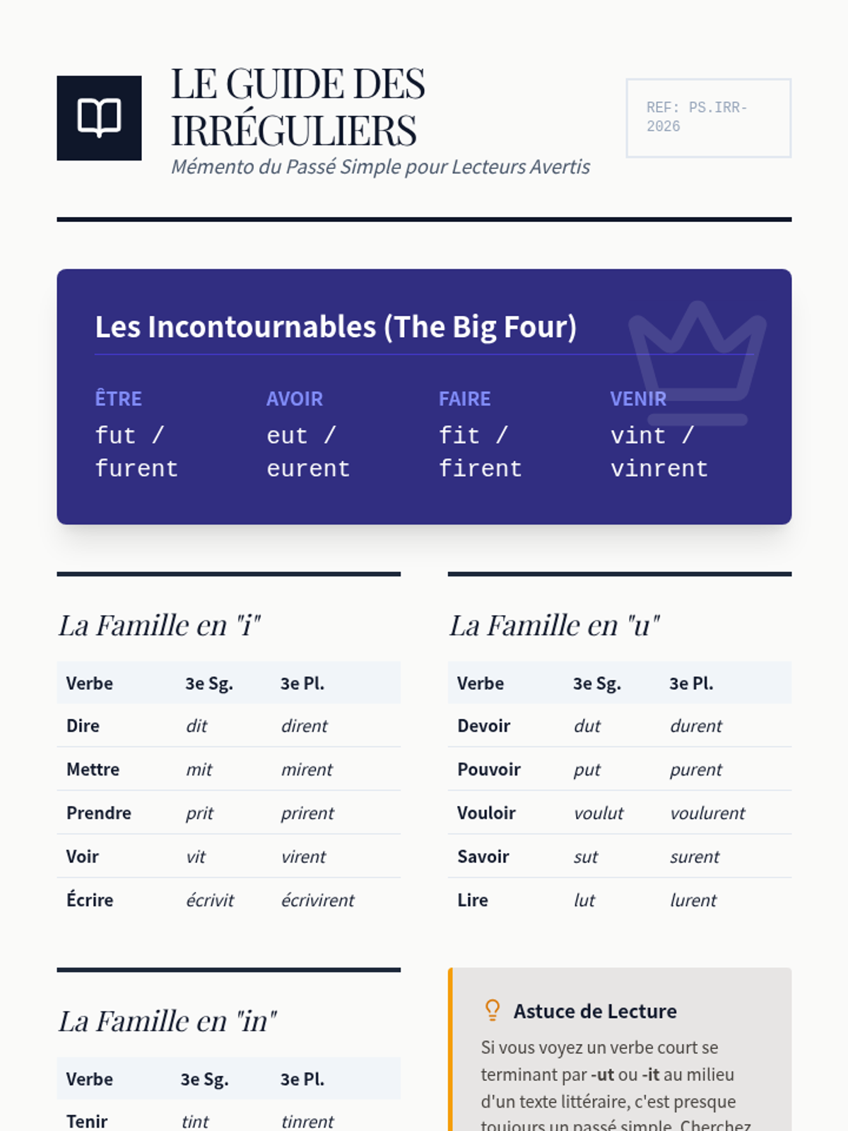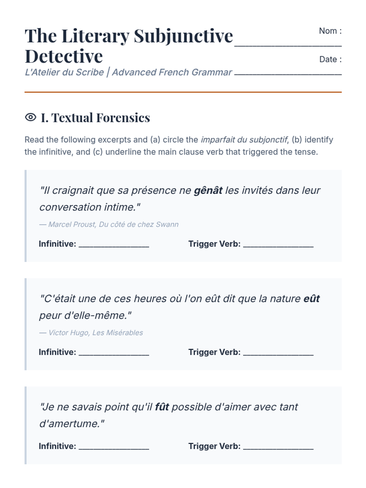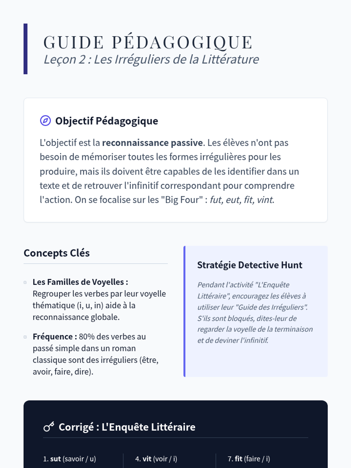 Focusing on the 'big' irregulars (fut, eut, fit, vint), students translate literary excerpts into modern French. They create a reference guide for these high-frequency literary forms.