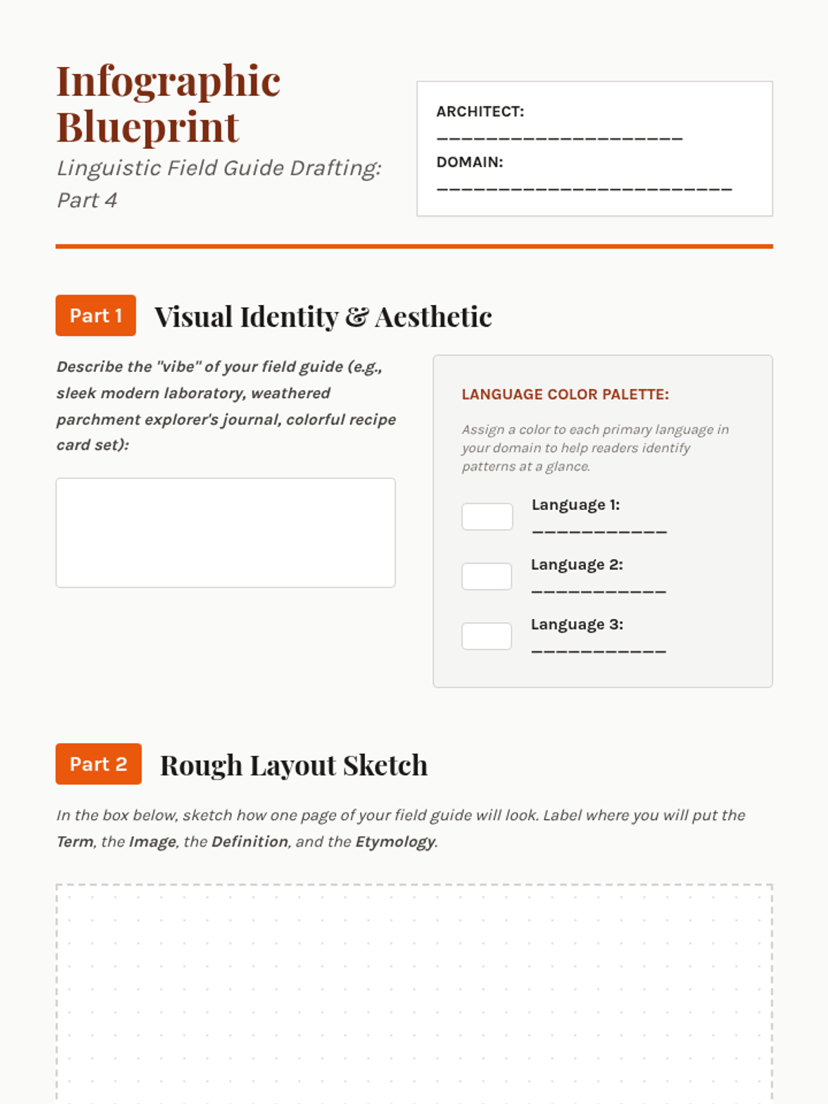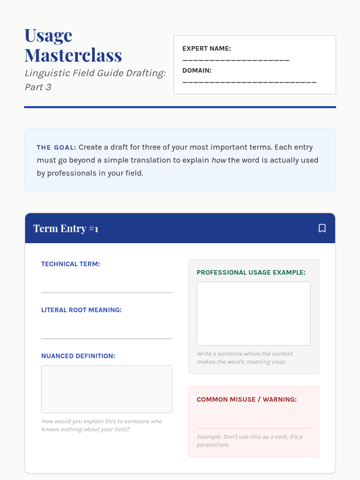 Students draft technical definitions and usage guides that explain the nuances of their chosen terms within their professional context.