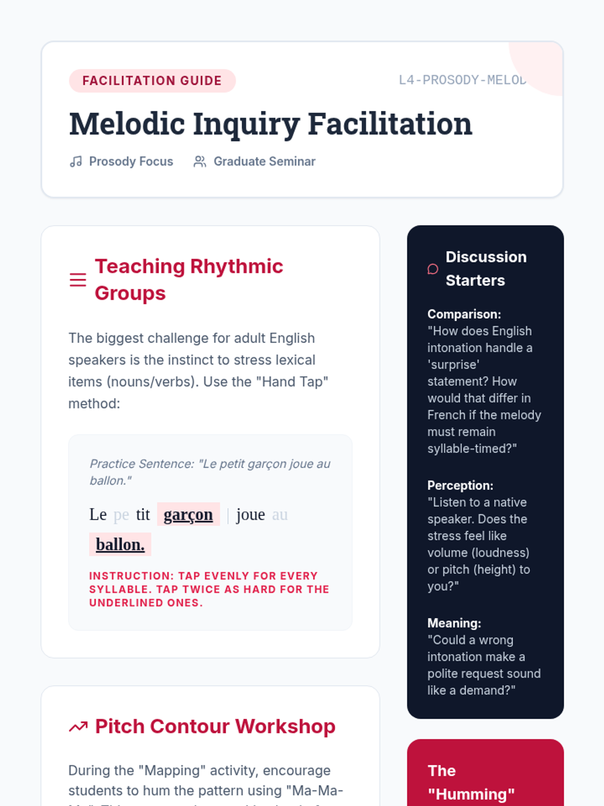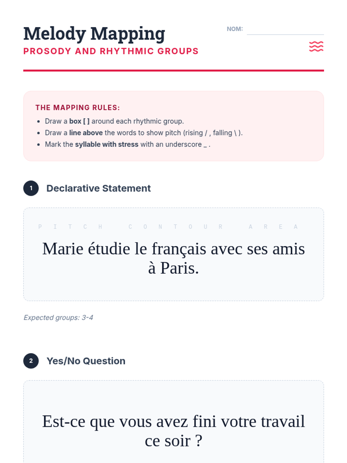 Study of French prosody, focusing on the rise and fall of pitch in statements versus questions. Students map pitch contours and practice rhythmic grouping.