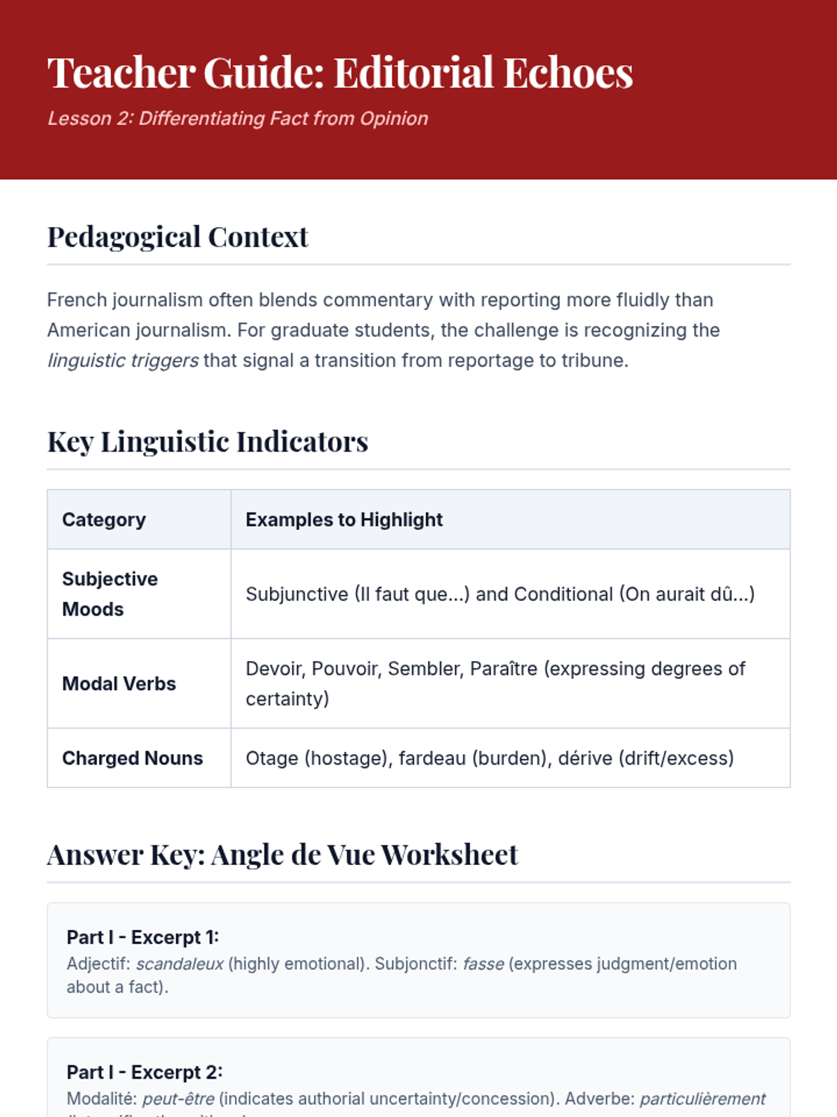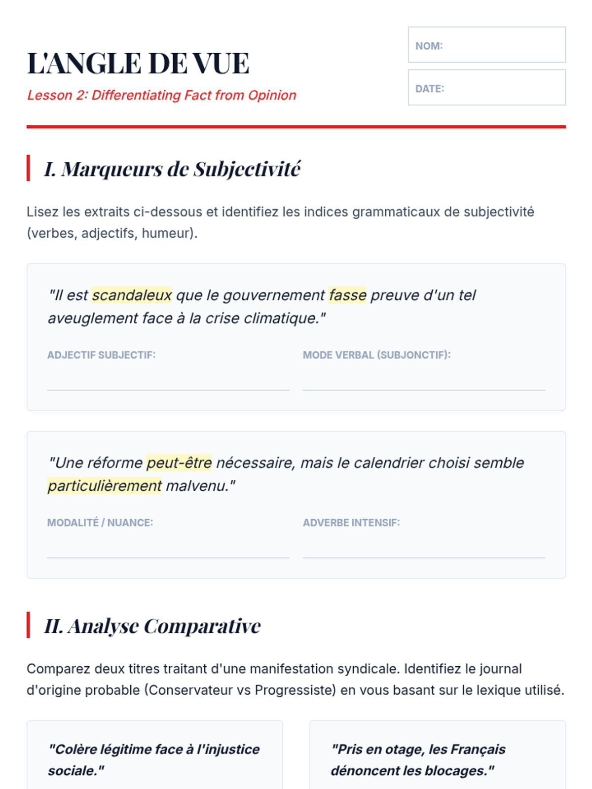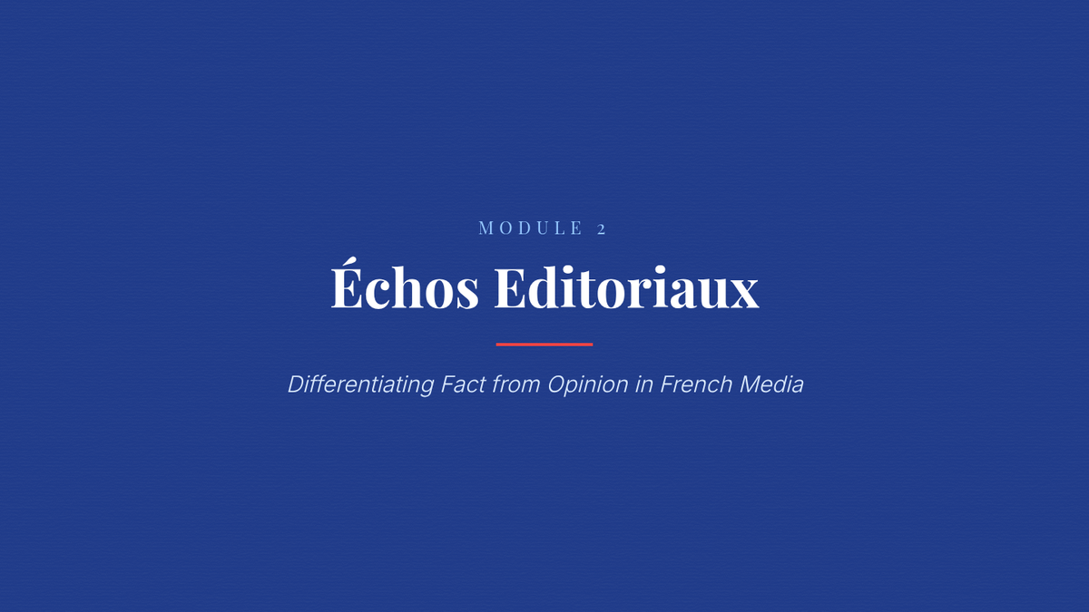 Learners examine 'les tribunes' (op-eds) to distinguish objective reporting from subjective argumentation through linguistic markers.