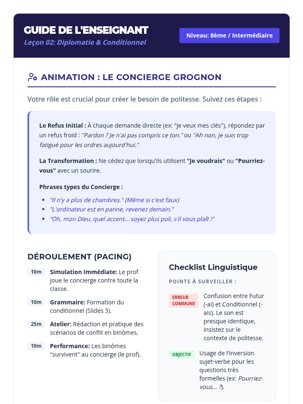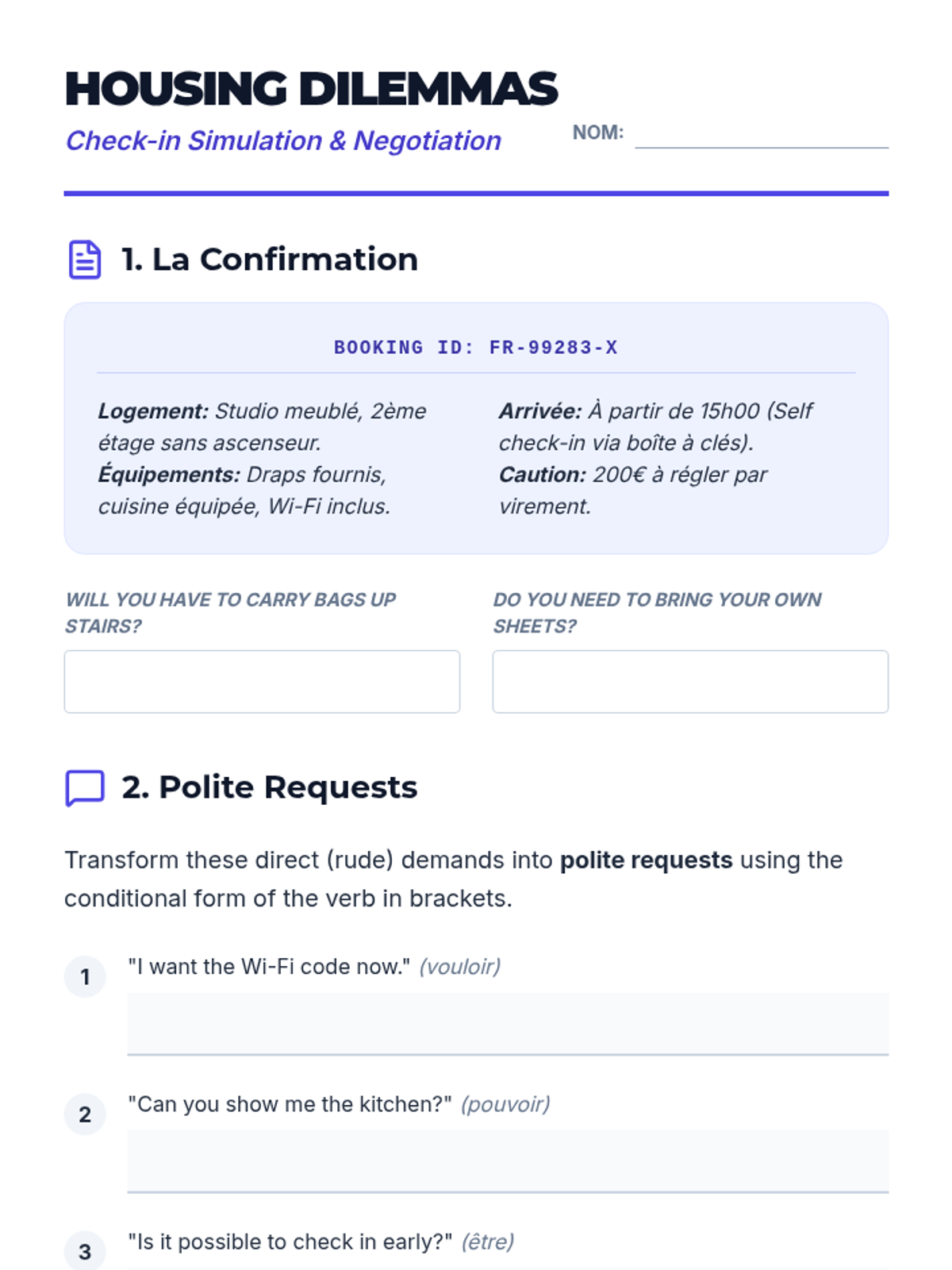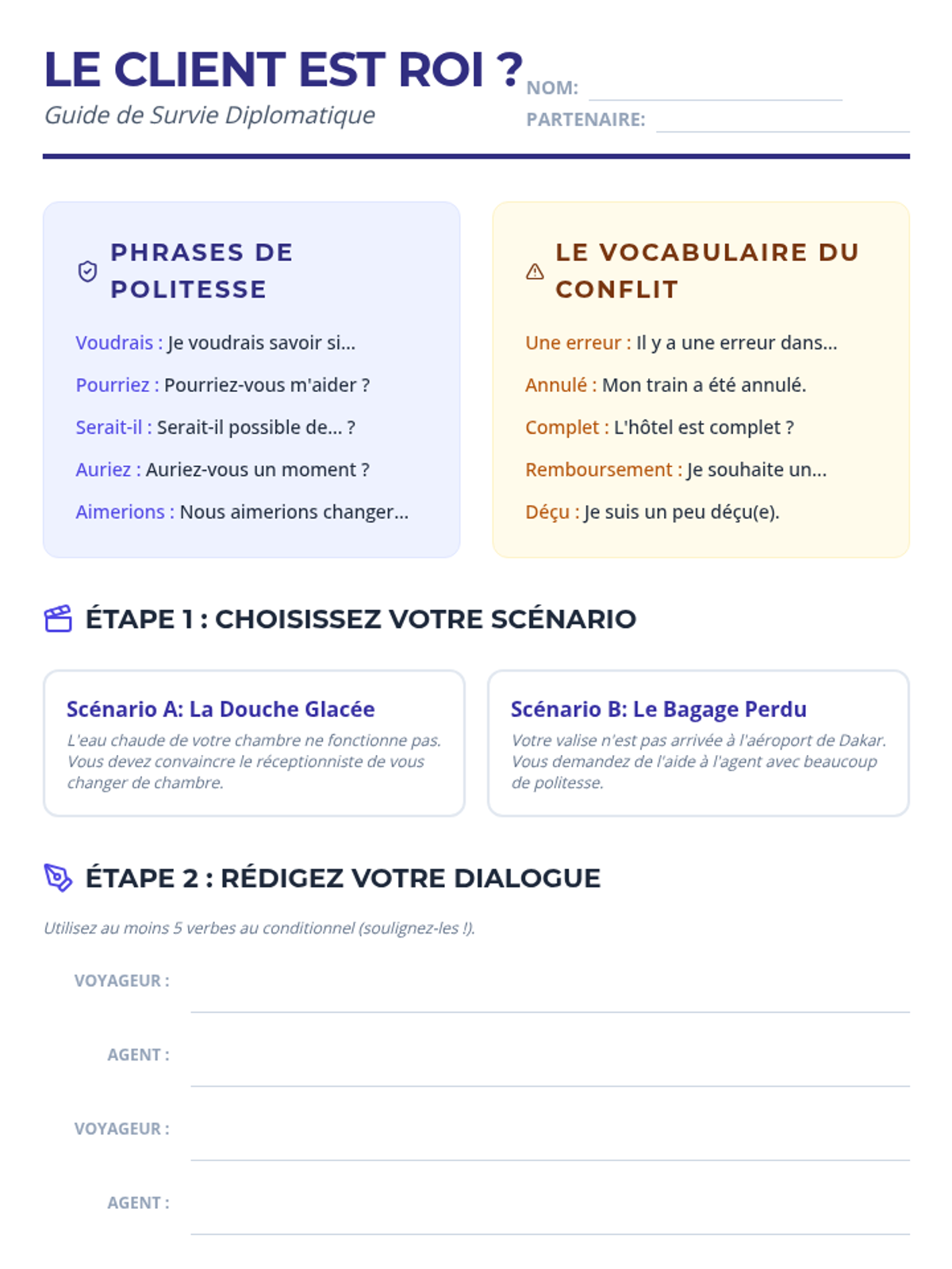 Focusing on the conditional mood, students practice polite service interactions and conflict resolution in hotels and transit hubs.