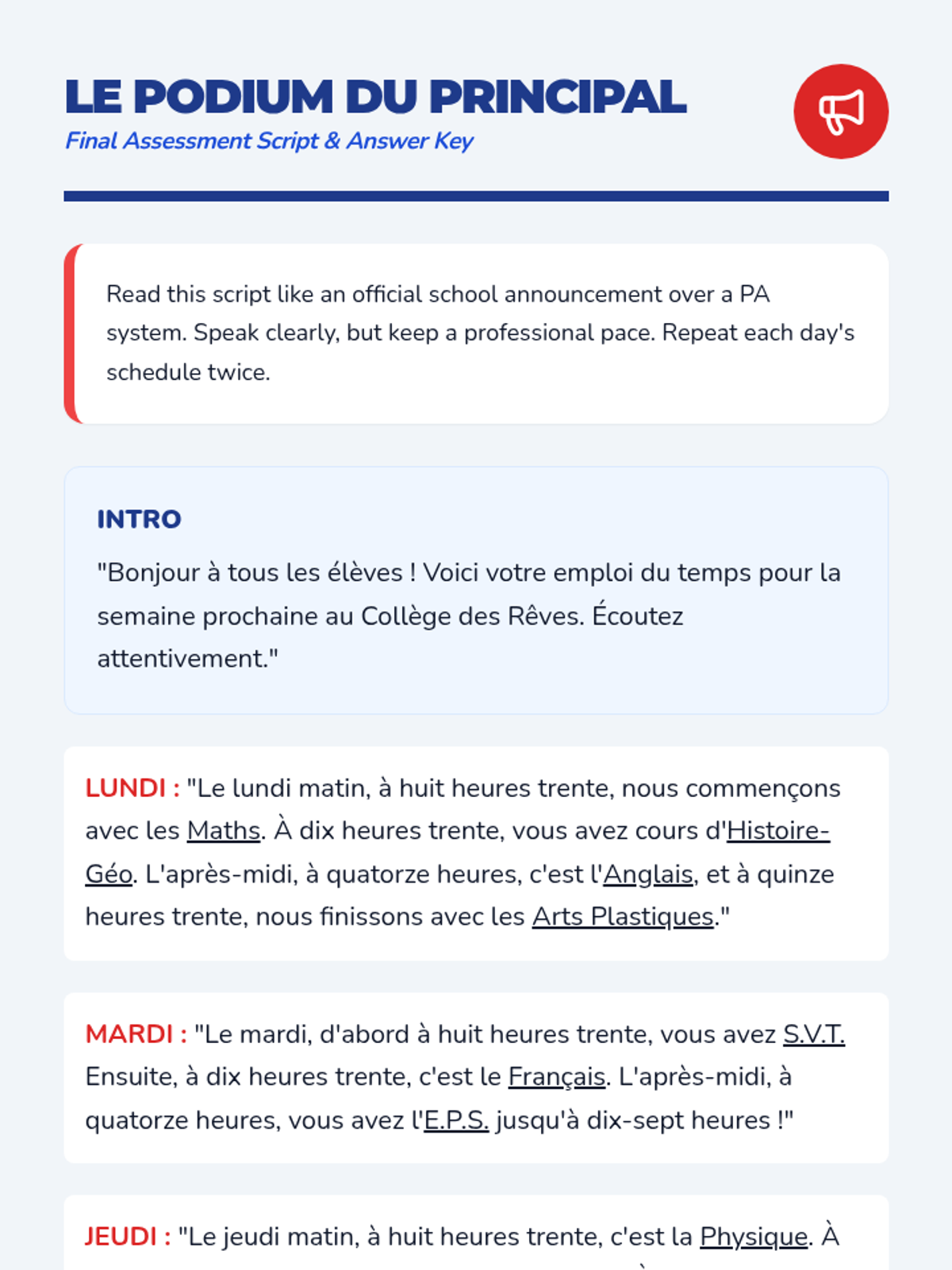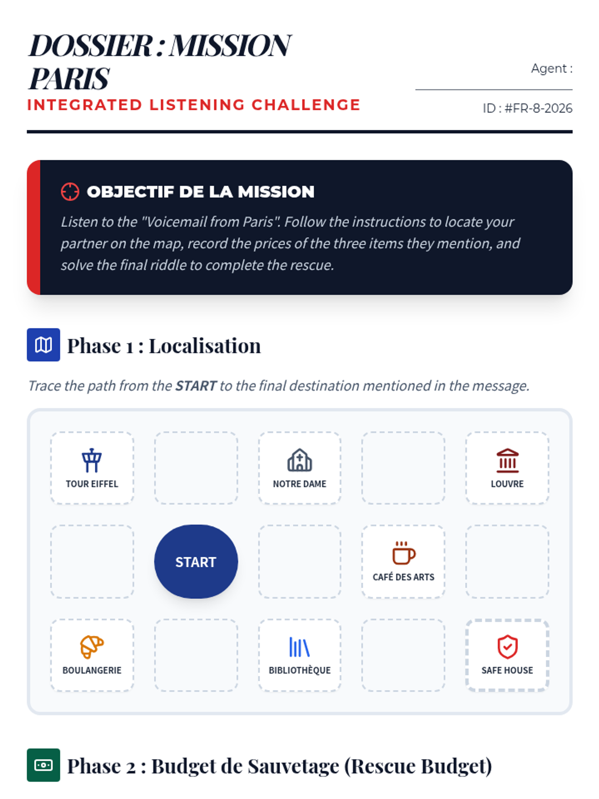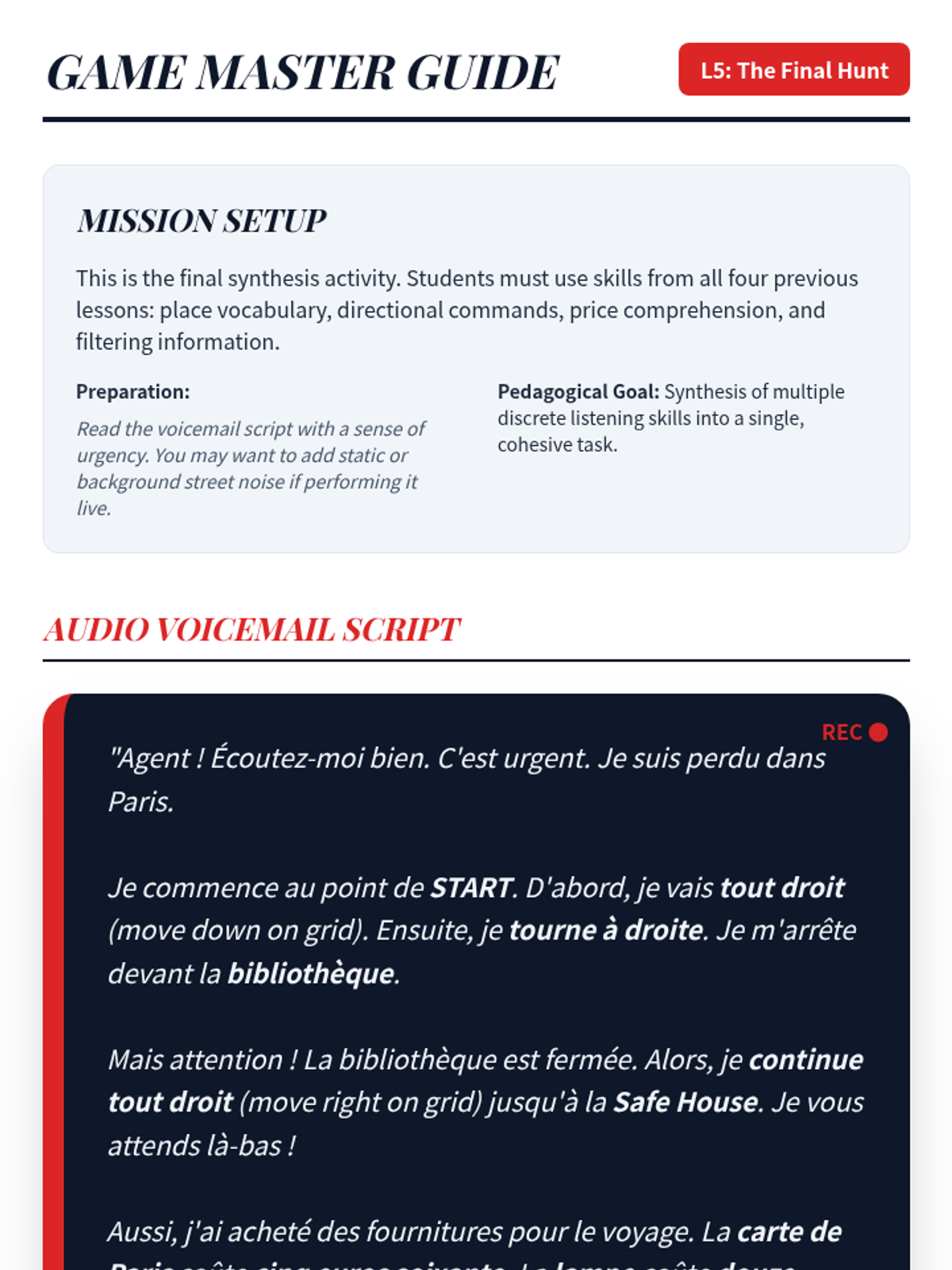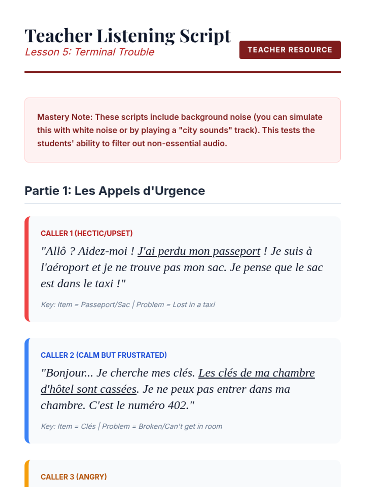 A mastery-based finale where students solve travel emergencies by identifying problems and solutions from audio reports.