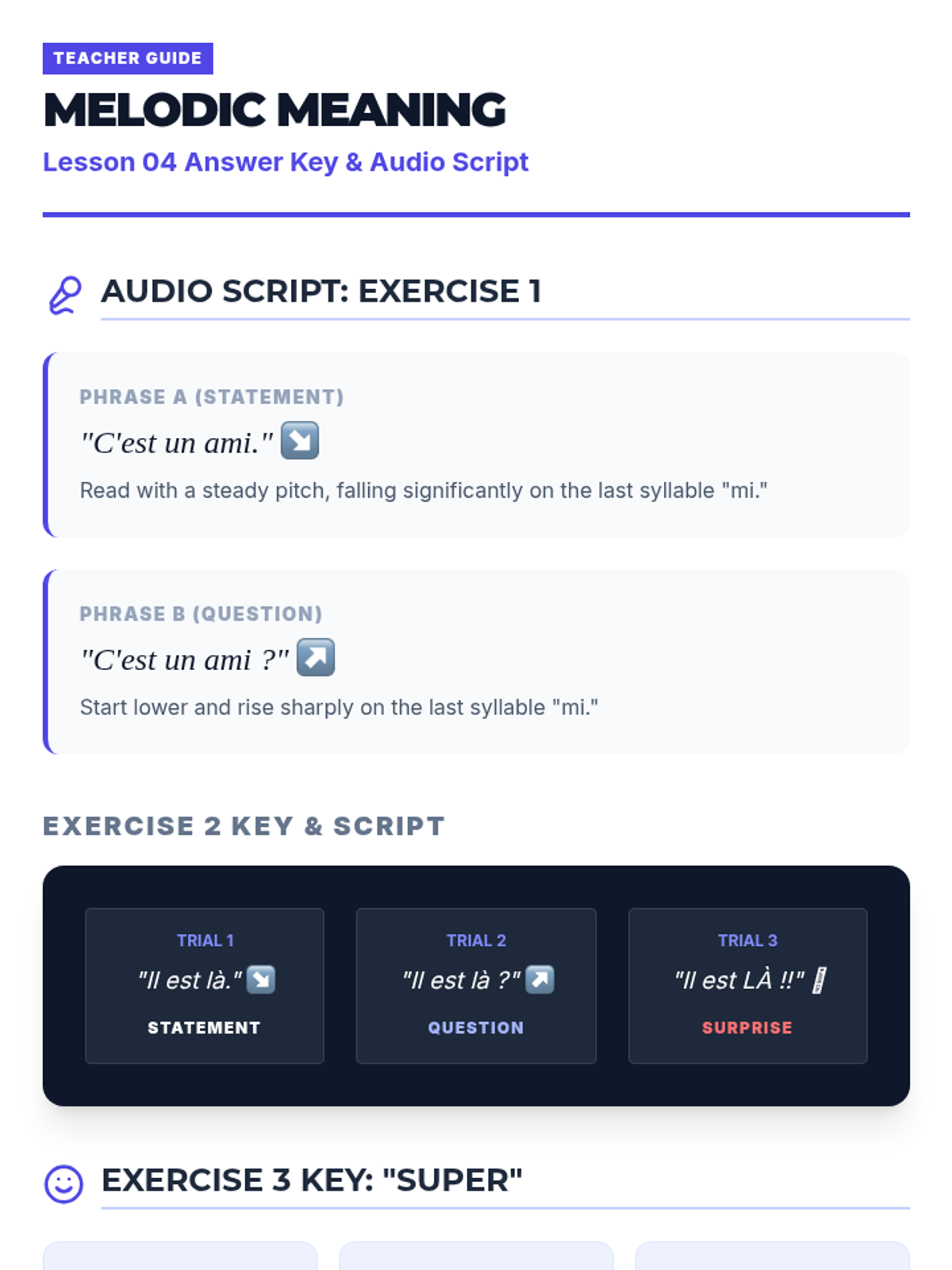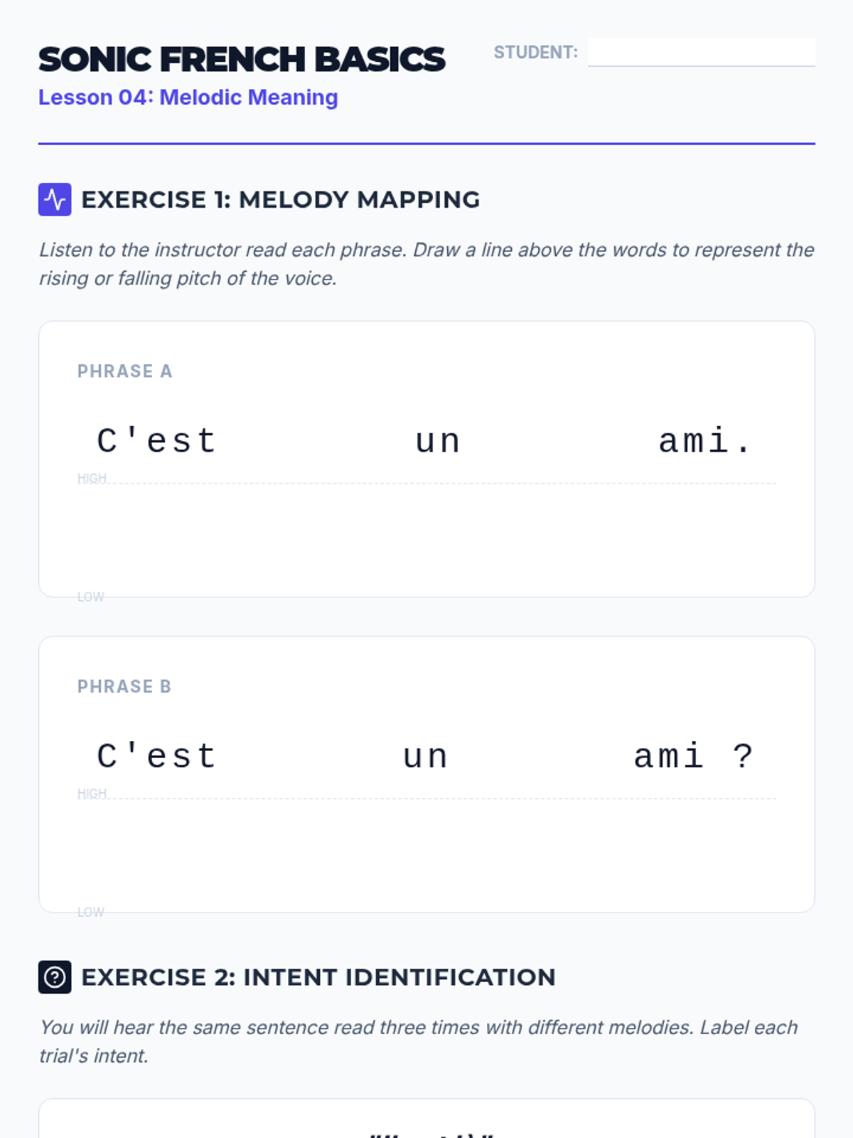 Analyzes how pitch and melody convey meaning in French questions, statements, and emotional expressions.