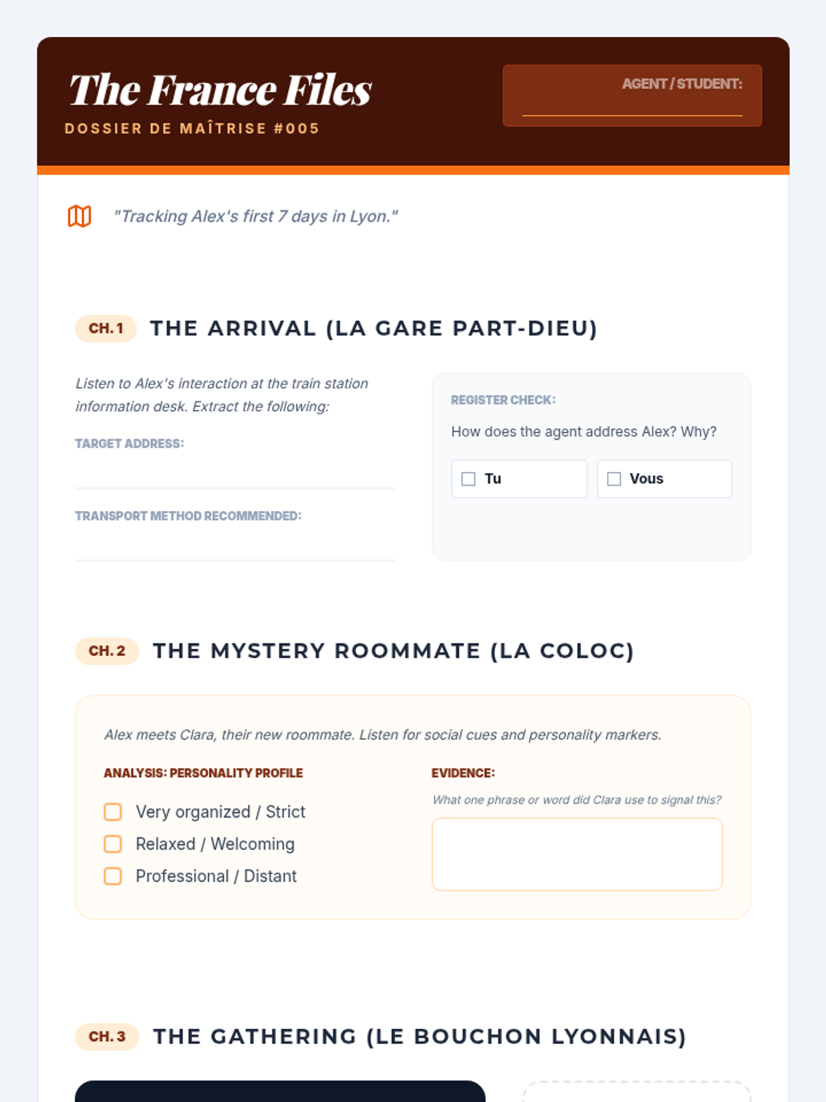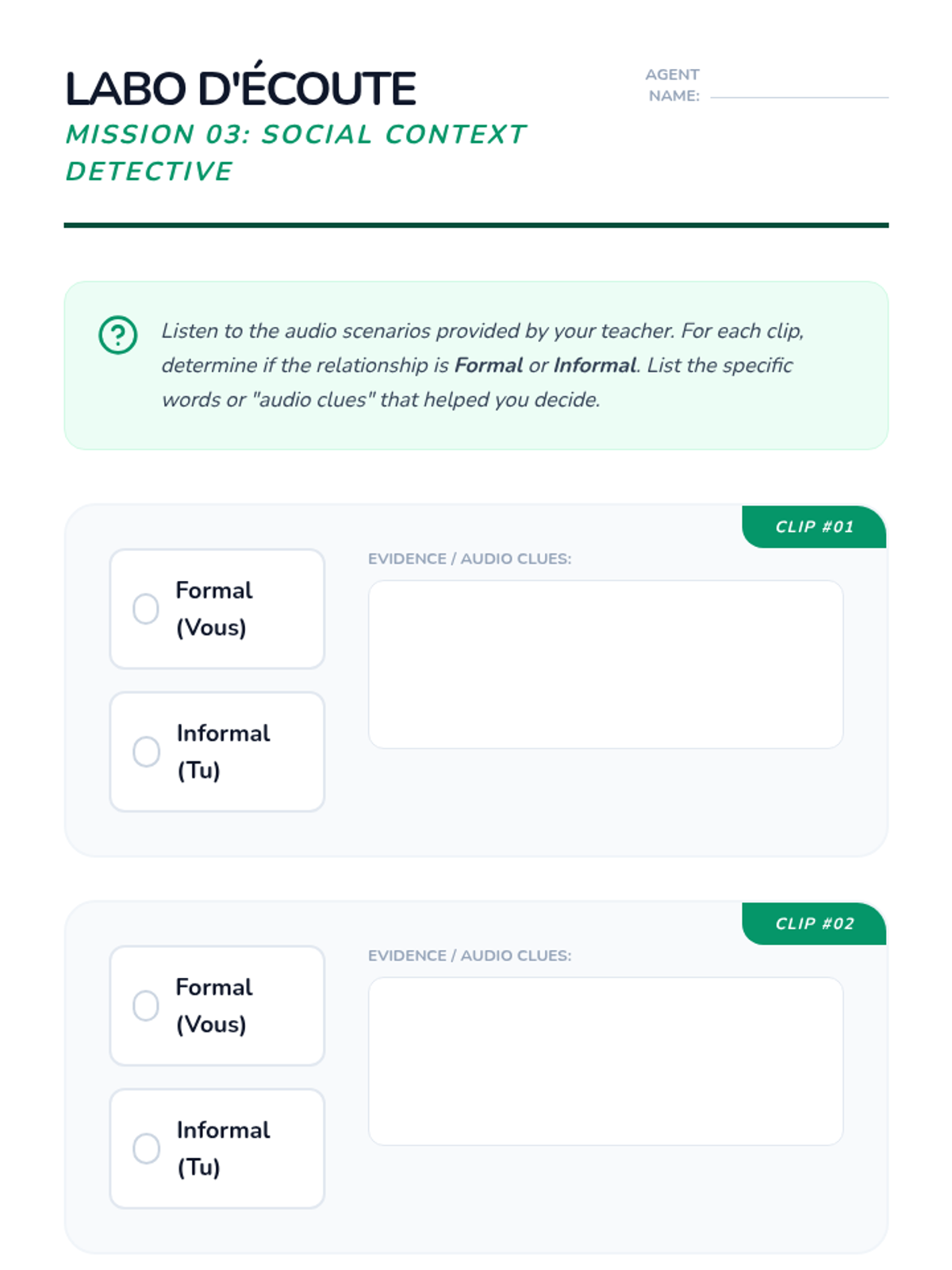 Students analyze audio clips of various social interactions to detect the use of 'tu' versus 'vous' and formal versus informal greetings.