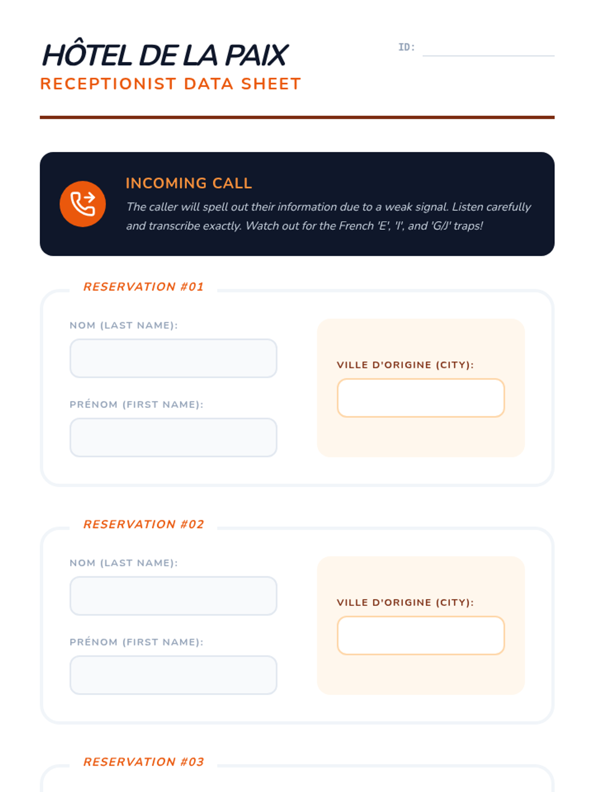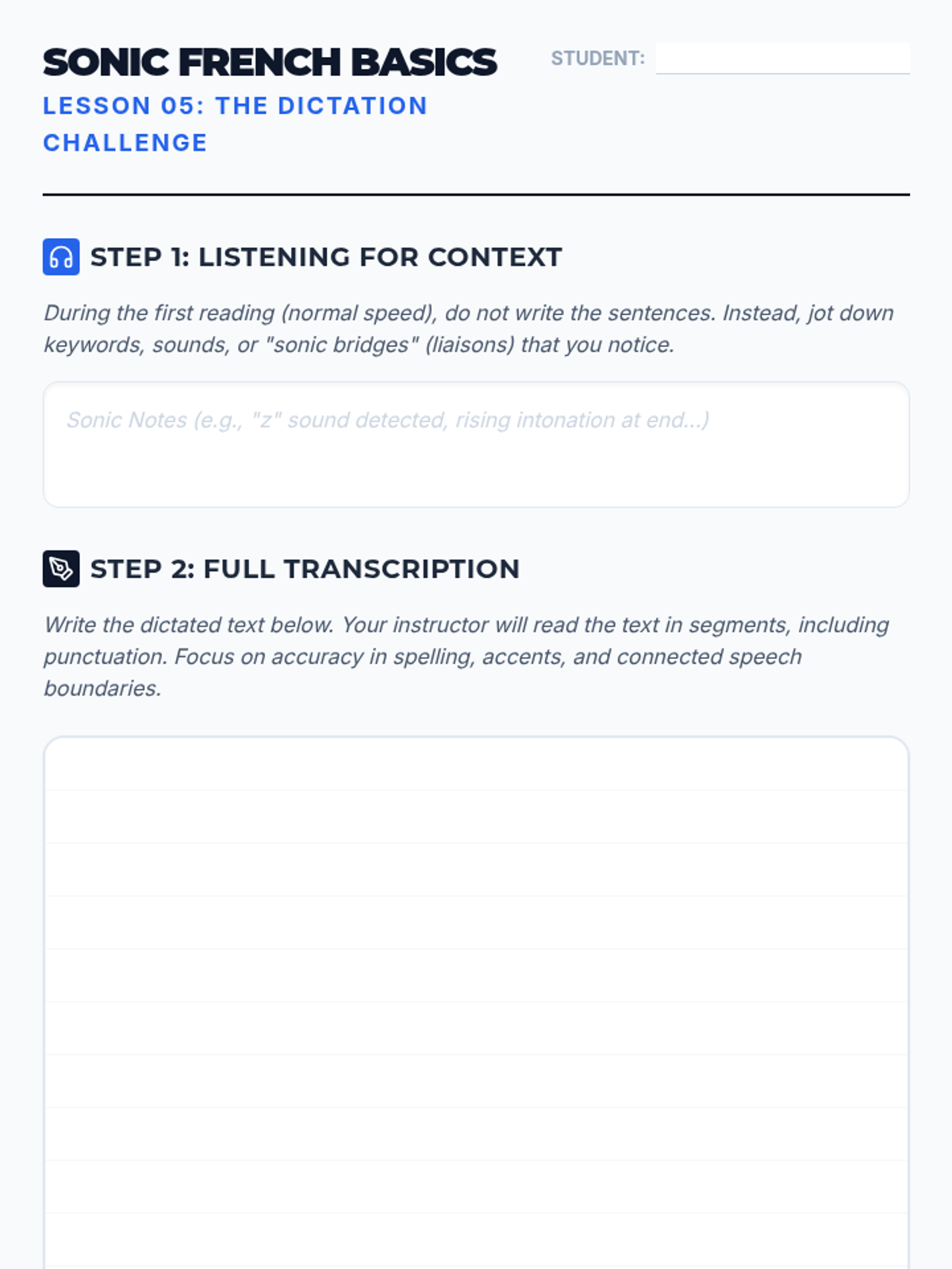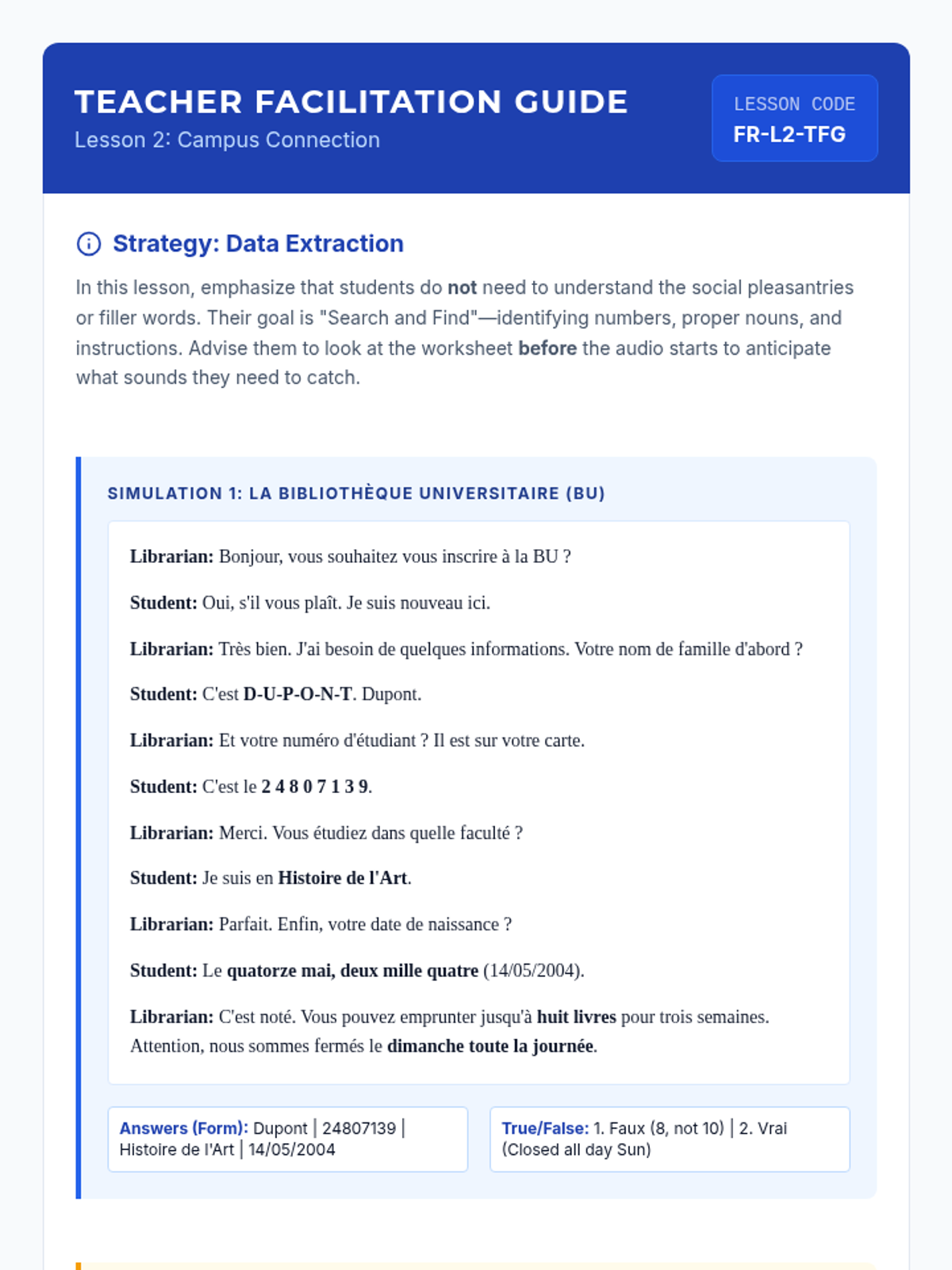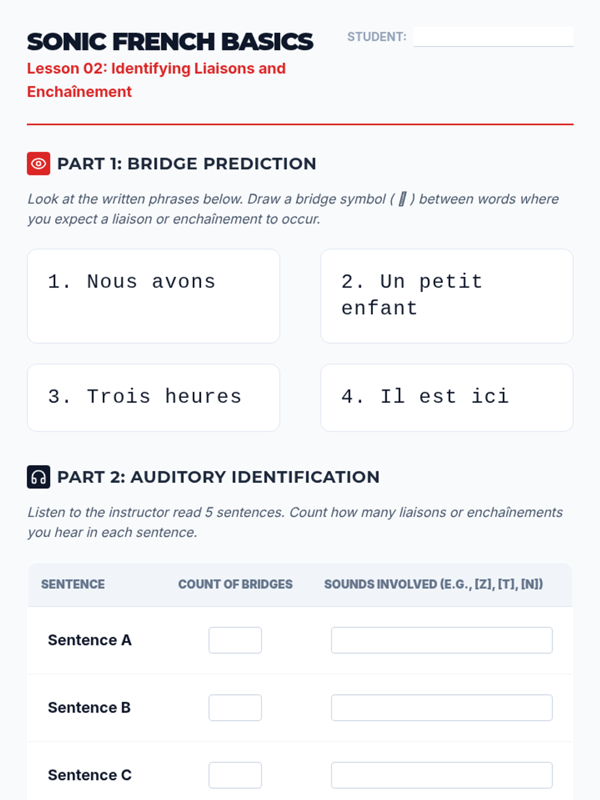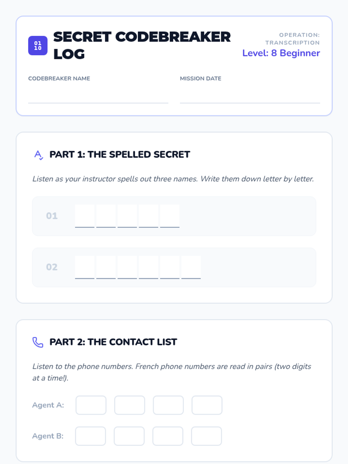 Students apply their phonetic skills to native-speed introductory phrases, practicing information extraction and filtering for key data points.