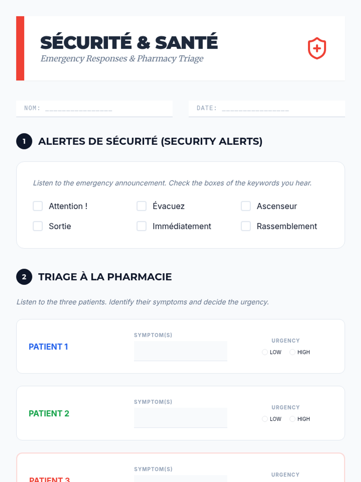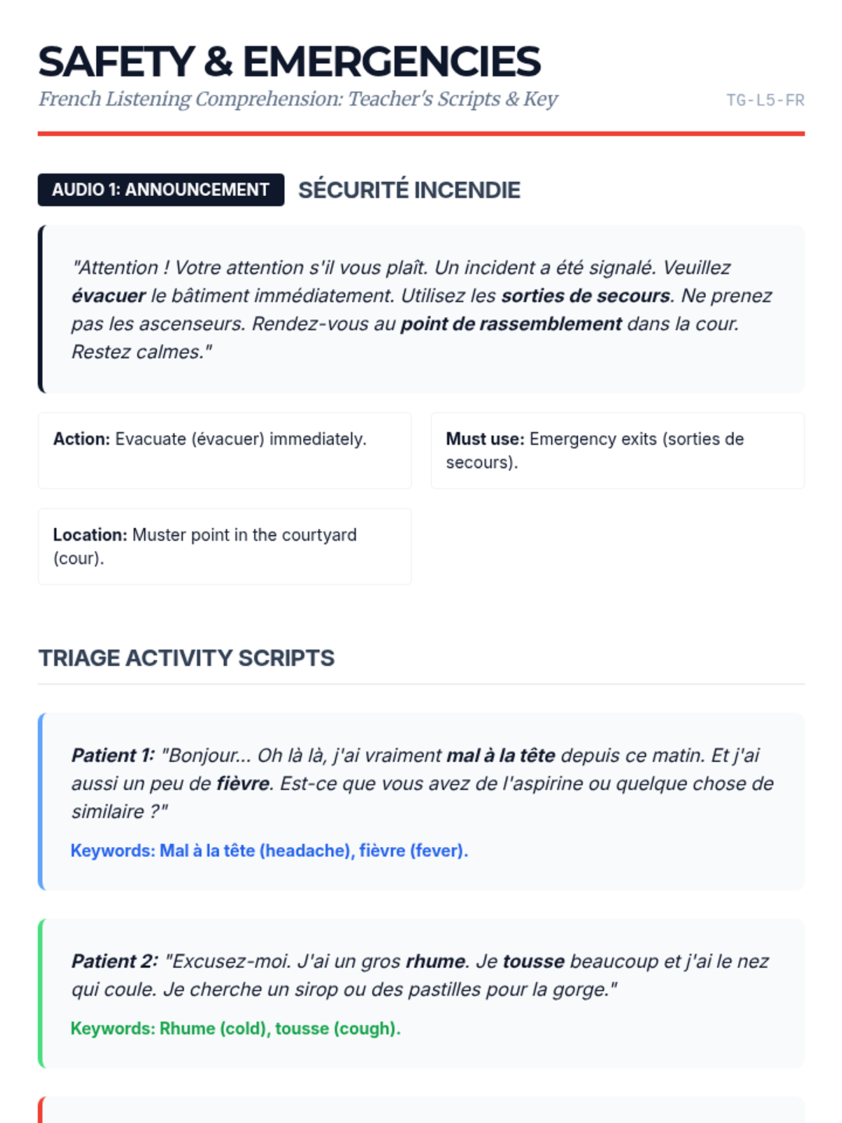 Students identify keywords in simulated emergency announcements and pharmacy interactions. The focus is on urgency assessment and health-related vocabulary for travel safety.