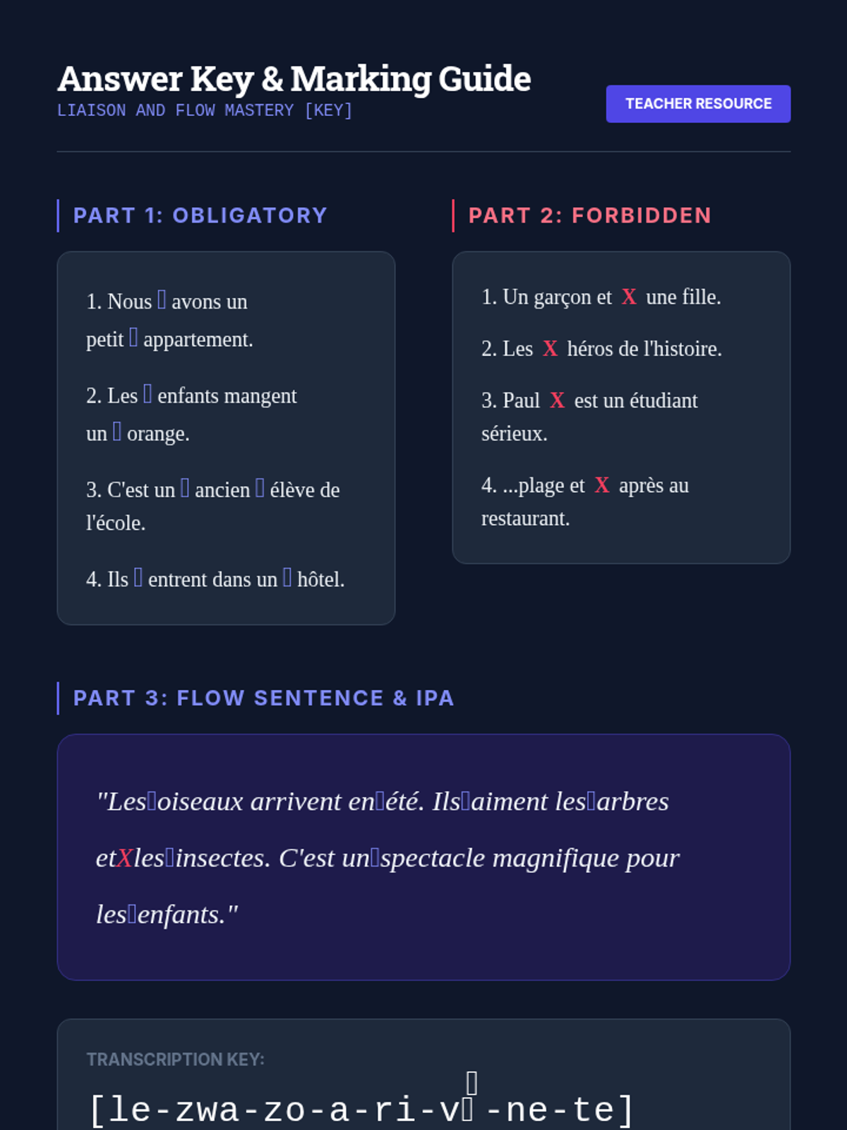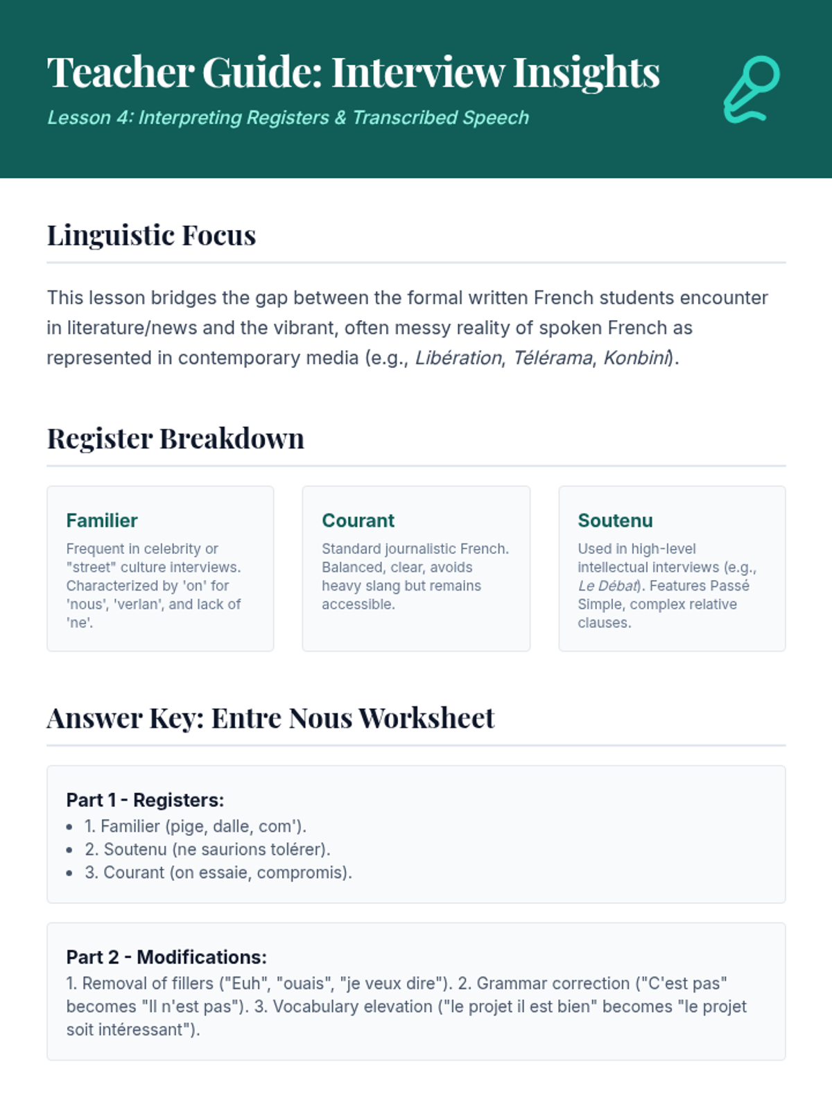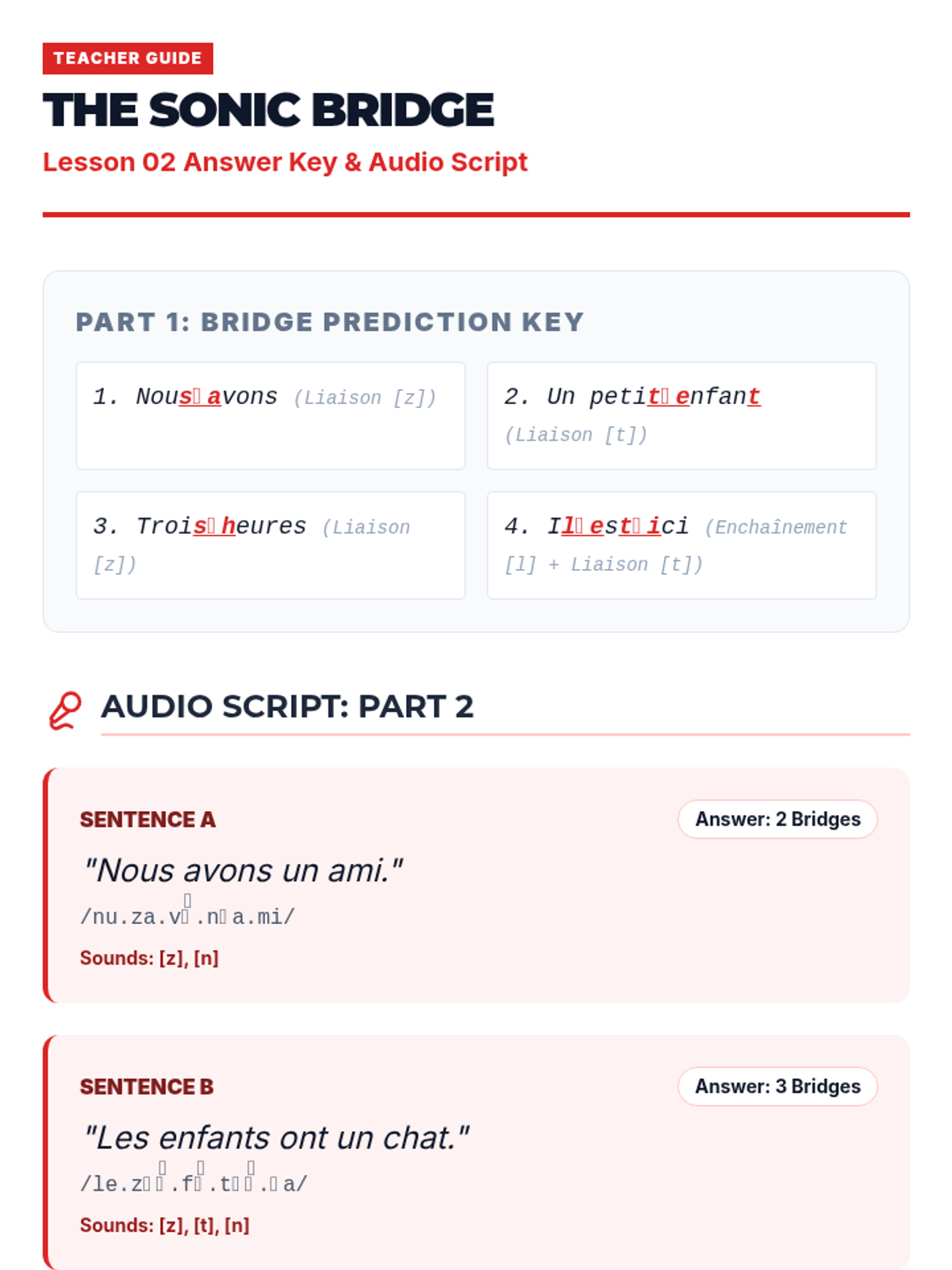 Explores connected speech through liaisons and enchaînement, teaching students to identify word boundaries in fluid speech.