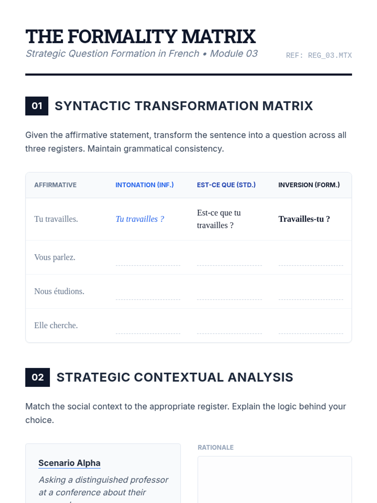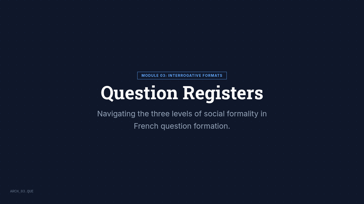 Explores the three registers of question formation in French and the social contexts that dictate their use.