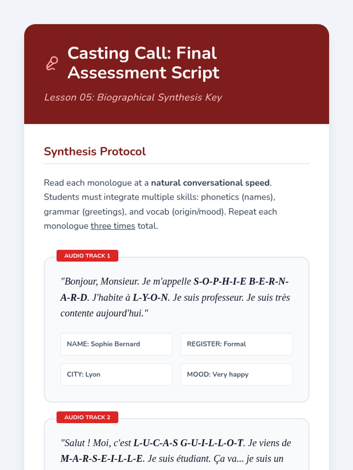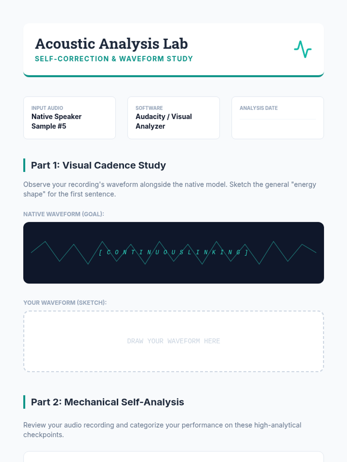 The culmination of the sequence where students use shadowing techniques to internalize native speed. They perform a final reading assessment and conduct a self-analysis of their recording.