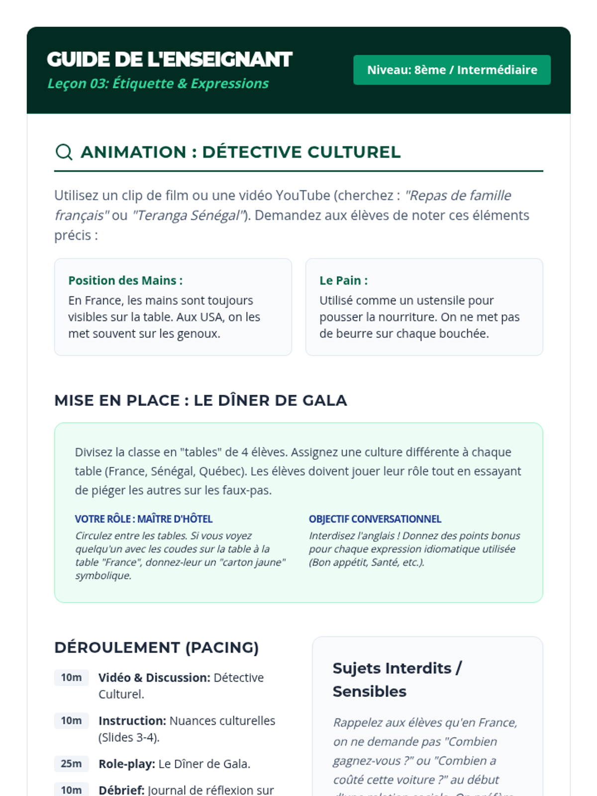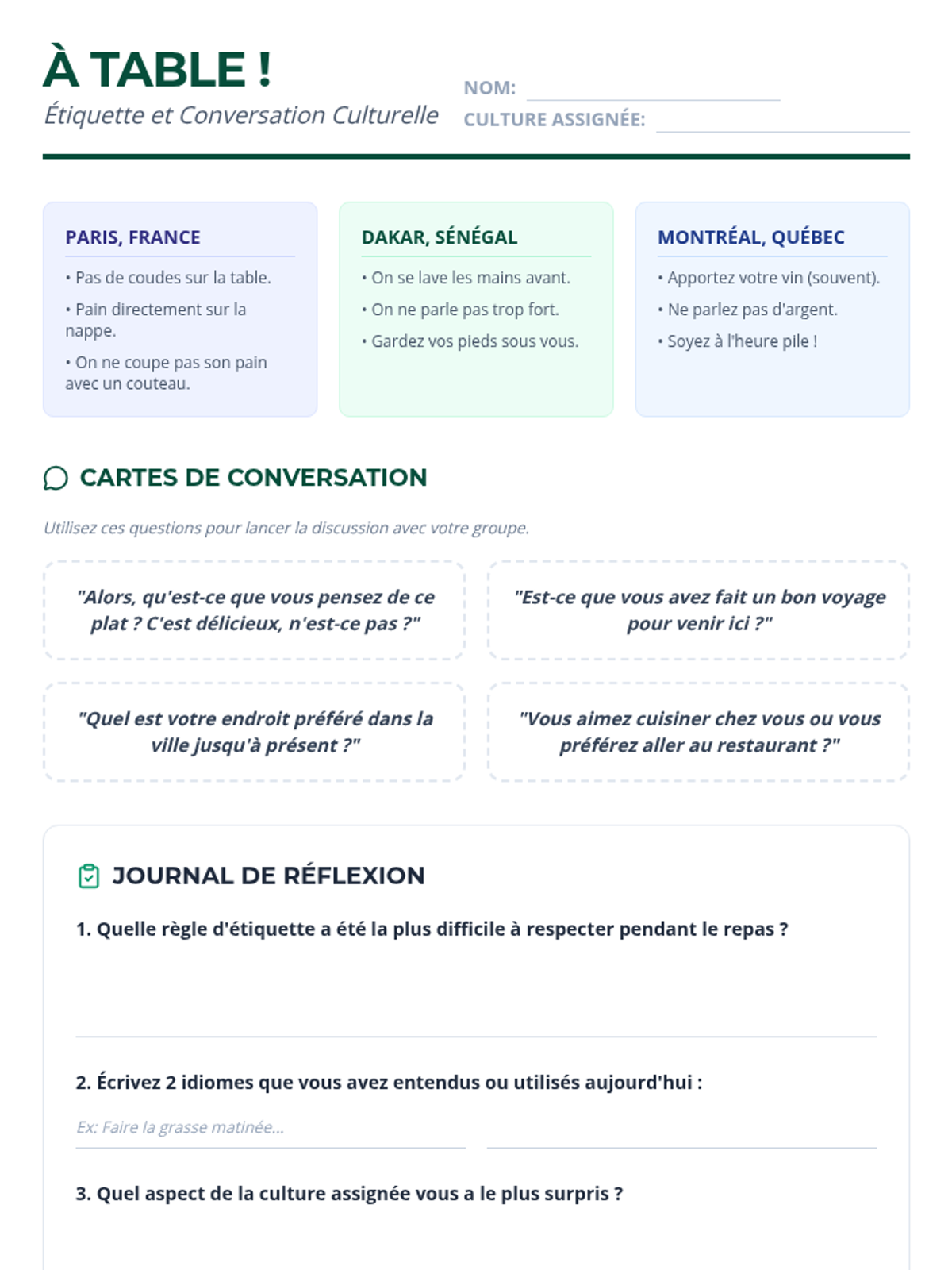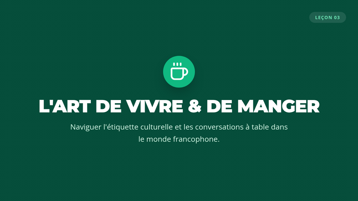Students explore dining etiquette and social norms across the Francophone world, practicing idiomatic expressions and conversational maintenance.