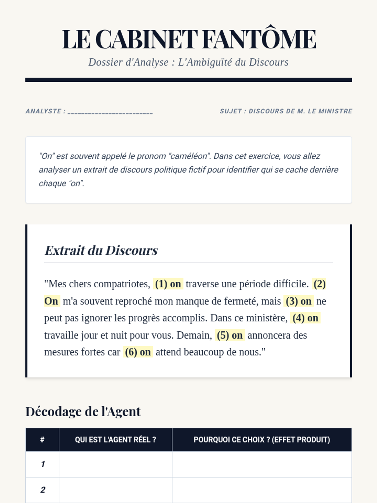 Students explore the versatility of 'on' to replace 'nous', 'les gens', or a passive construction. They discuss the ambiguity of 'on' in political speech.