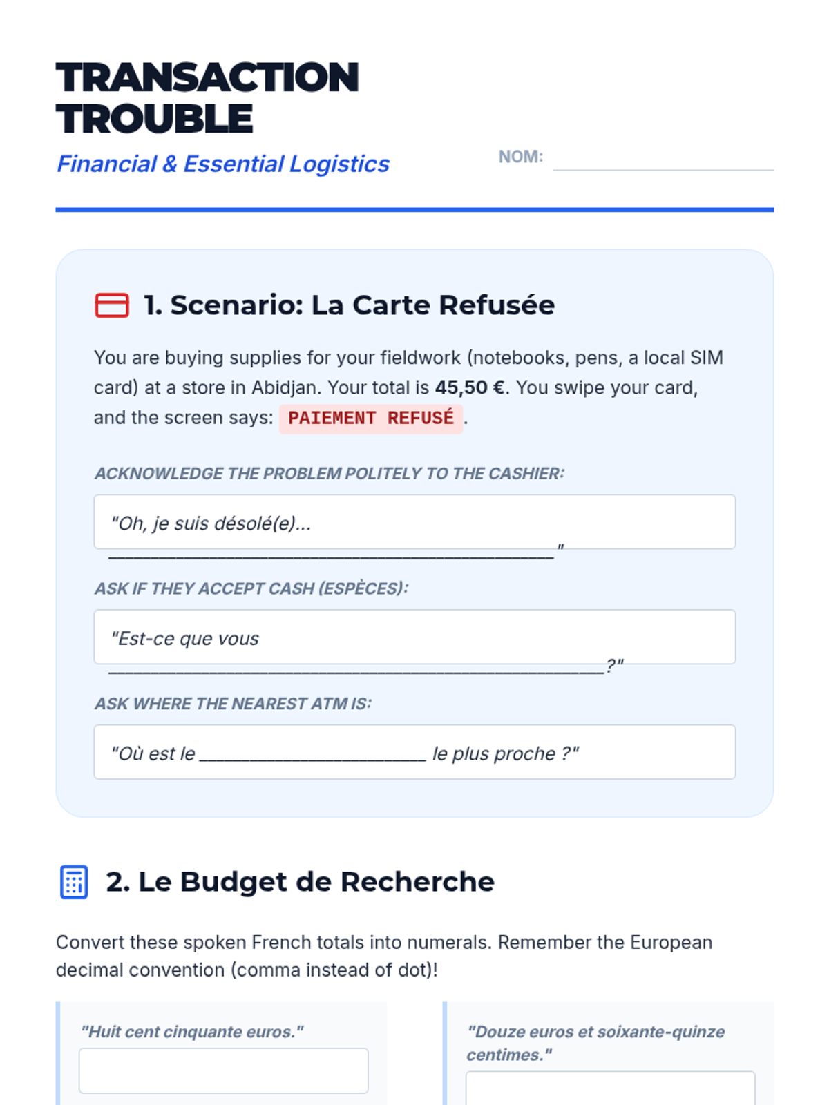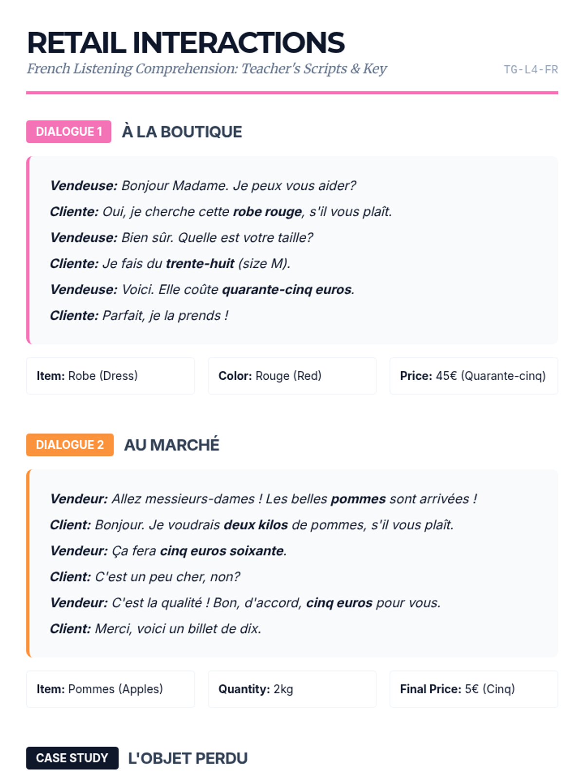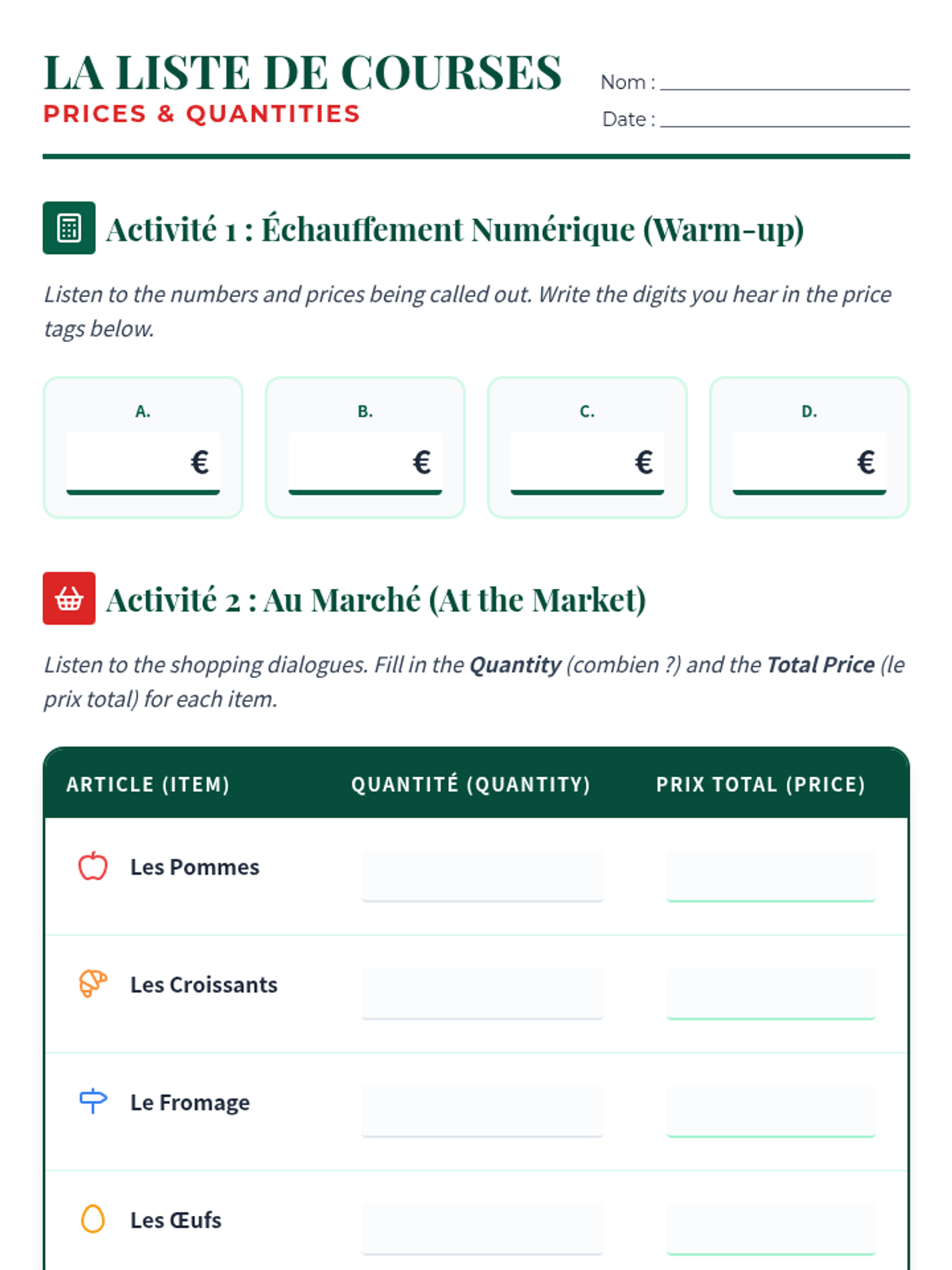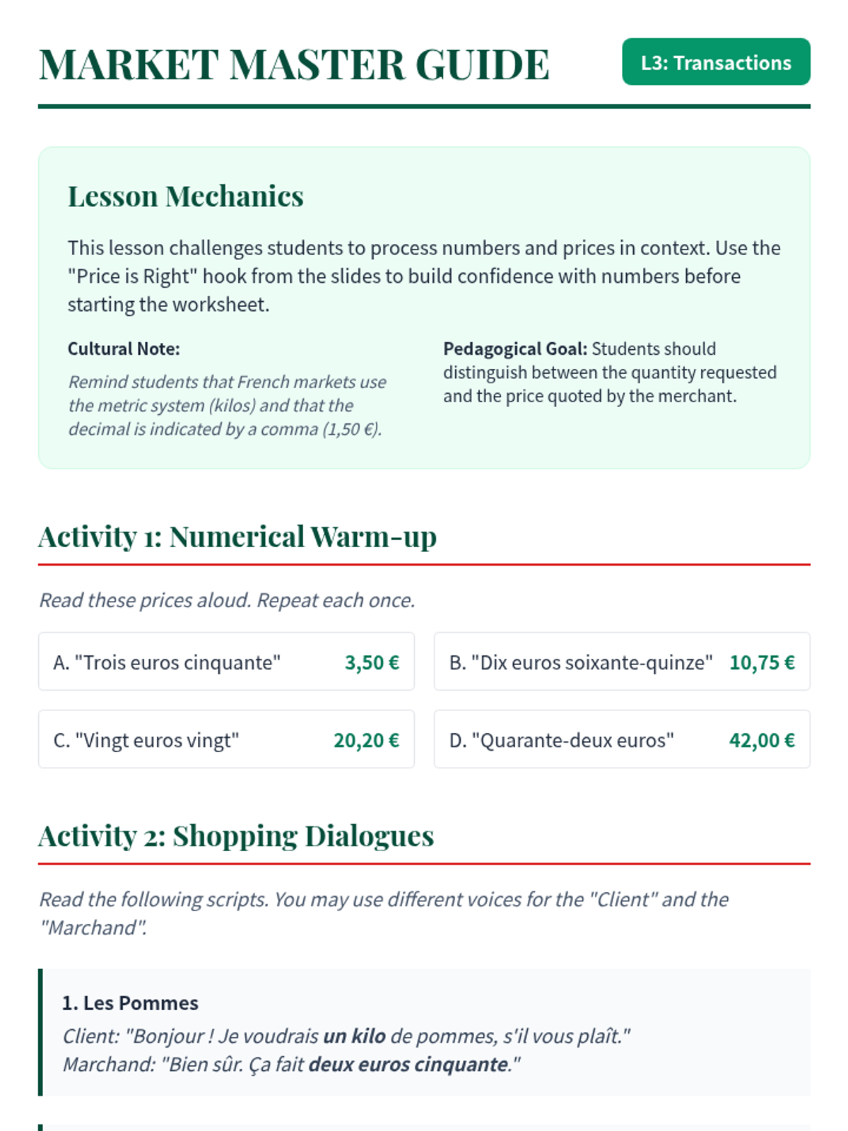 This lesson focuses on transactional listening, specifically hearing prices (using Euros) and quantities. Students listen to shopping dialogues and record the cost of items and the amount purchased.