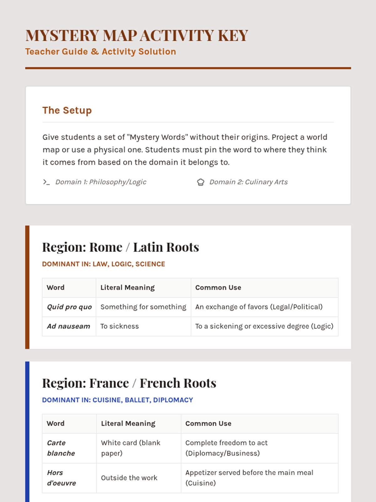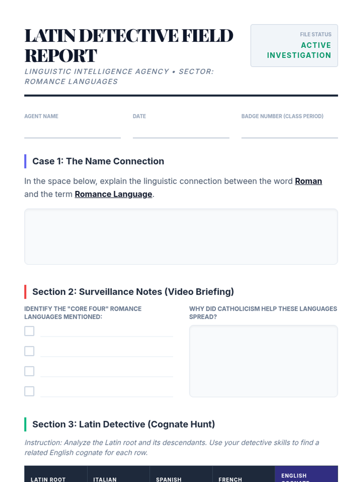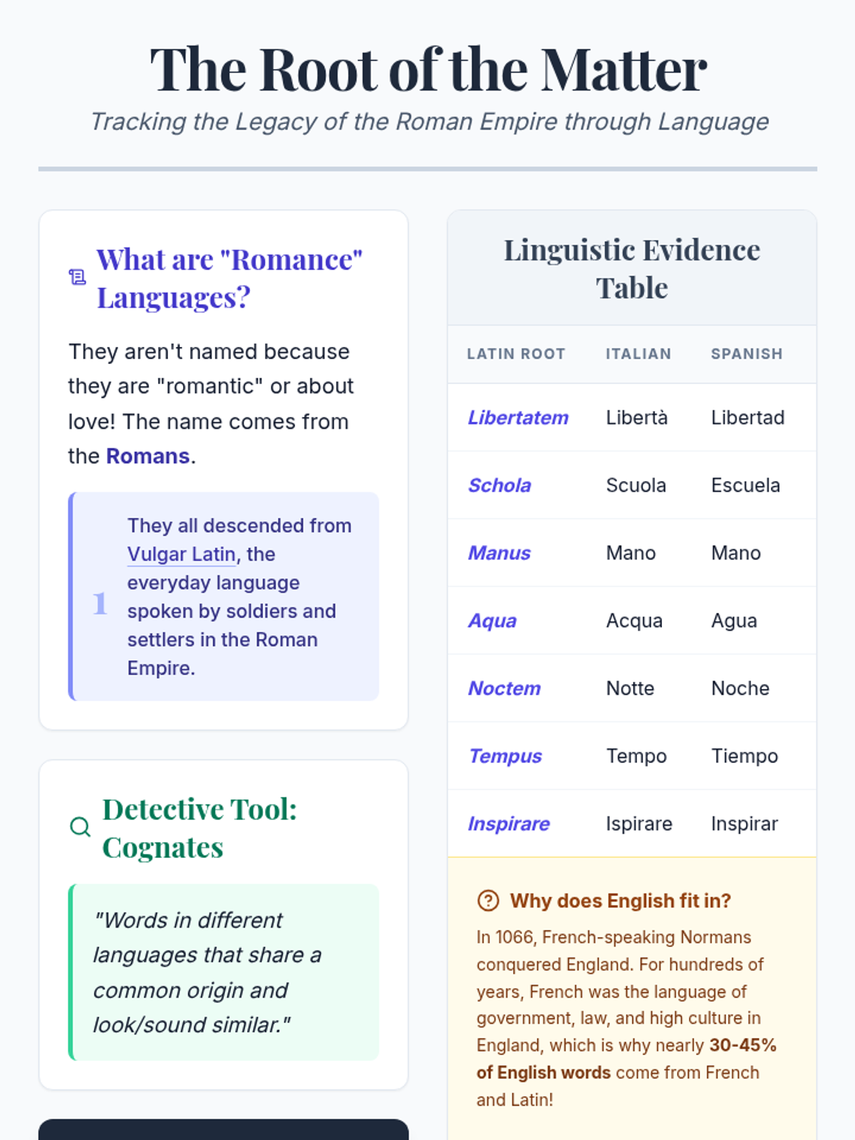 A lesson exploring the linguistic connections between Latin, Romance languages, and English through the lens of 'linguistic detective work.' Students identify cognates and understand the historical influence of the Roman Empire on modern speech.